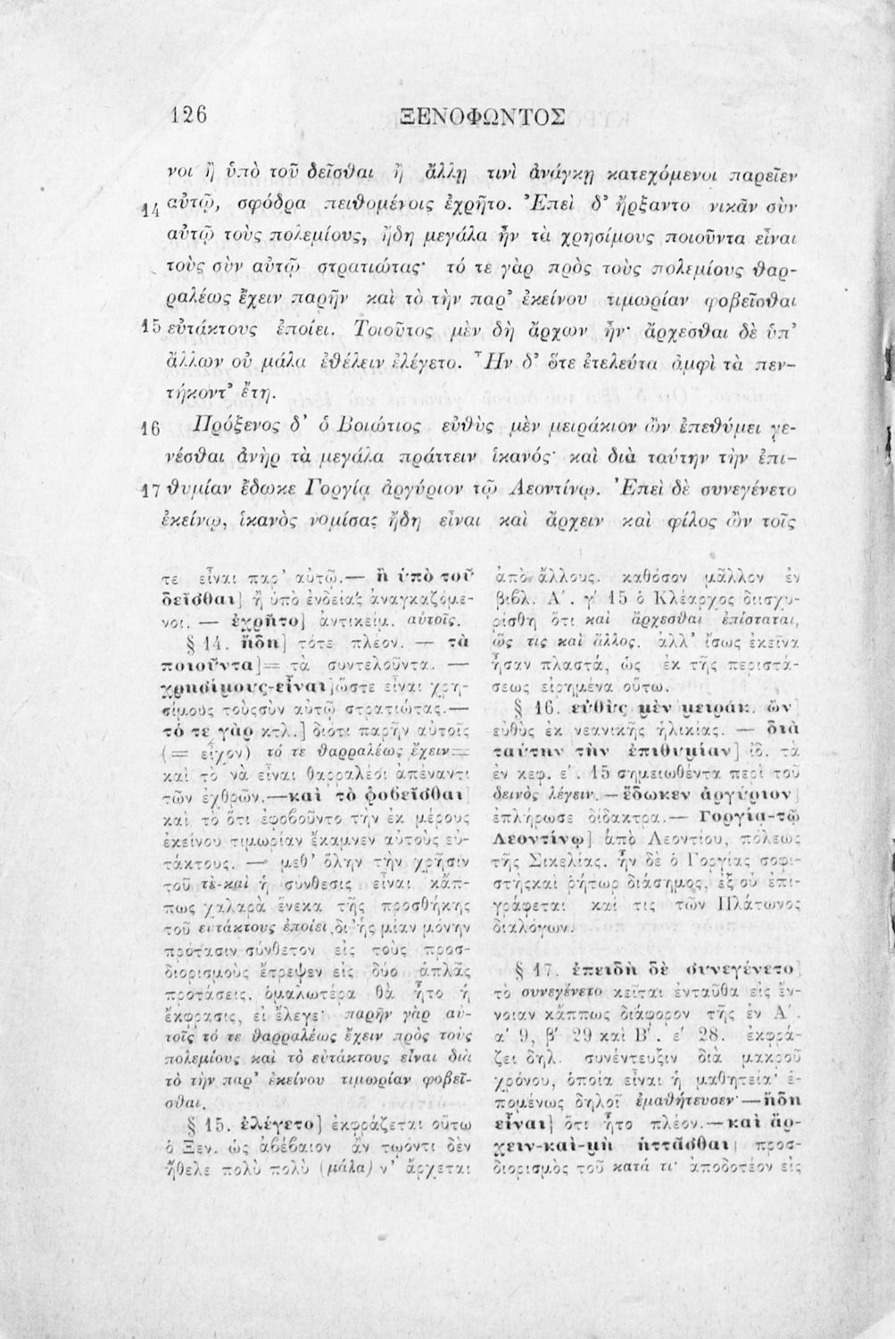 Μαθητικό βοήθημα Αρχαίων Ελληνικών για τα Ελληνικά Σχολεία και Παρθεναγωγεία που περιέχει αποσπάσματα από τα έργα του Ξενοφώντα Ελληνικά (βιβλία Α΄ έως Δ΄ ) σημειώσεις και ερμηνευτικά σχόλια.