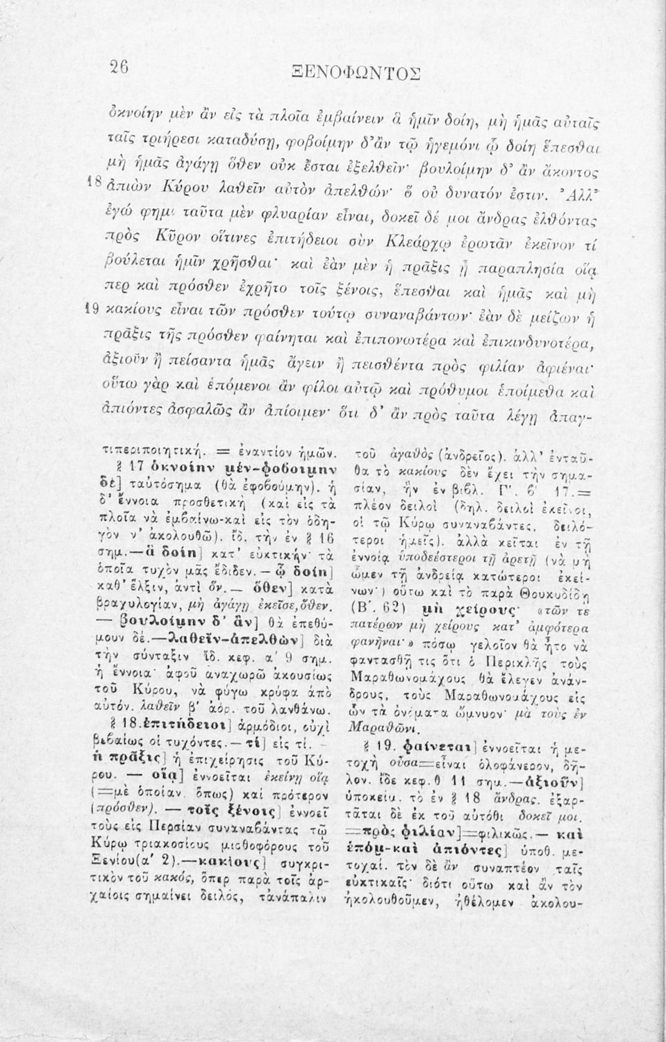 Σχολικό εγχειρίδιο Αρχαίων Ελληνικών για τα Ελληνικά Σχολεία και Παρθεναγωγεία που περιλαμβάνει αποσπάσματα από το έργο του Ξενοφώντα Κύρου Ανάβασις, εισαγωγικά σχόλια για τη ζωή και το έργο του, ερμηνευτικές και γραμματικές παρατηρήσεις και λεξικολογικά σχόλια.