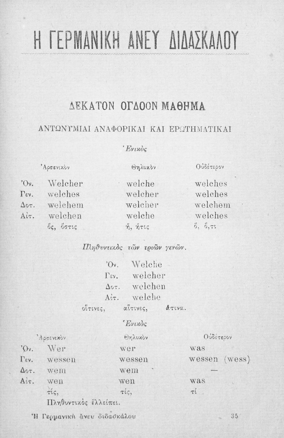 Σχολικό εγχειρίδιο Γ΄ και Δ΄ Δημοτικού που περιέχει τη γραμματικής της νέας ελληνικής. Την έκδοση επιμελήθηκε ο Γ. Λογοθέτης, τέως διευθυντής του επταταξίου δημ. Τμήμ.της Ευαγγελικής Σχολής.