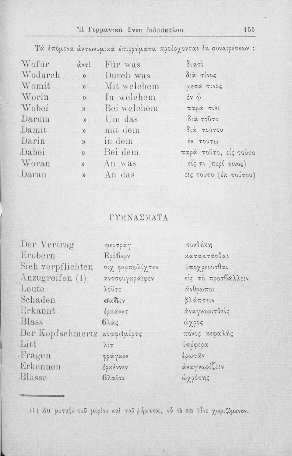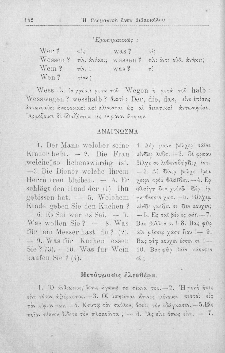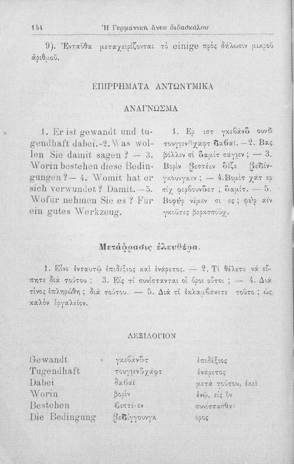 Πρόκειται για εγχειρίδιο που στόχο είχε την εκμάθηση, μέσω της μεθόδου της αυτοδιδασκαλίας κατά το σύστημα Traut-Berlitz-Dr Wogasli, των γραμματικών και συντακτικών φαινομένων της Γερμανικής γλώσσας σε ...
