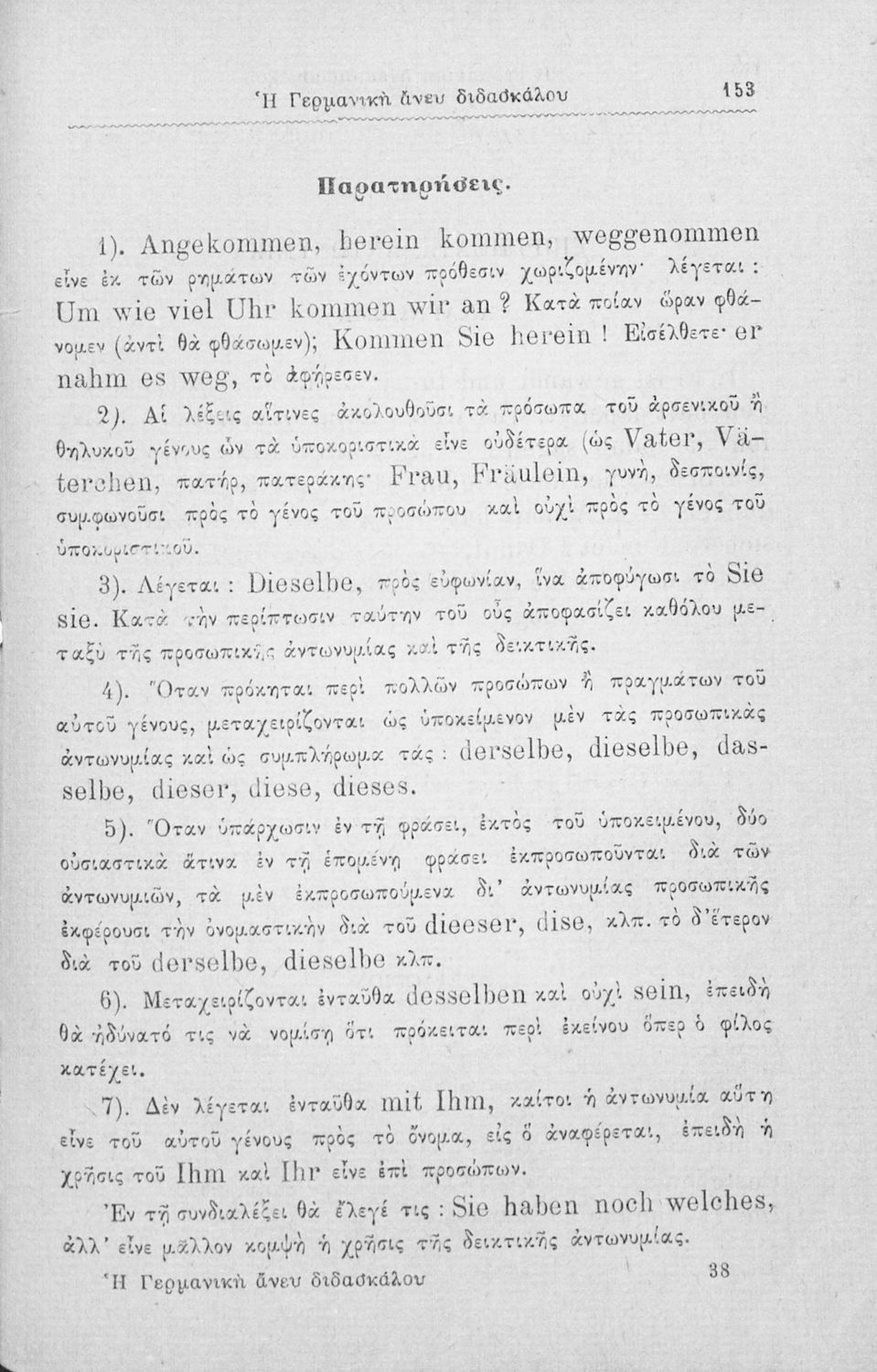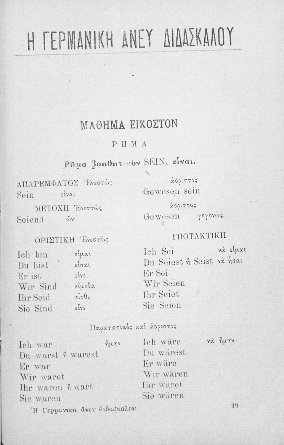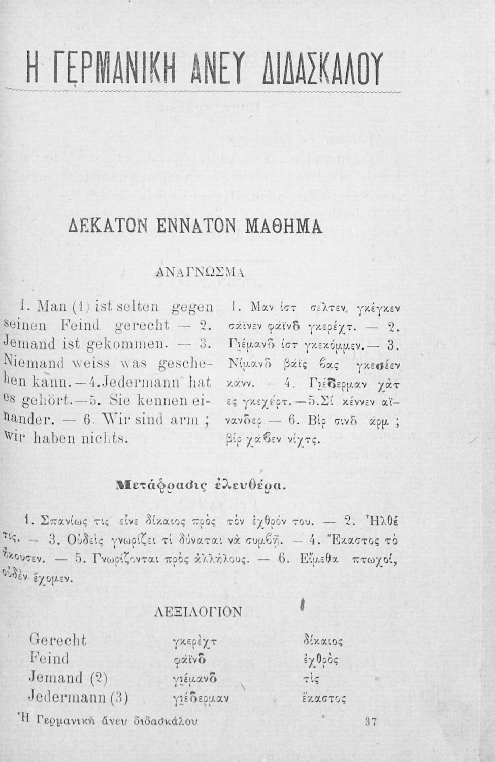 Πρόκειται για εγχειρίδιο που στόχο έχει την εκμάθηση της γερμανικής γλώσσας άνευ διδασκάλου. Το βιβλίο χωρίζεται σε δύο μέρη. Στο πρώτο μέρος, περιλαμβάνει και παρουσιάζει τα διάφορα μέρη του λόγου, τη σωστή ...