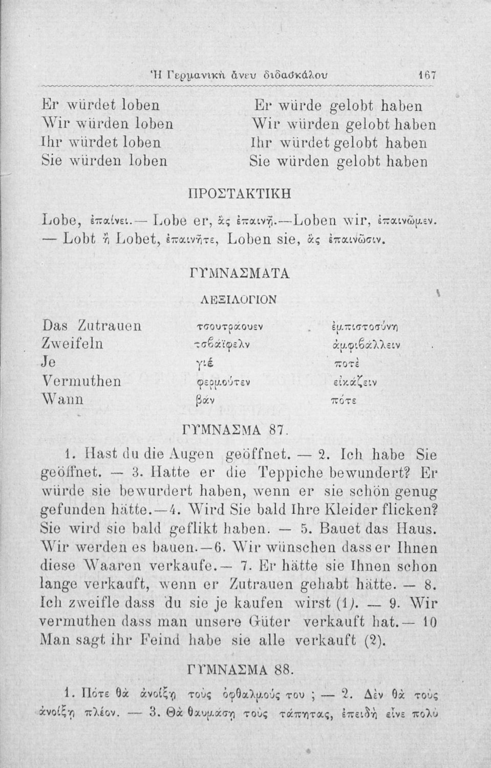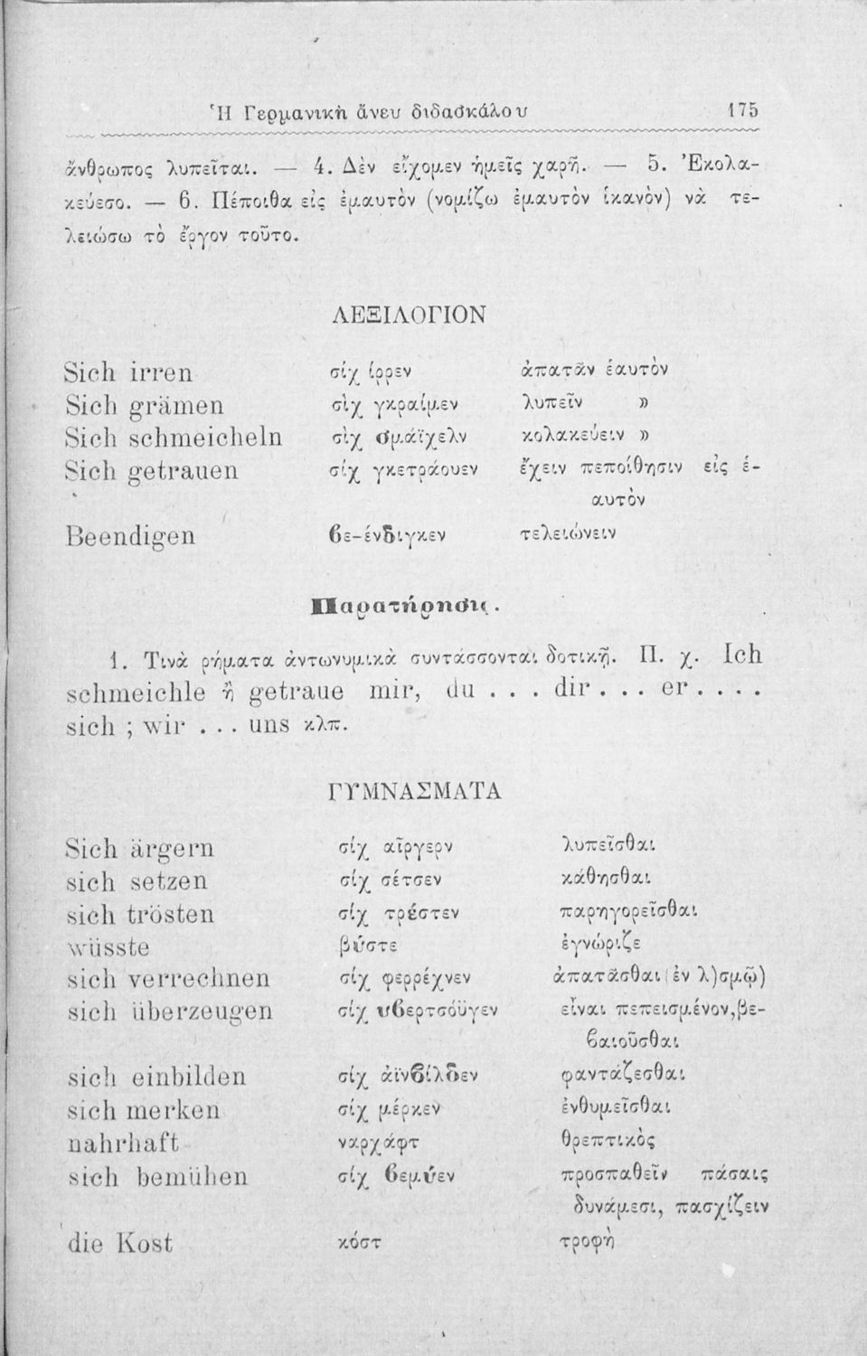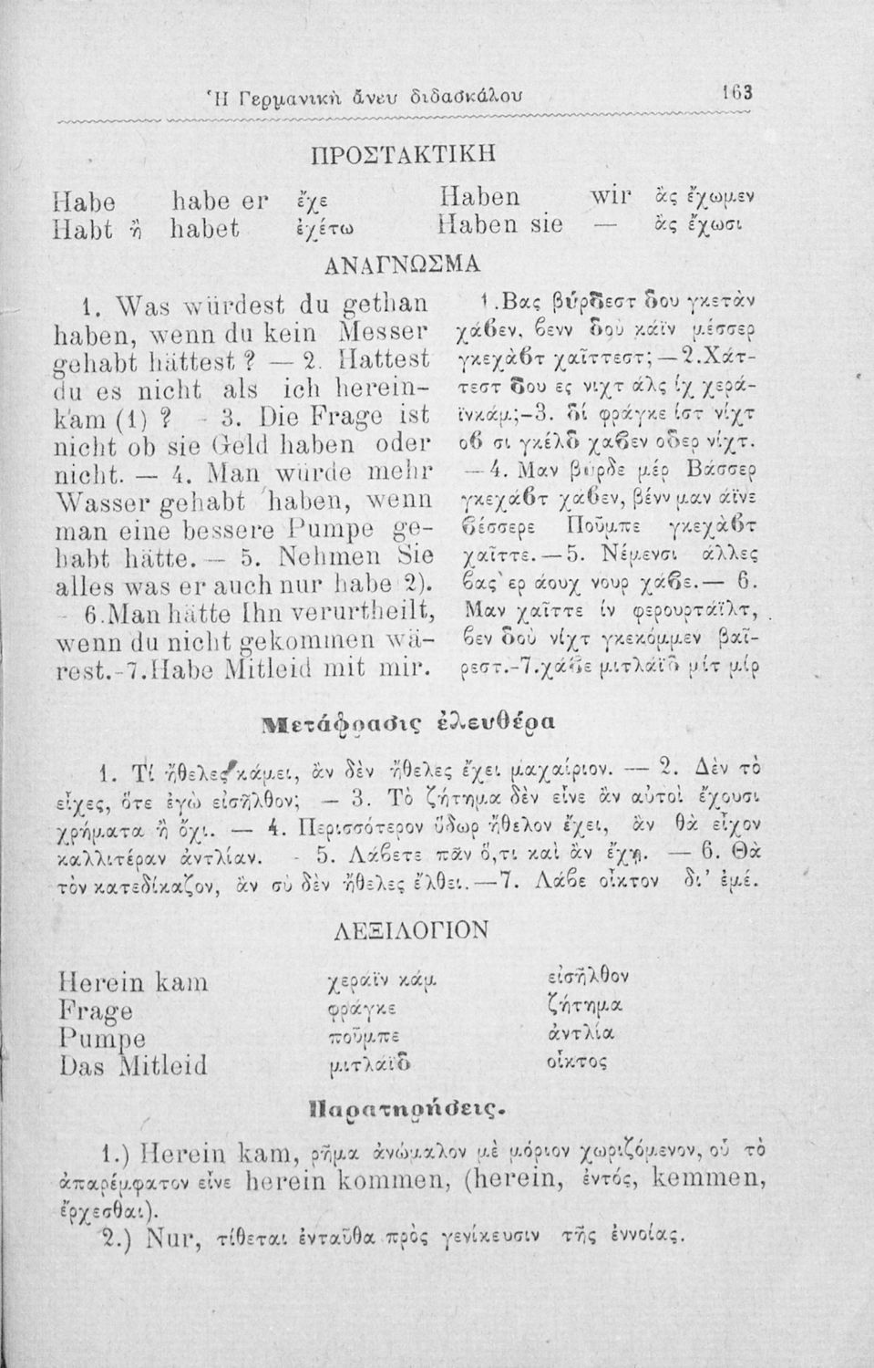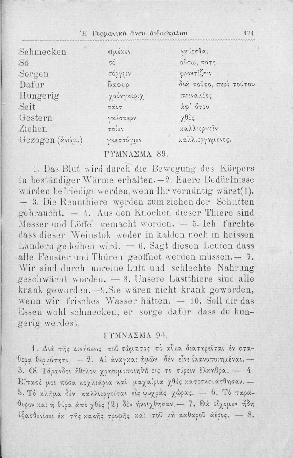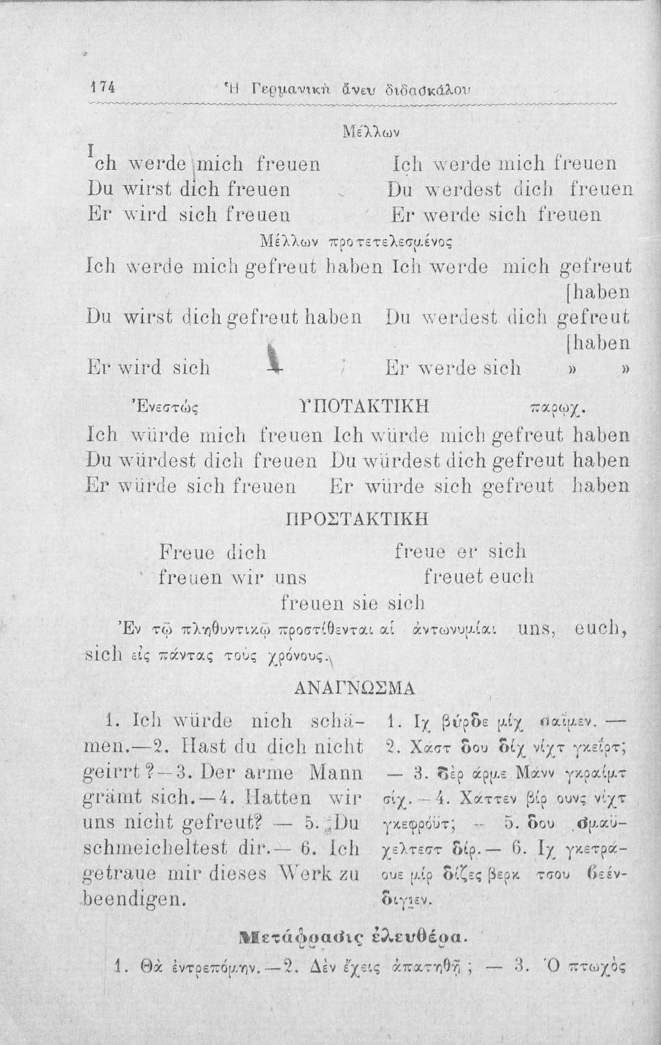 Πρόκειται για εγχειρίδιο που στόχο έχει την εκμάθηση της γερμανικής γλώσσας άνευ διδασκάλου. Το βιβλίο χωρίζεται σε δύο μέρη. Στο πρώτο μέρος, περιλαμβάνει και παρουσιάζει τα διάφορα μέρη του λόγου, τη σωστή ...