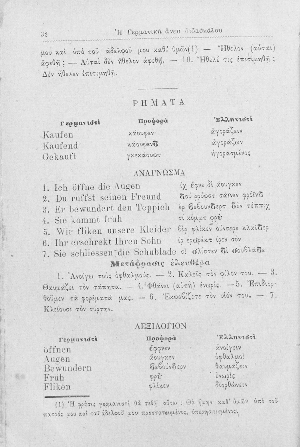 Πρόκειται για εγχειρίδιο που στόχο είχε την εκμάθηση, μέσω της μεθόδου της αυτοδιδασκαλίας κατά το σύστημα Traut-Berlitz-Dr Wogasli, των γραμματικών και συντακτικών φαινομένων της Γερμανικής γλώσσας σε ...