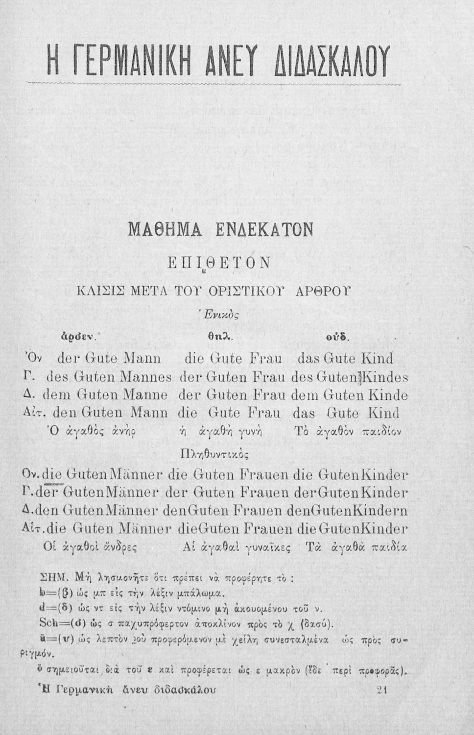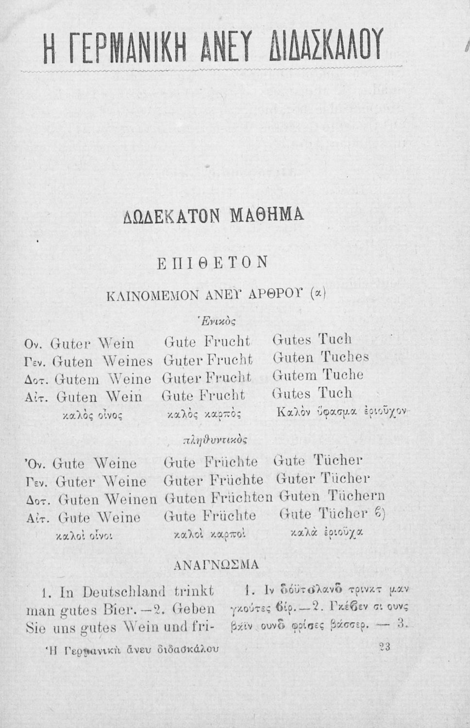 Πρόκειται για εγχειρίδιο που στόχο έχει την εκμάθηση της γερμανικής γλώσσας άνευ διδασκάλου. Το βιβλίο χωρίζεται σε δύο μέρη. Στο πρώτο μέρος, περιλαμβάνει και παρουσιάζει τα διάφορα μέρη του λόγου, τη σωστή ...