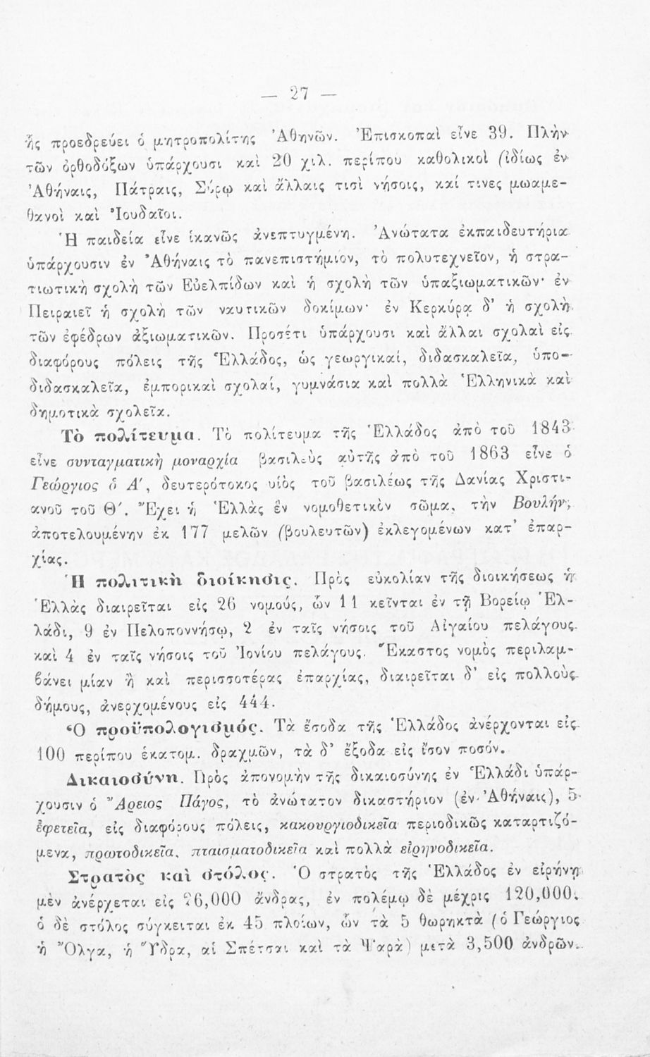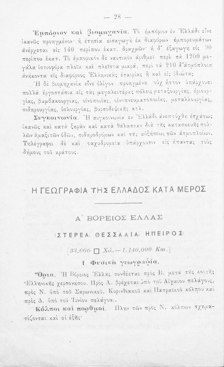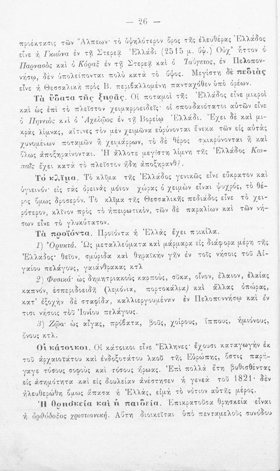 Σχολικό εγχειρίδιο Γεωγραφίας για τους μαθητές των Ελληνικών Σχολείων και Παρθεναγωγείων που περιλαμβάνει μια γενική επισκόπηση της πολιτικής, οικονομικής και φυσικής γεωγραφίας της Ελλάδας και ενδεικτικών ...