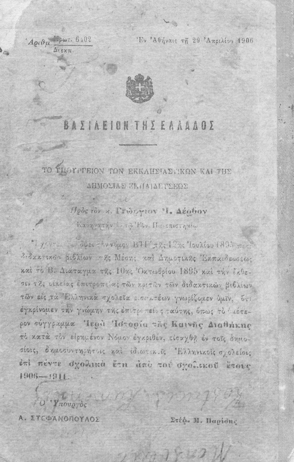 Εκδότης: Τυπογραφείο: Παρ. Λεώνης Έτος έκδοσης: 1906 Τόπος έκδοσης: Αθήνα Έκδοση: 4η Υπουργική απόφαση / Σύμβαση: 6402/29-4-1906 |