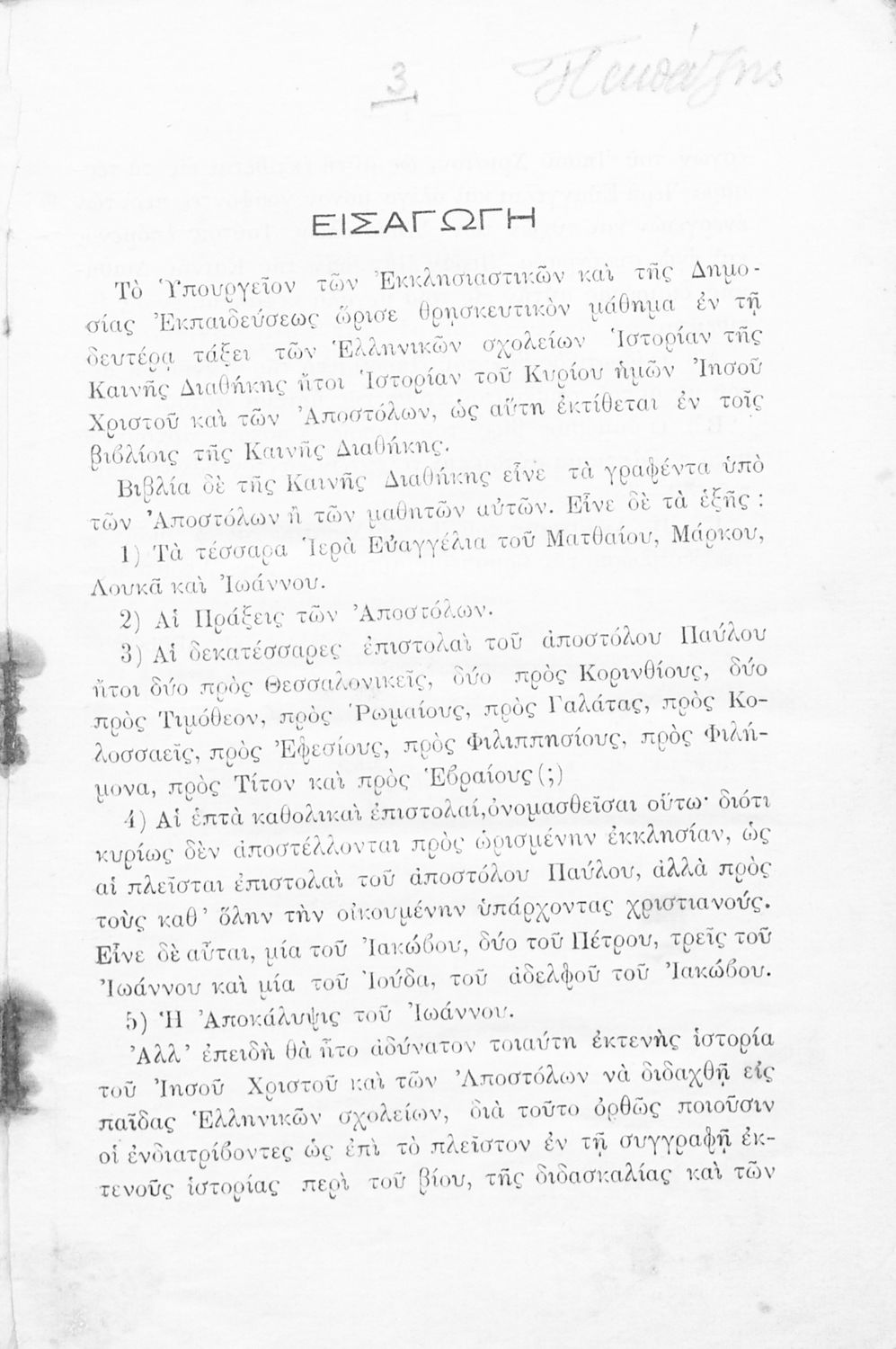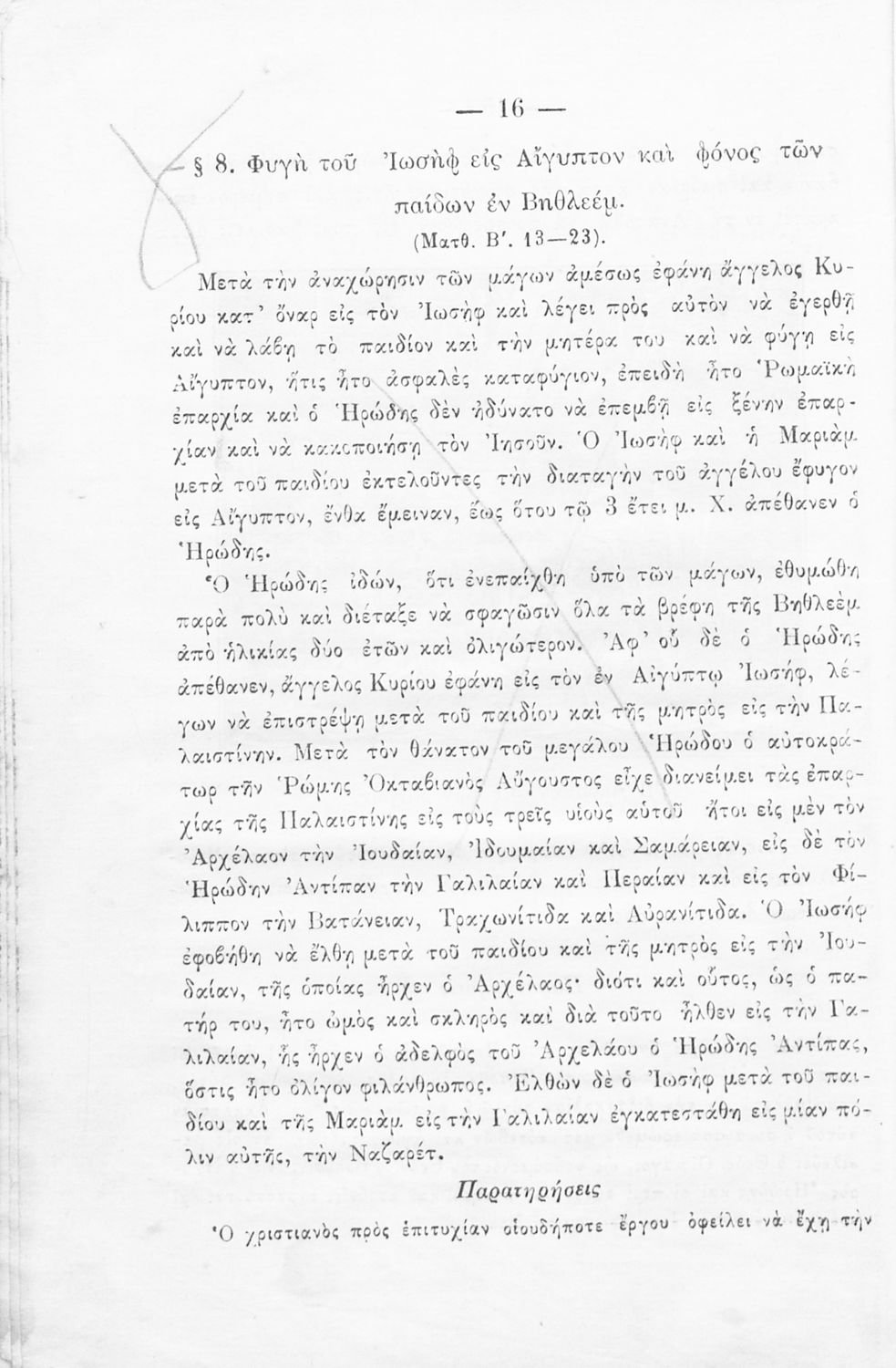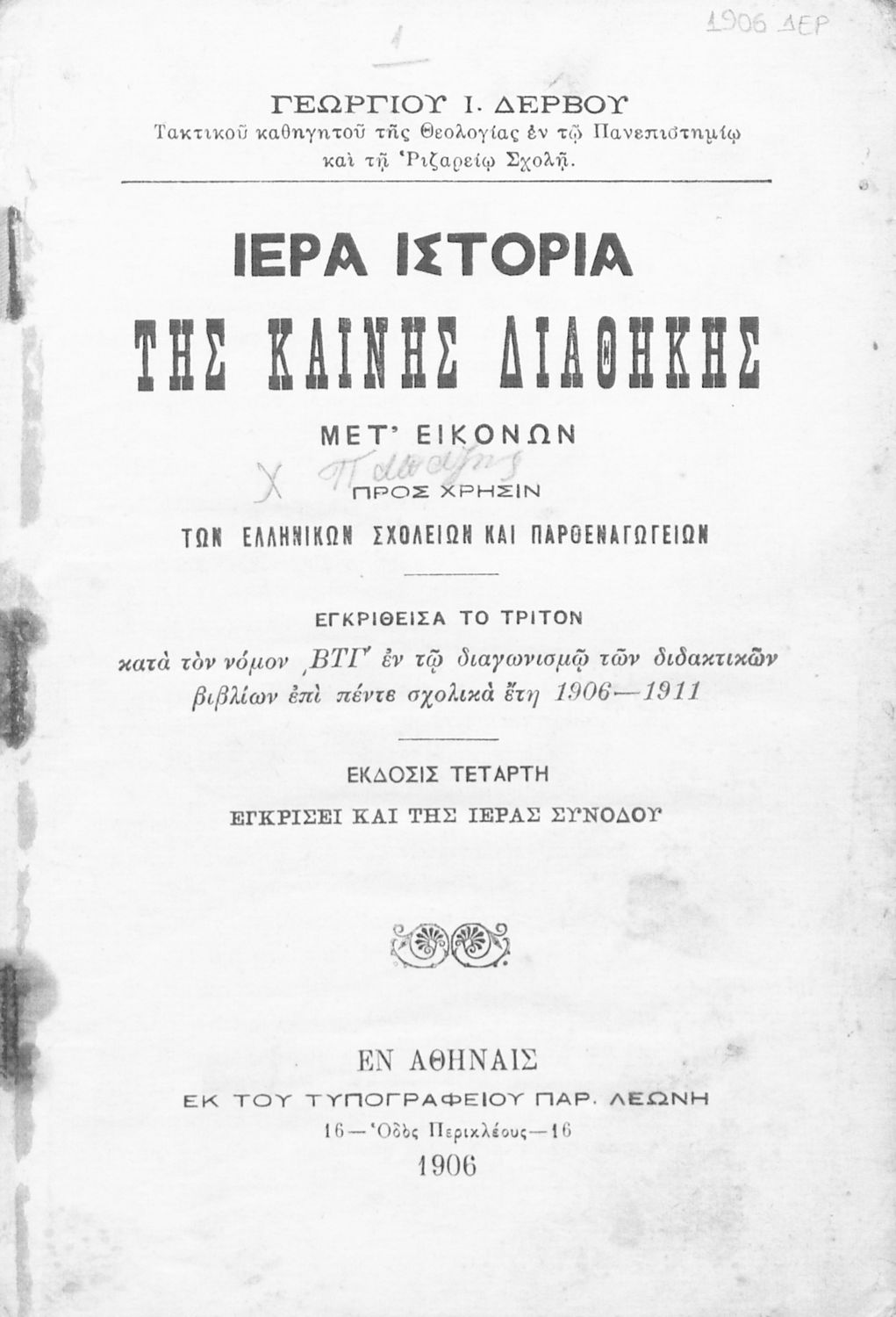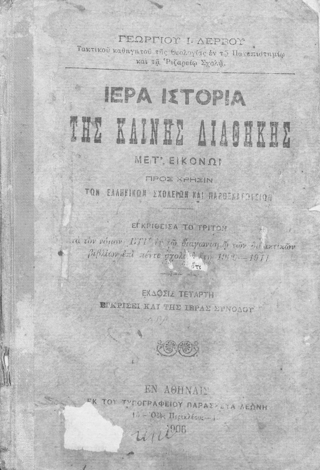 Σχολικό εγχειρίδιο Θρησκευτικών για τα Ελληνικά σχολεία και Παρθεναγωγεία που συνιστά μία εξιστόρηση της Καινής Διαθήκης από τη γέννηση της Θεοτόκου ως την ανάληψη του Χριστού και τη δράση των Αποστόλων.