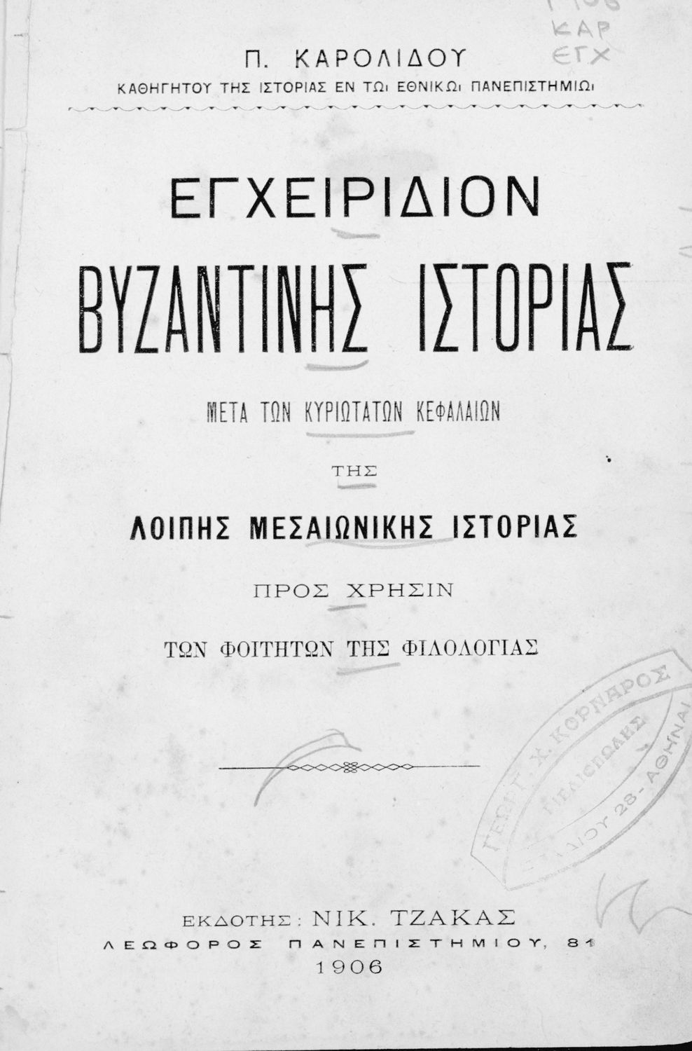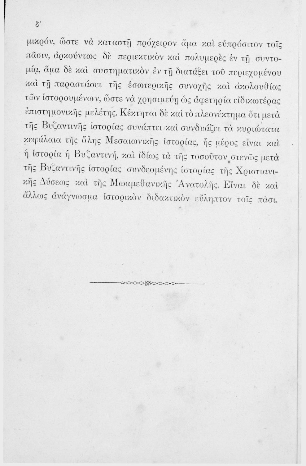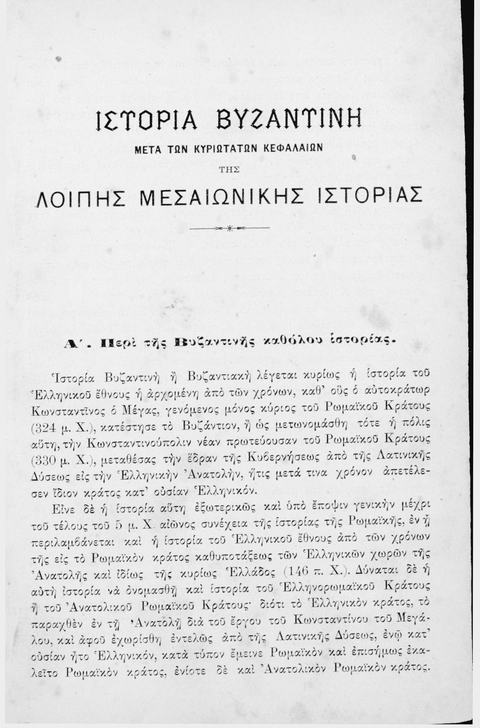 Βαθμίδα εκπαίδευσης: Τριτοβάθμια Μάθημα: Ιστορία Γλώσσα: Καθαρεύουσα Παρουσίαση περιεχομένου: Επιστημονικό σύγγραμμα Ιστορίας που απευθύνεται στους φοιτητές Φιλολογίας, υιοθετεί το σχήμα τον Παπαρρηγόπουλου και Λάμπρου και περιλαμβάνει τη βυζαντινή ιστορία από τα χρόνια του Μεγάλου Κωνσταντίνου μέχρι ην άλωση της Κωνσταντινούπολης. |