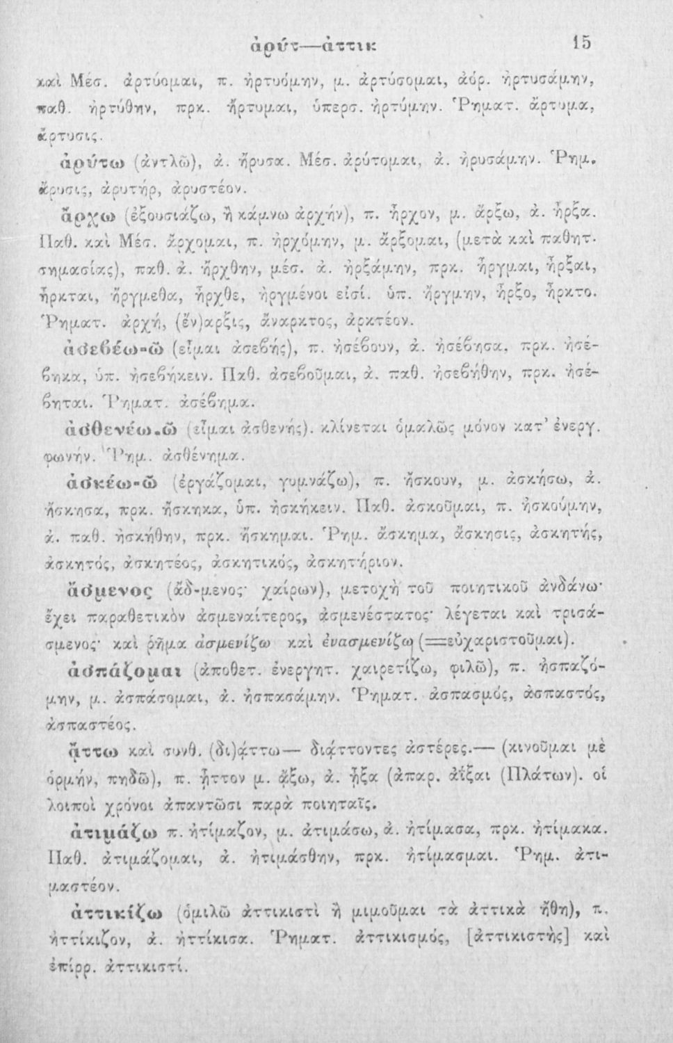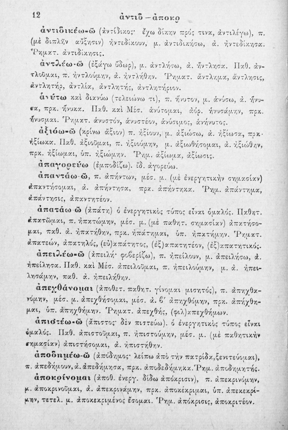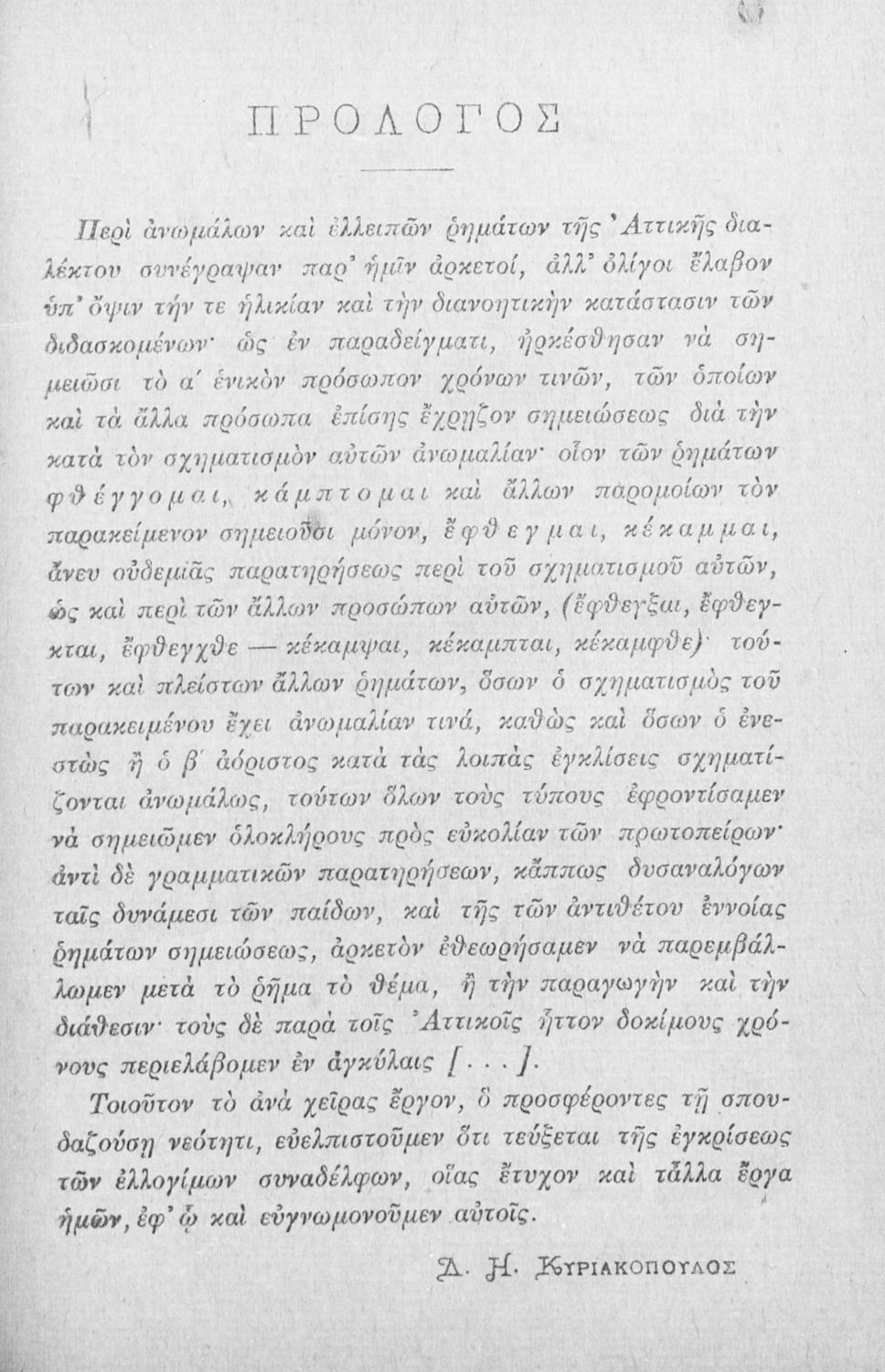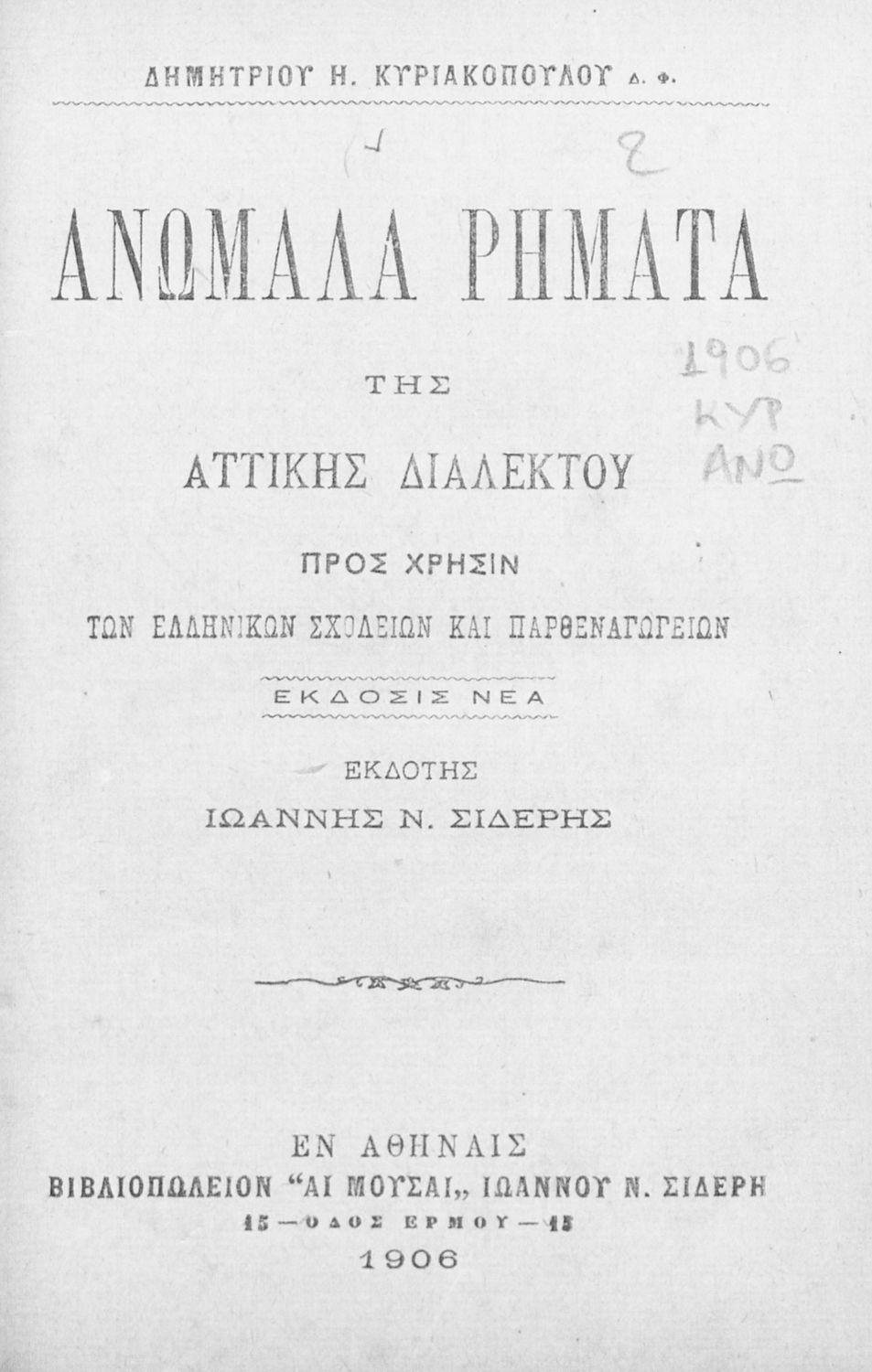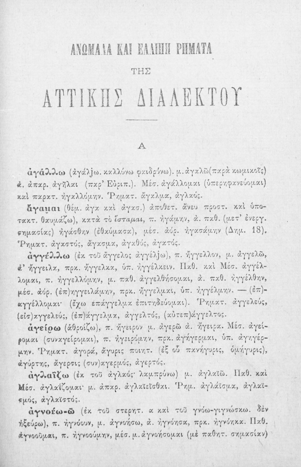 Μαθητικό βοήθημα Αρχαίων Ελληνικών για τα Ελληνικά Σχολεία και Παρθεναγωγεία που περιλαμβάνει τα ανώμαλα και ελλιπή ρήματα της αττικής διαλέκτου.