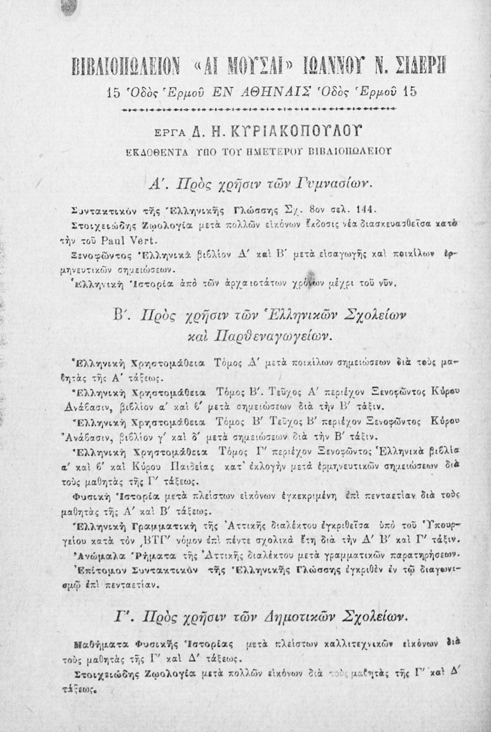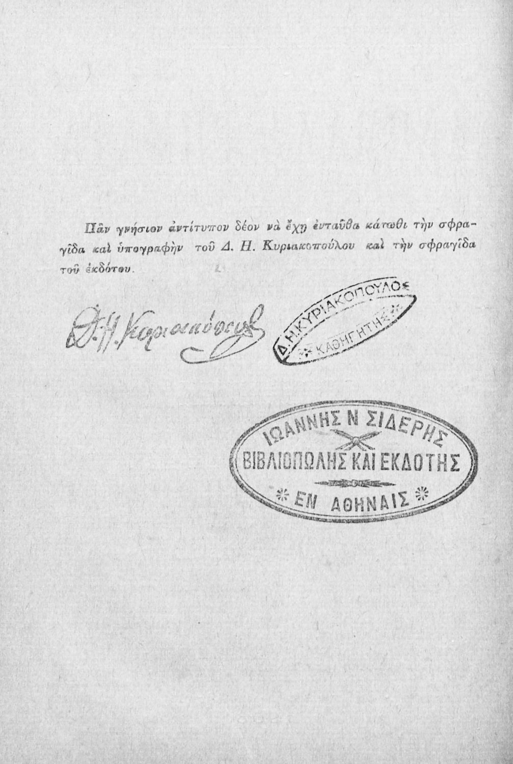 Εκδότης: Βιβλιοπωλείο ΑΙ "Μούσαι" Ιωάννη Ν.Σιδέρη Έτος έκδοσης: 1906 Τόπος έκδοσης: Αθήνα Υπουργική απόφαση / Σύμβαση: 5924/25-6-1904 |
