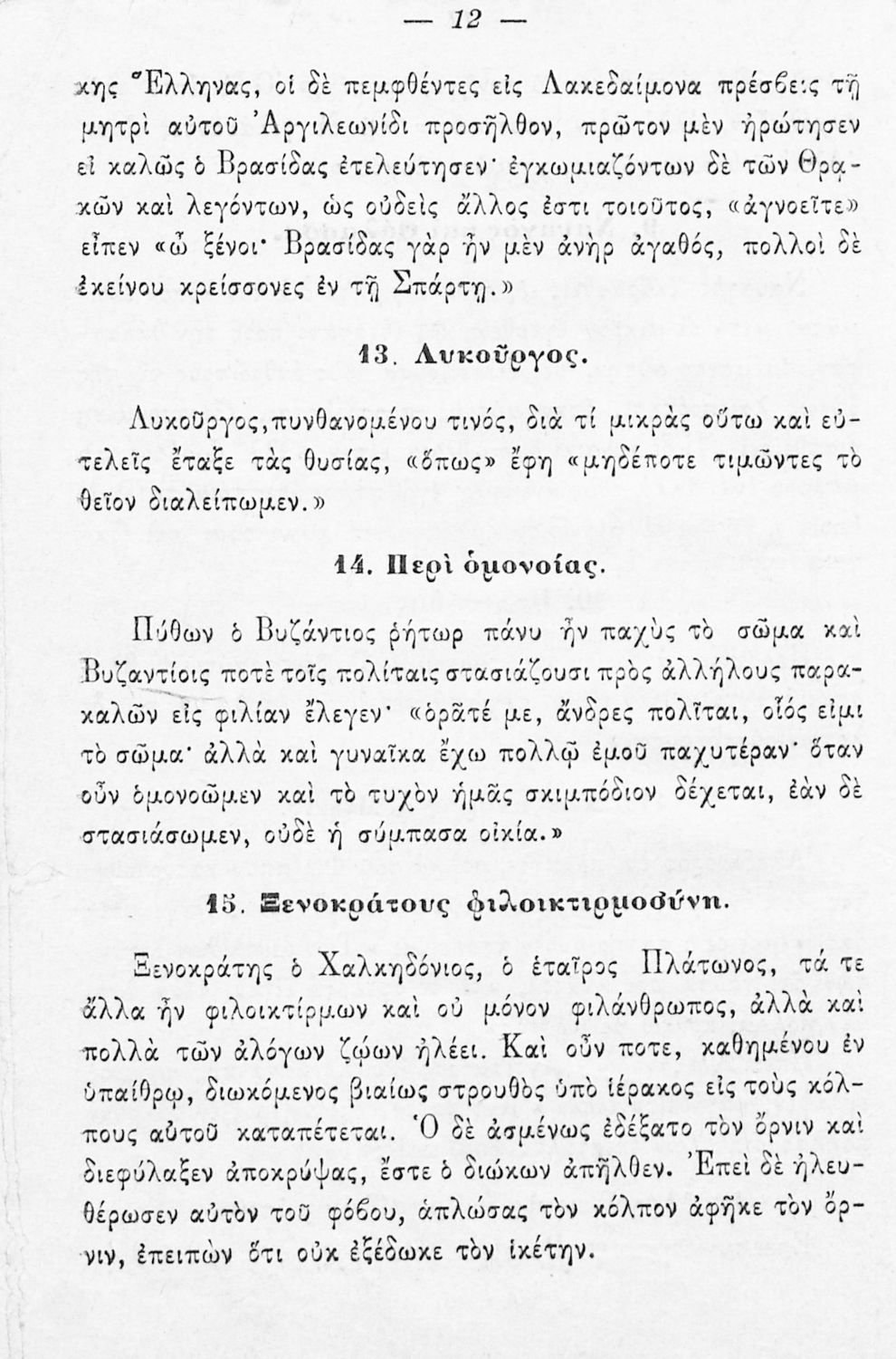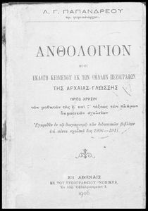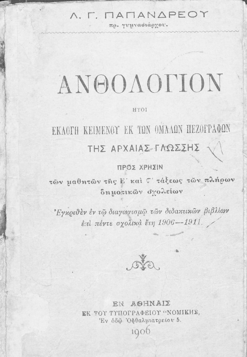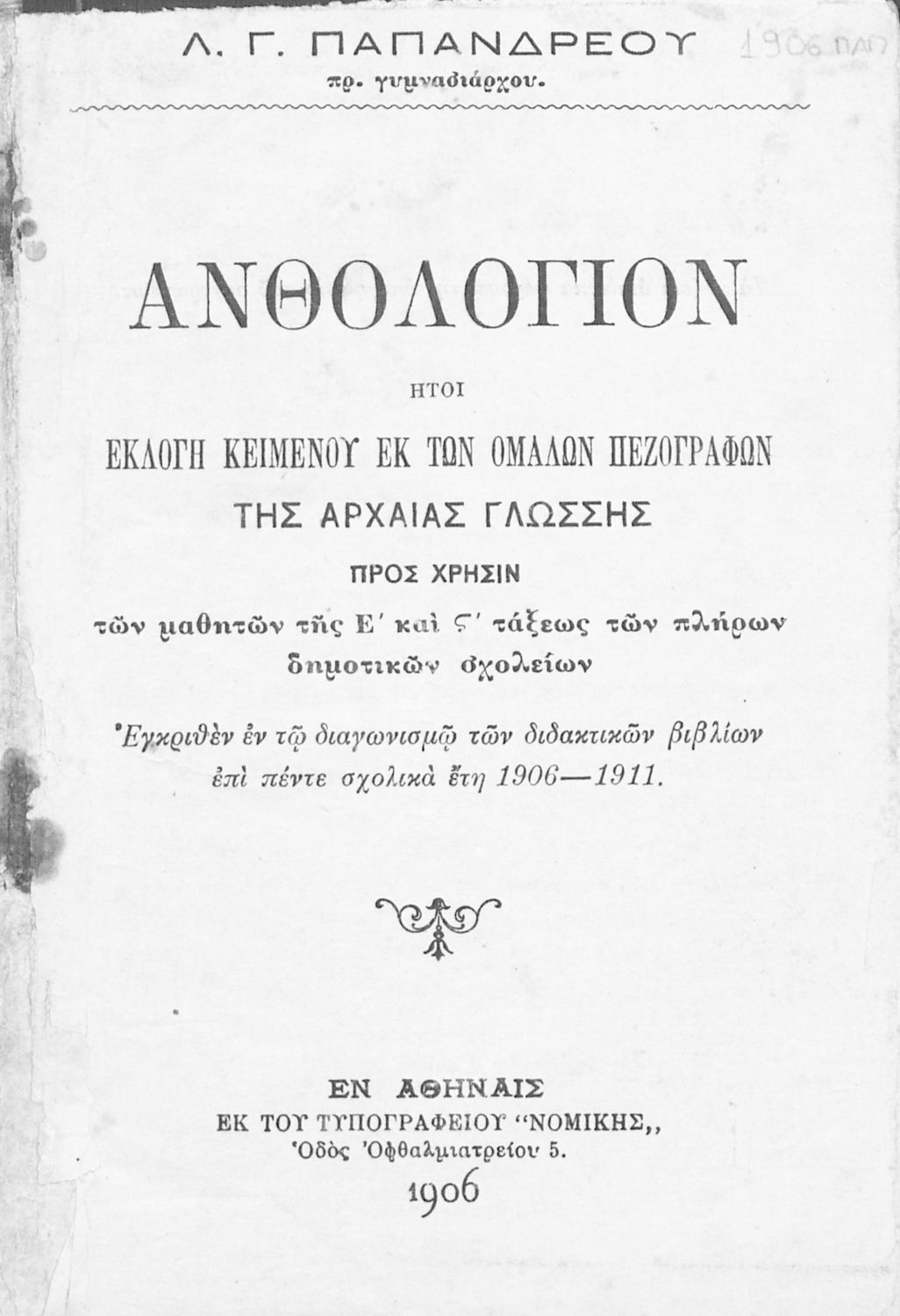 Κωδικός αναγνώρισης: 02-02235 Τίτλος: Ανθολόγιον ήτοι εκλογή κειμένου εκ των ομαλών πεζογράφων της αρχαίας γλώσσης προς χρήσιν των μαθητών της Ε΄ και ΣΤ΄ τάξεως των πλήρων Δημοτικών Σχολείων Συγγραφέας: Λ. Γ. Παπανδρέου (επιμ.) Μέγεθος και υπόστρωμα: Σχολικό εγχειρίδιο, μαλακό εξώφυλλο, 107 σελίδες. |