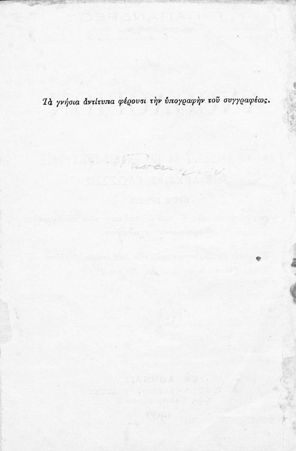 Εκδότης: Τυπογραφείο ΄ Νομικής΄ Έτος έκδοσης: 1906 Τόπος έκδοσης: Αθήνα |