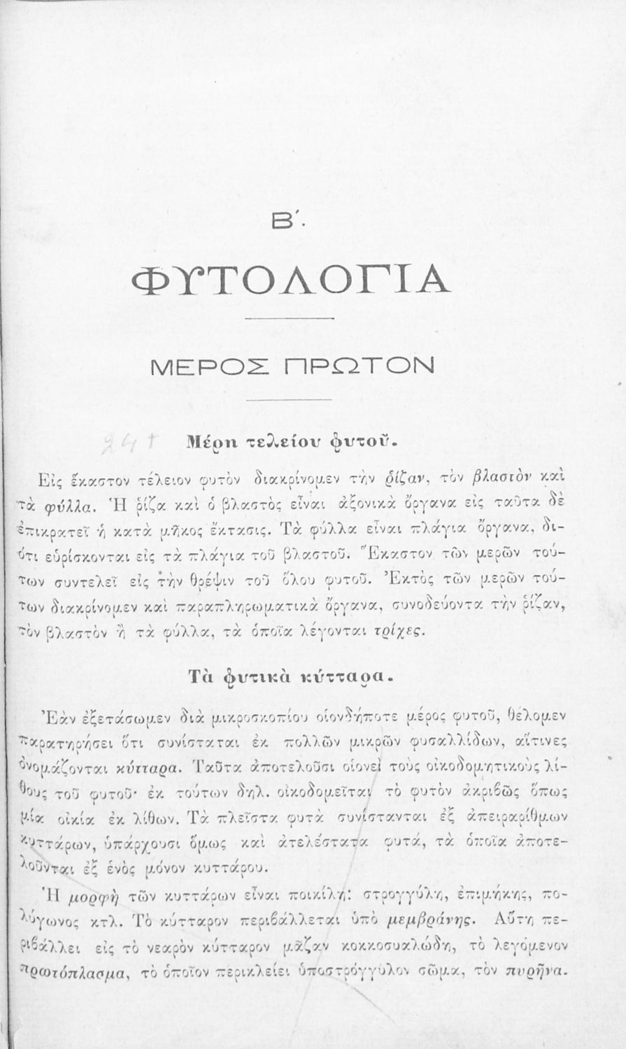 Σχολικό Εγχειρίδιο Φυσικής Ιστορίας για τις Α' και Β' Ελληνικών Σχολείων και Παρθεναγωγείων που περιλαμβάνει στοιχεία ζωολογίας και της φυτολογίας και διακρίνει τα ζώα και τα φυτά ανάλογα με την συνομοταξία ...