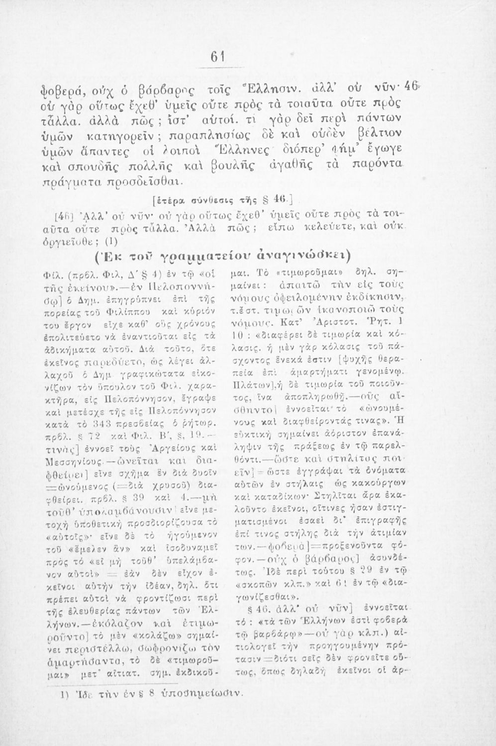 Σχολικό εγχειρίδιο Αρχαίων Ελληνικών Γ' Γυμνασίου που περιέχει το Λόγο του Δημοσθένη Α΄ Κατά Φιλίππου και γλωσσικά και ερμηνευτικά σχόλια.