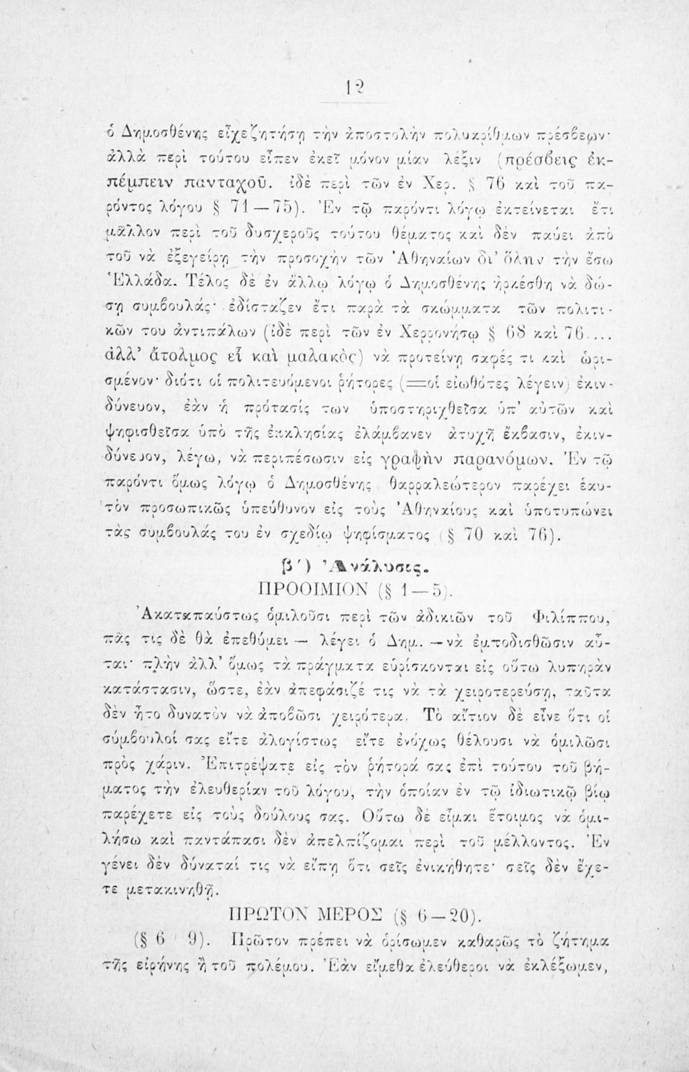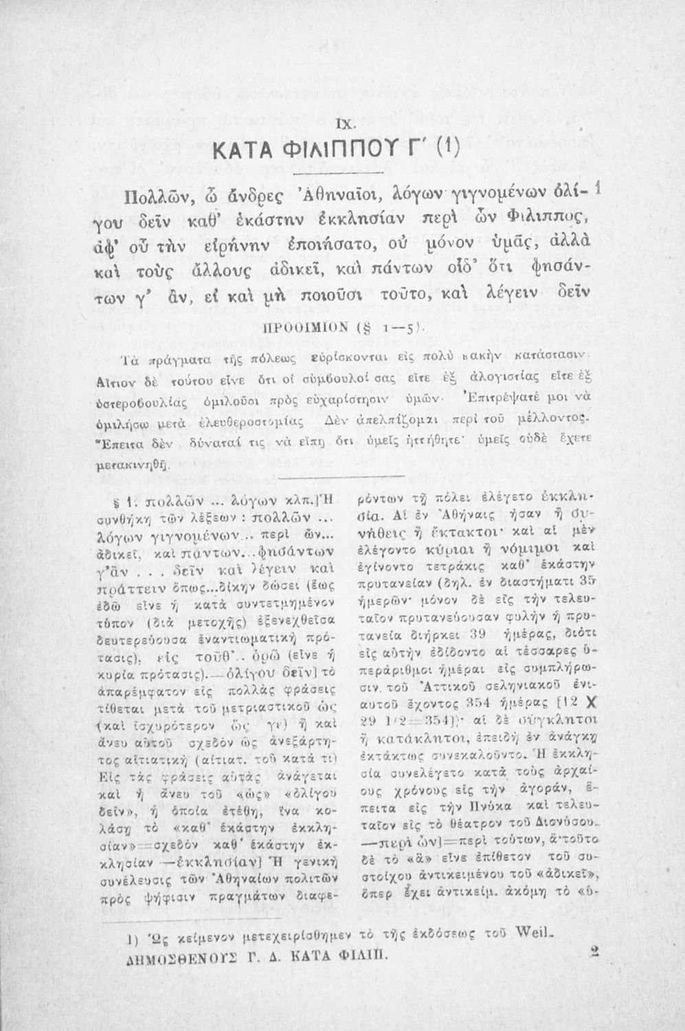 Σχολικό εγχειρίδιο Αρχαίων Ελληνικών Γ΄ Γυμνασίου που περιλαμβάνει τον Λόγο του Δημοσθένη Α΄ κατά Φιλίππου, εισαγωγικά σχόλια στο έργο και τη ζωή του, ερμηνευτικά και γραμματικά σχόλια και παρατηρήσεις.