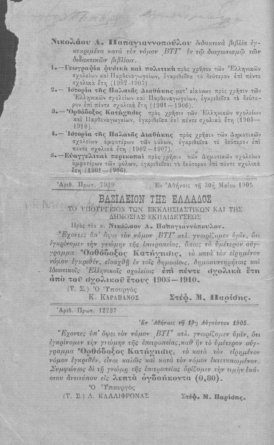 Εκδότης: Ιωάννης Ν. Σιδέρης Έτος έκδοσης: 1905 Τόπος έκδοσης: Αθήνα Υπουργική απόφαση / Σύμβαση: 7929/30-5-1905 |