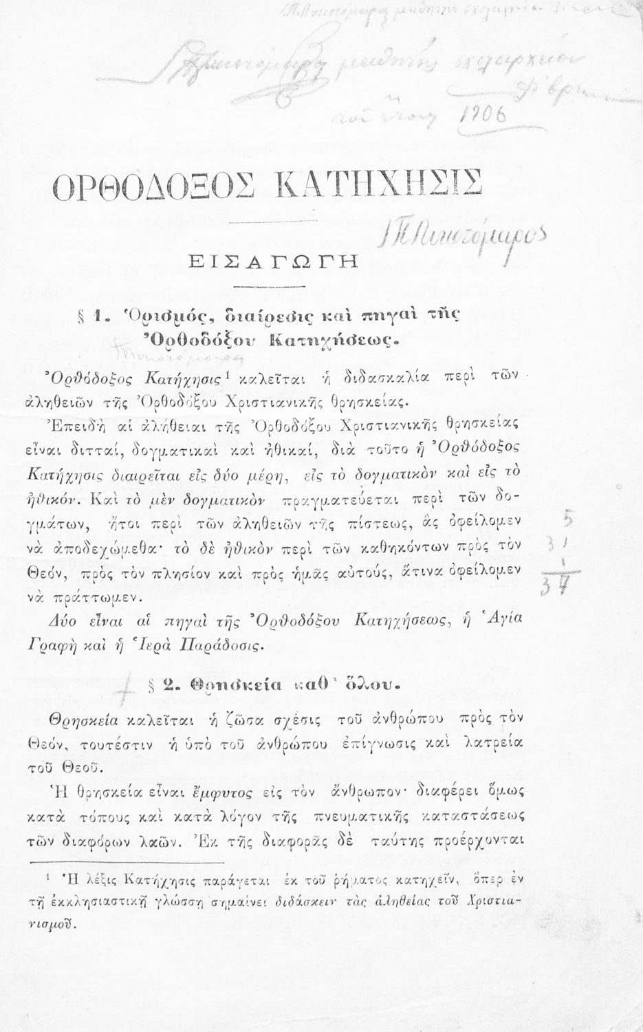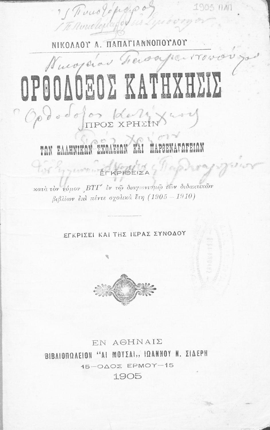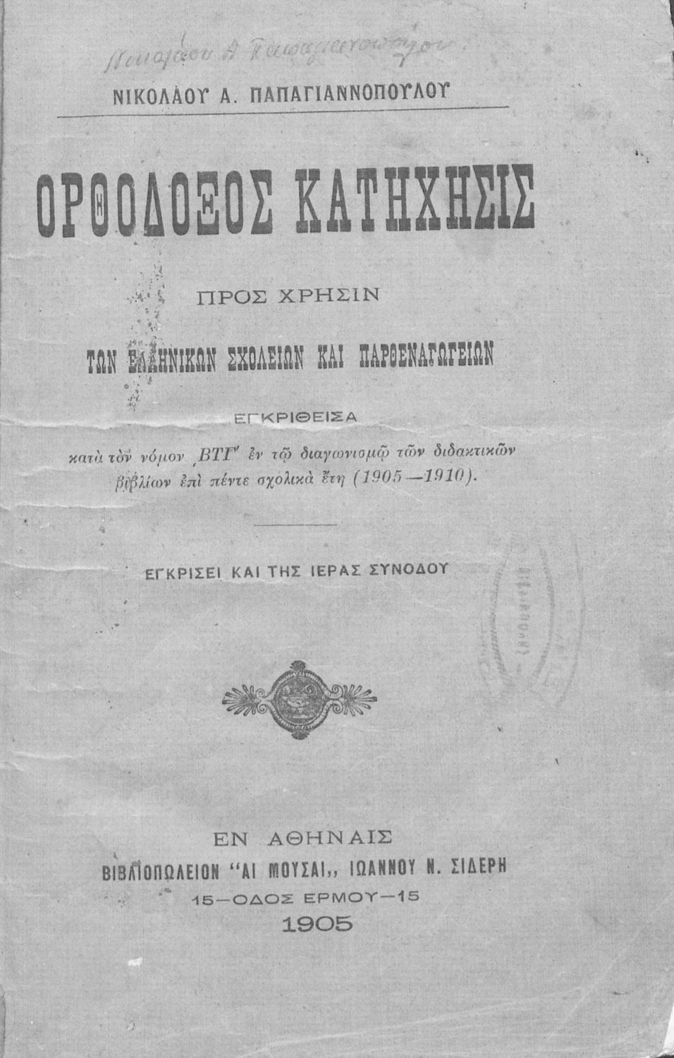 Βαθμίδα εκπαίδευσης: Δευτεροβάθμια Τάξη: Ελληνικό Σχολείο / Παρθεναγωγείο Μάθημα: Θρησκευτικά Γλώσσα: Καθαρεύουσα Παρουσίαση περιεχομένου: Σχολικό εγχειρίδιο Θρησκευτικών για τα Ελληνικά Σχολεία και παρθεναγωγεία που περιλαμβάνει εισαγωγή στην Παλαιά και Καινή διαθήκη και πραγματεύεται δογματικά και ηθικά ζητήματα της ορθόδοξης κατήχησης Είχε εγκριθεί από την Ιερά Σύνοδο |