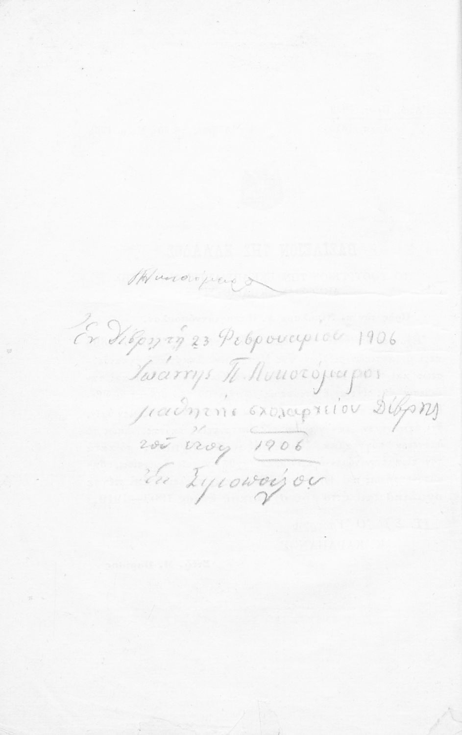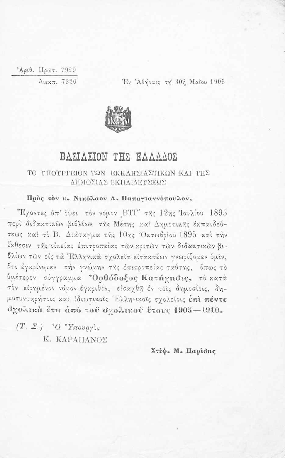 Εκδότης: Ιωάννης Ν. Σιδέρης Έτος έκδοσης: 1905 Τόπος έκδοσης: Αθήνα Υπουργική απόφαση / Σύμβαση: 7929/30-5-1905 |