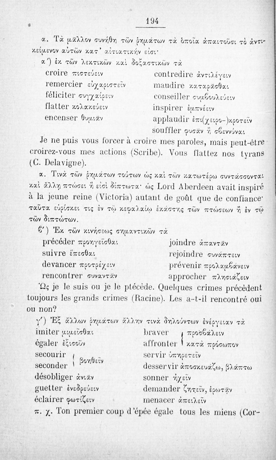 Βαθμίδα εκπαίδευσης: Δευτεροβάθμια Τάξη: Γυμνάσιο Μάθημα: Γαλλικά Γλώσσα: Καθαρεύουσα Παρουσίαση περιεχομένου: Σχολικό εγχειρίδιο Γαλλικών Γυμνασίου που περιλαμβάνει τους κανόνες γραμματικής και συντακτικού. |