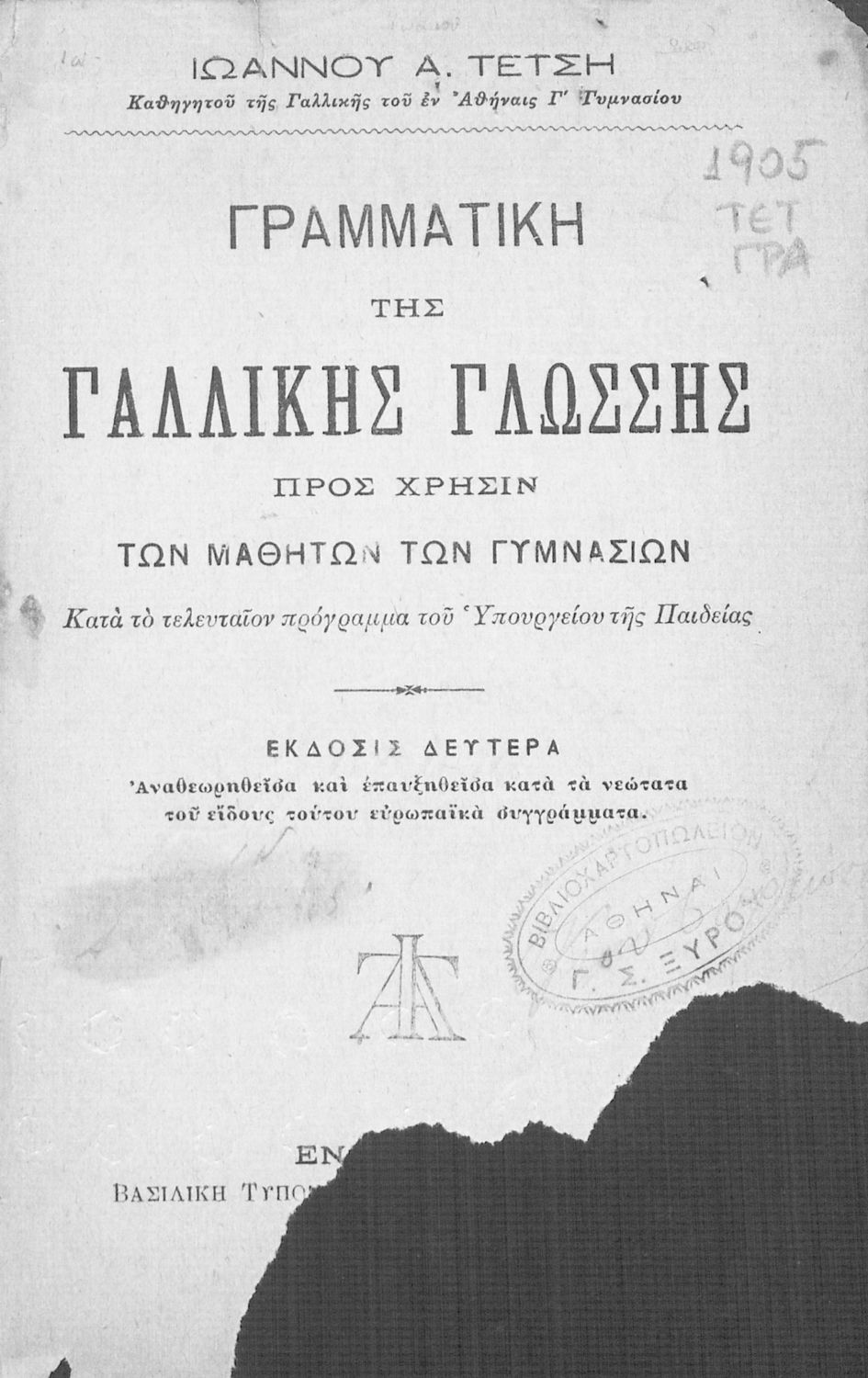 Βαθμίδα εκπαίδευσης: Δευτεροβάθμια Τάξη: Γυμνάσιο Μάθημα: Γαλλικά Γλώσσα: Καθαρεύουσα Παρουσίαση περιεχομένου: Σχολικό εγχειρίδιο Γαλλικών Γυμνασίου που περιλαμβάνει τους κανόνες γραμματικής και συντακτικού. |