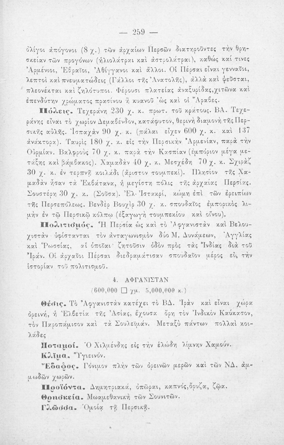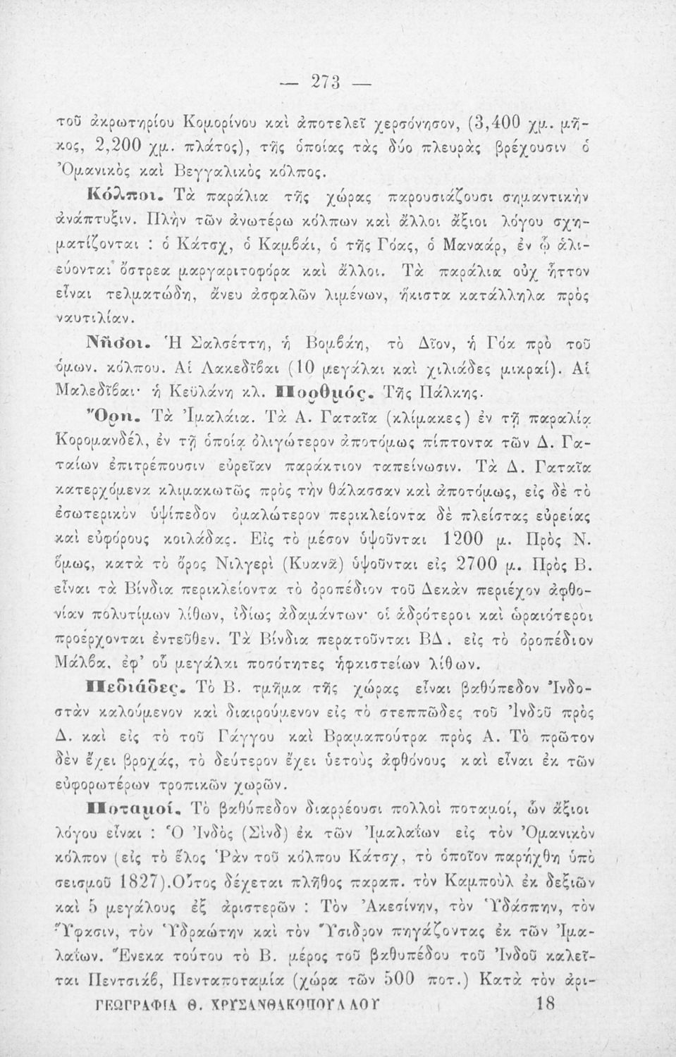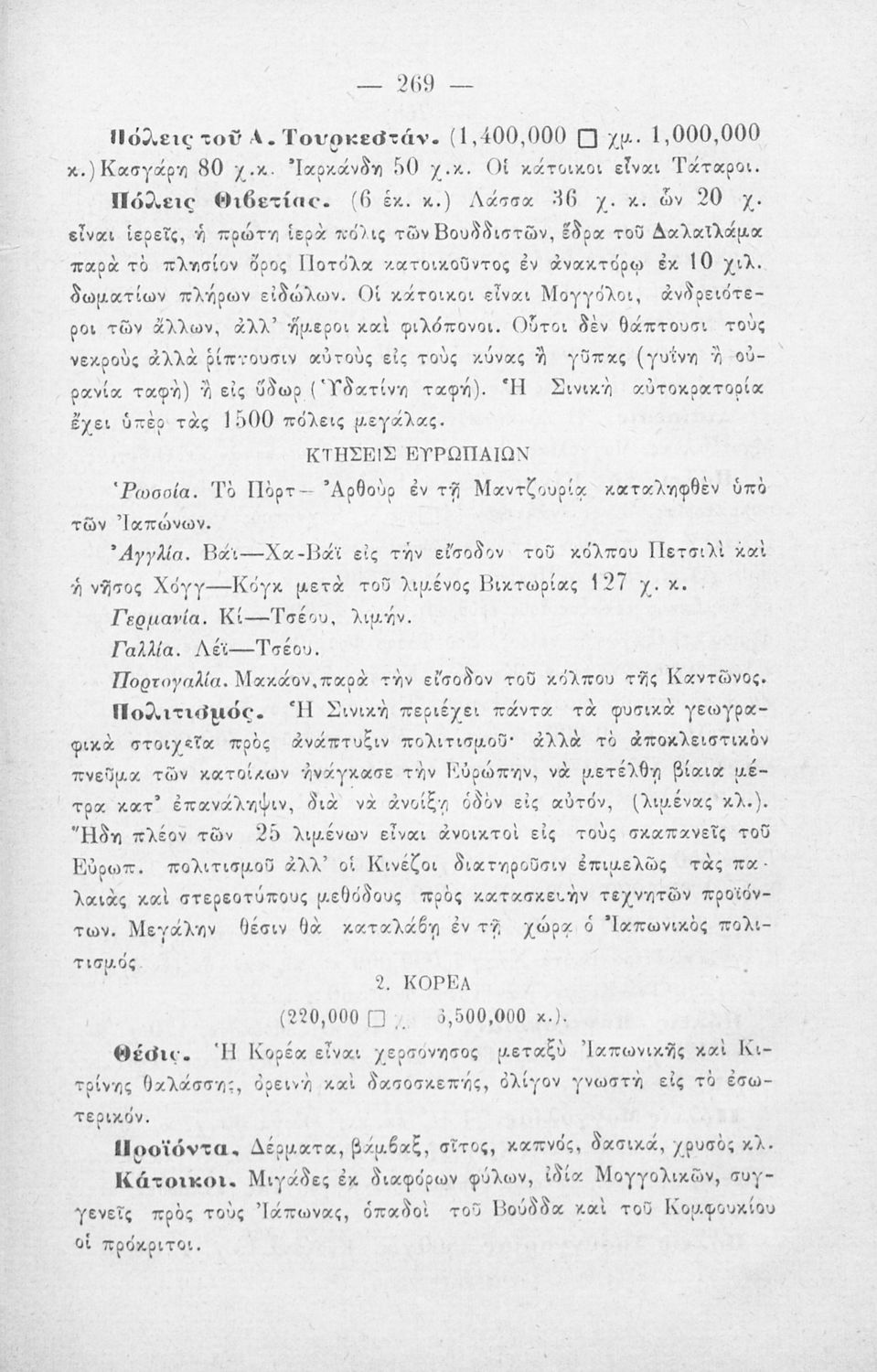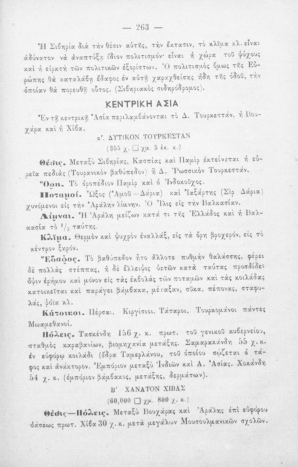 Σχολικό εγχειρίδιο Γεωγραφίας για Ελληνικά Σχολεία και Παρθεναγωγεία που περιλαμβάνει στοιχεία φυσικής, πολιτικής, πολιτισμικής και ιστορικής γεωγραφίας και εξετάζει ενδεικτικά κράτη και περιοχές από τις πέντε ηπείρους από γεωφυσική, πολιτική και οικονομική σκοπιά.