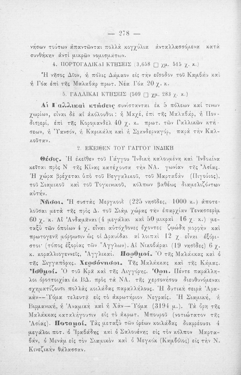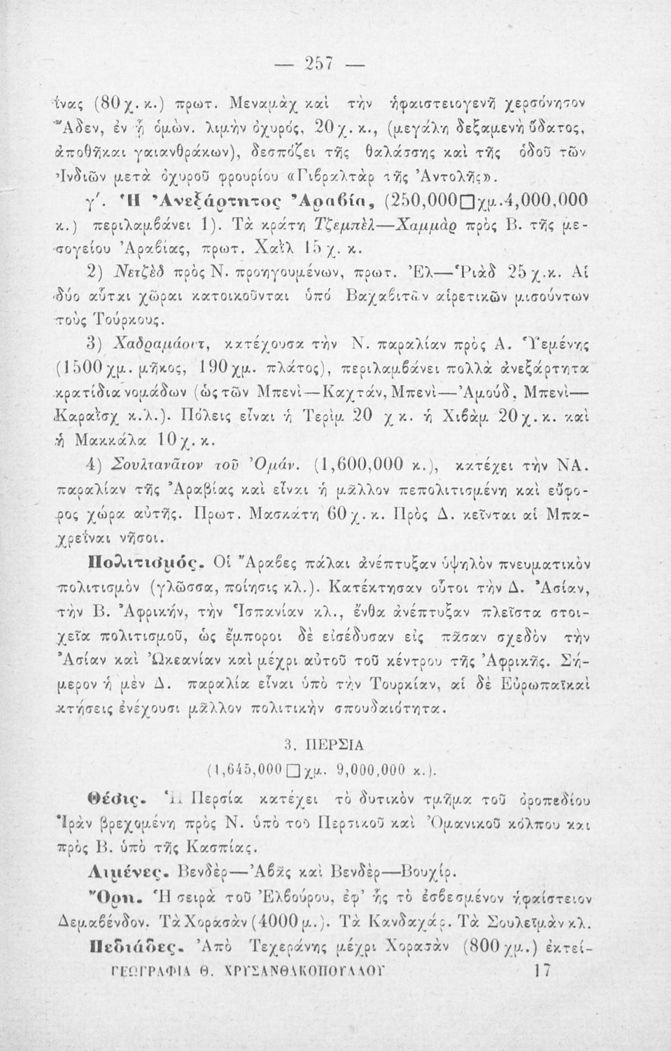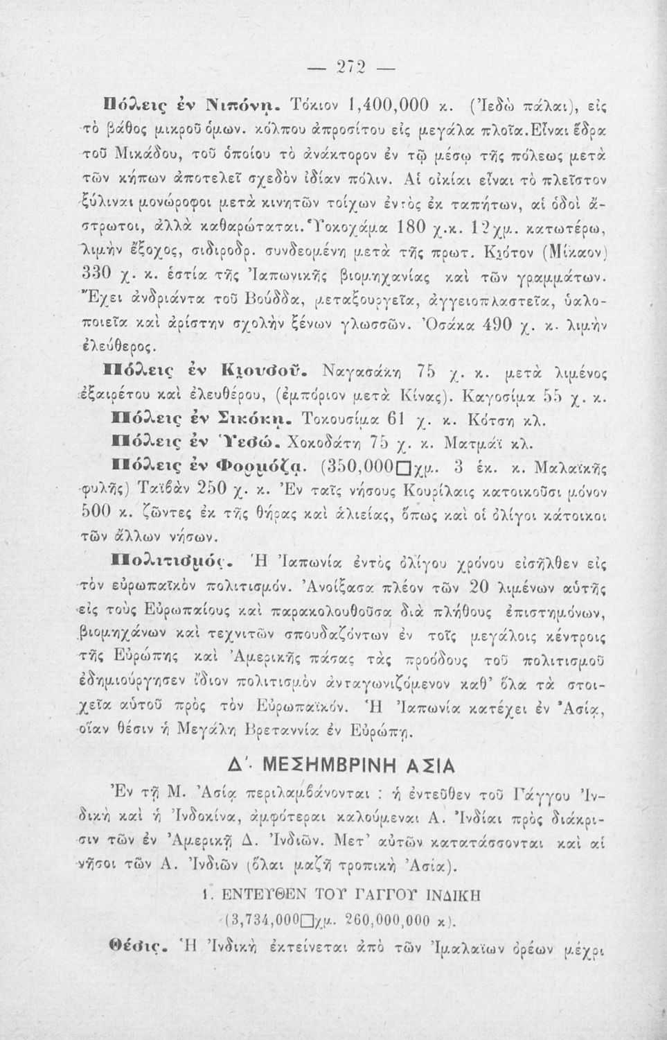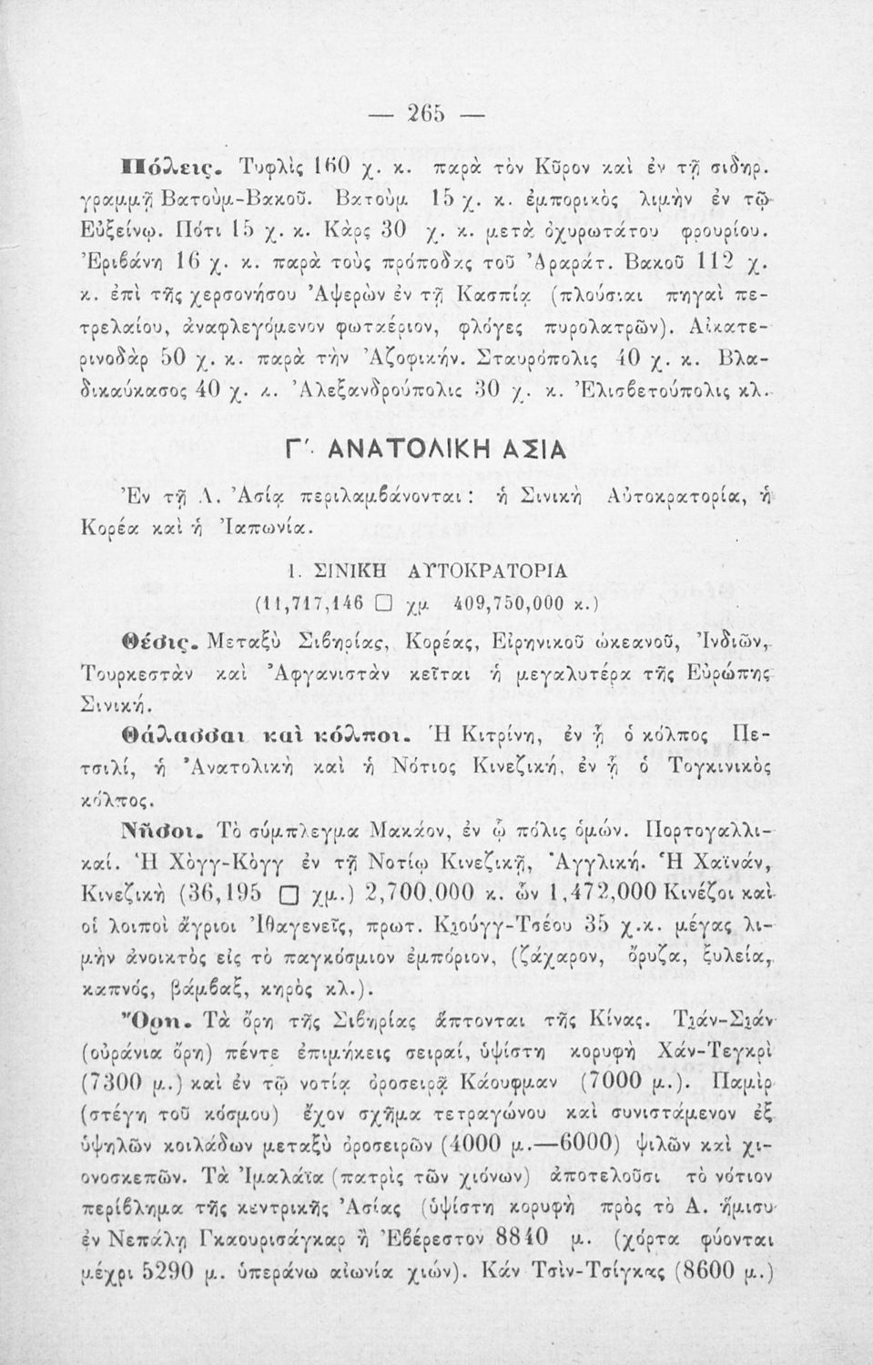 Σχολικό εγχειρίδιο Γεωγραφίας για Ελληνικά Σχολεία και Παρθεναγωγεία που περιλαμβάνει στοιχεία φυσικής, πολιτικής, πολιτισμικής και ιστορικής γεωγραφίας και εξετάζει ενδεικτικά κράτη και περιοχές από τις πέντε ηπείρους από γεωφυσική, πολιτική και οικονομική σκοπιά.