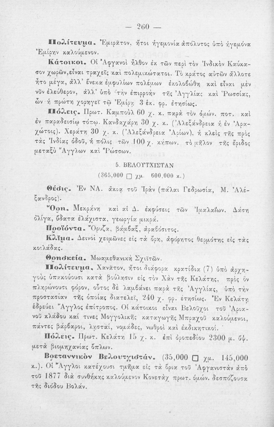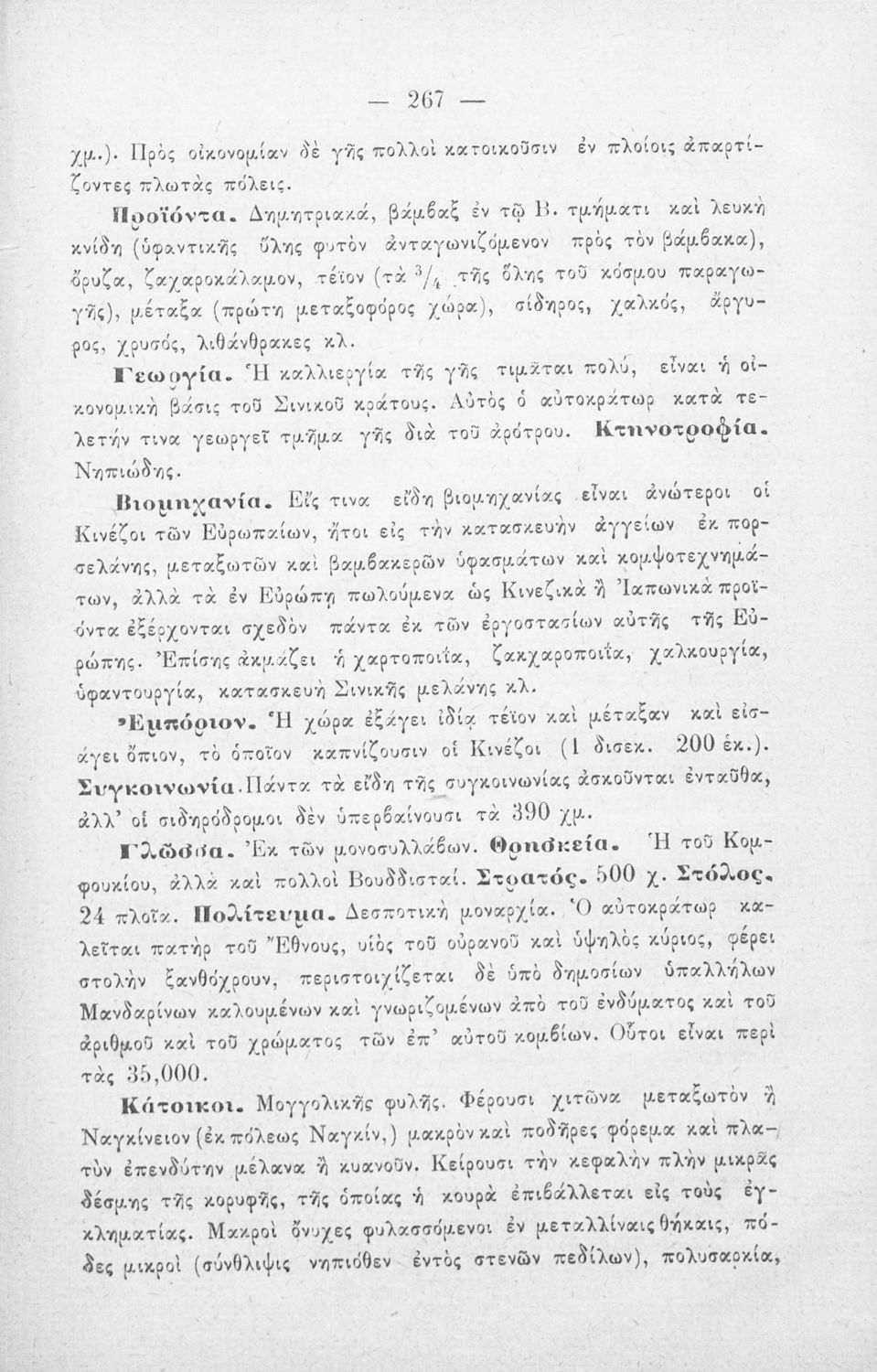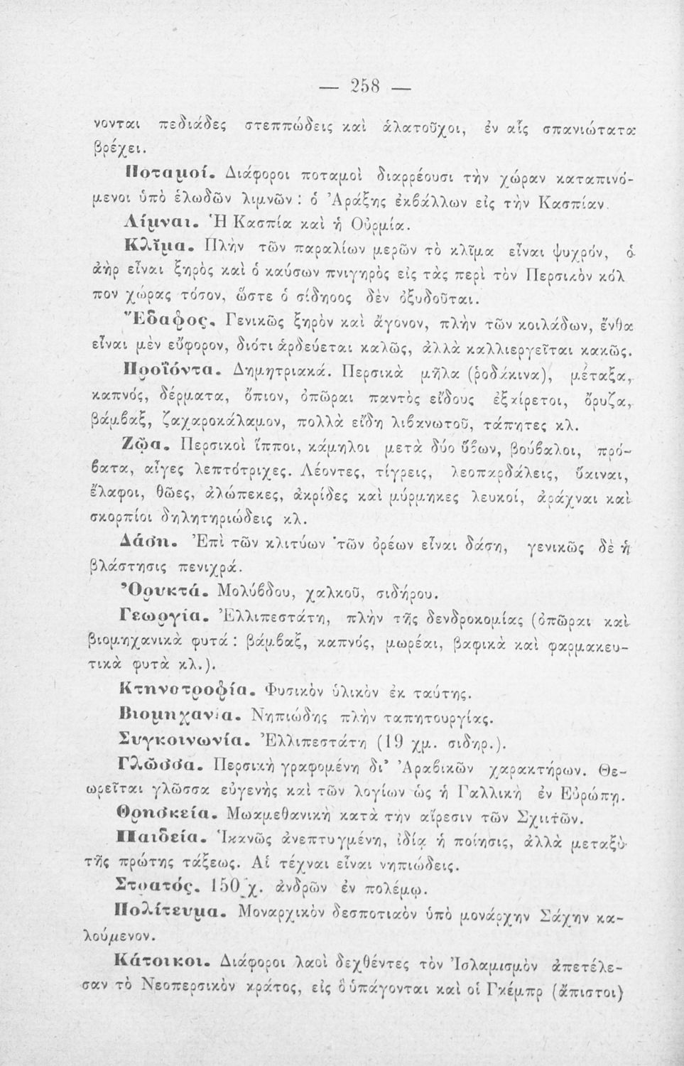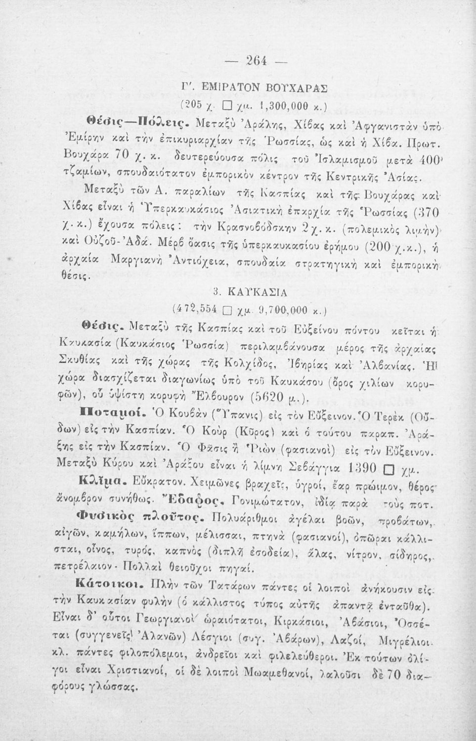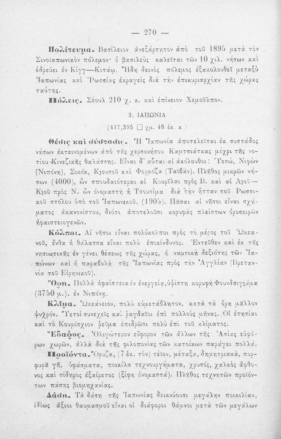 Σχολικό εγχειρίδιο Γεωγραφίας για Ελληνικά Σχολεία και Παρθεναγωγεία που περιλαμβάνει στοιχεία φυσικής, πολιτικής, πολιτισμικής και ιστορικής γεωγραφίας και εξετάζει ενδεικτικά κράτη και περιοχές από τις πέντε ηπείρους από γεωφυσική, πολιτική και οικονομική σκοπιά.