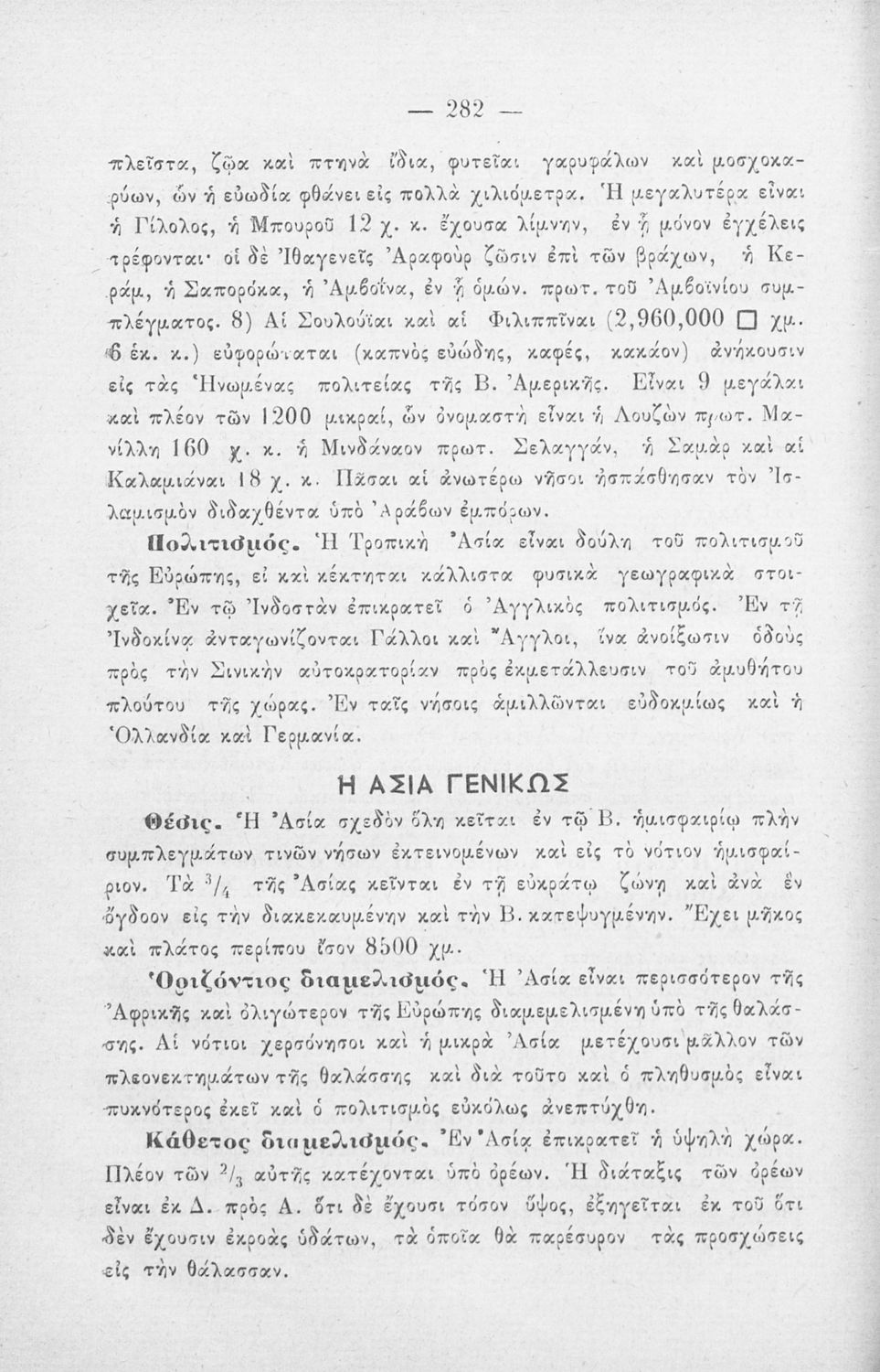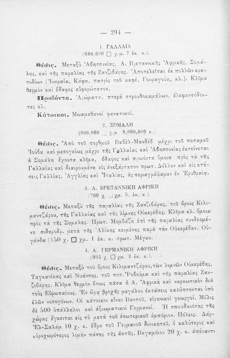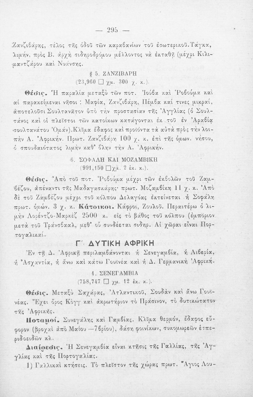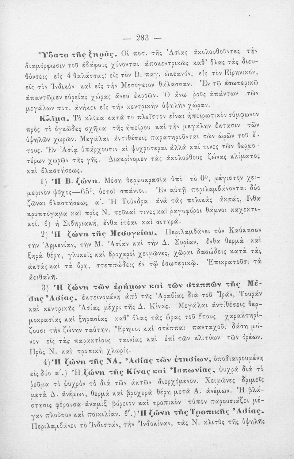 Σχολικό εγχειρίδιο Γεωγραφίας για Ελληνικά Σχολεία και Παρθεναγωγεία που περιλαμβάνει στοιχεία φυσικής, πολιτικής, πολιτισμικής και ιστορικής γεωγραφίας και εξετάζει ενδεικτικά κράτη και περιοχές από τις πέντε ηπείρους από γεωφυσική, πολιτική και οικονομική σκοπιά.