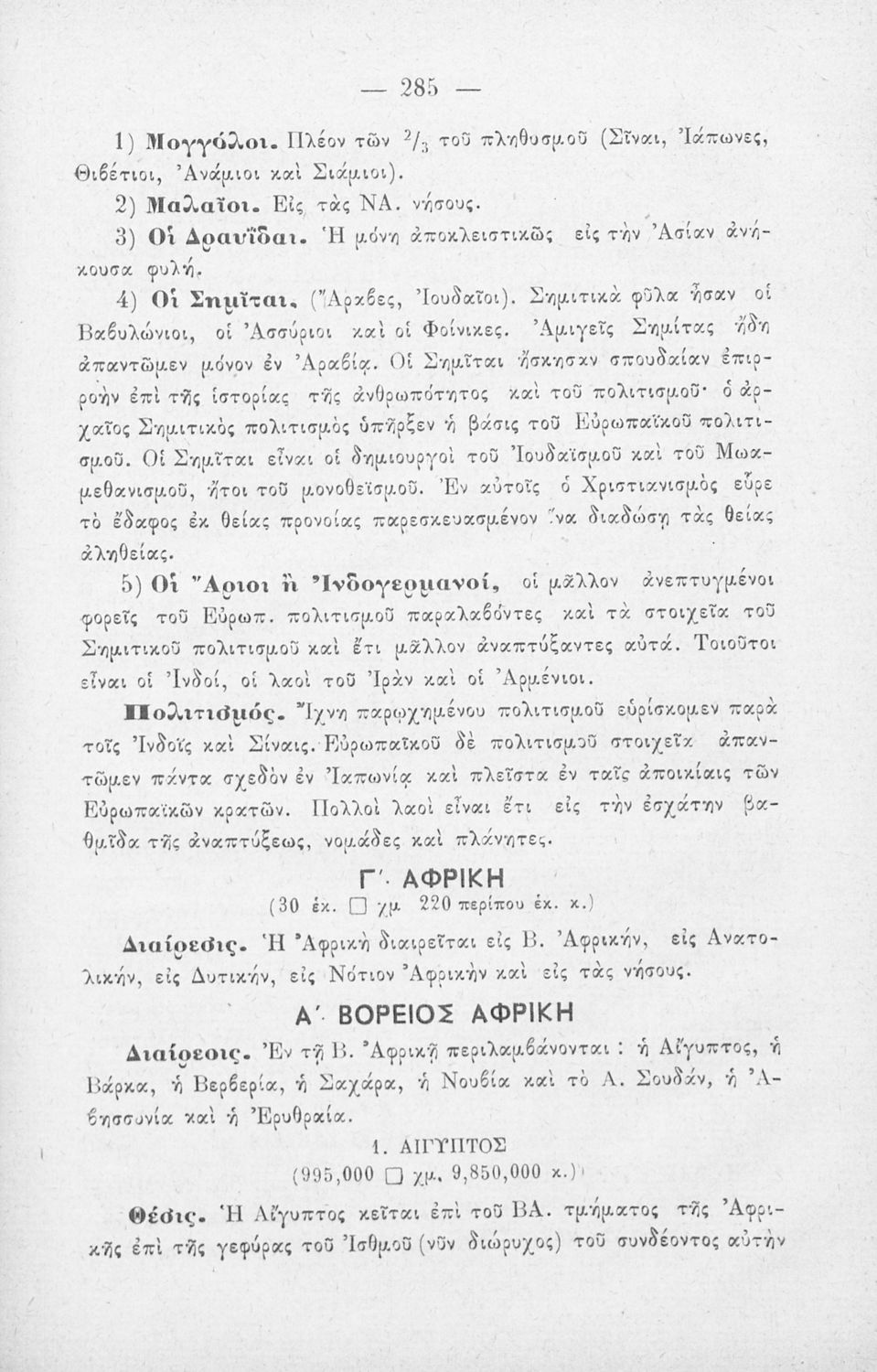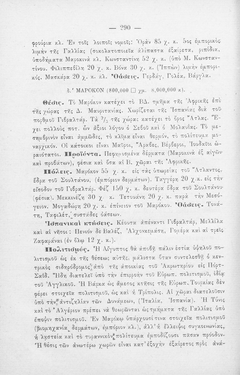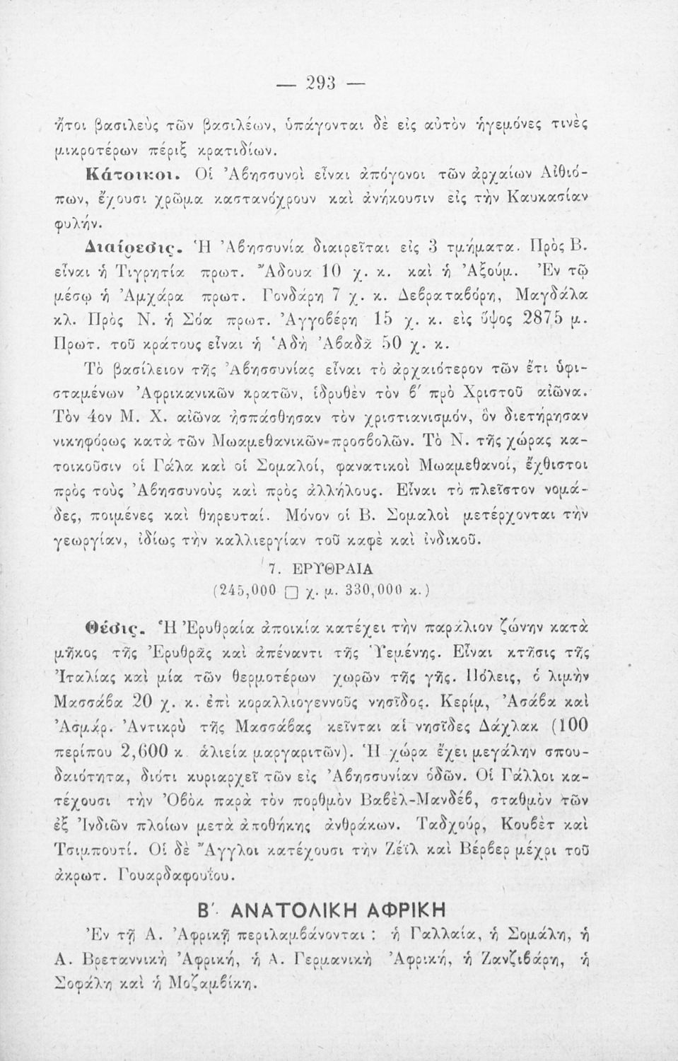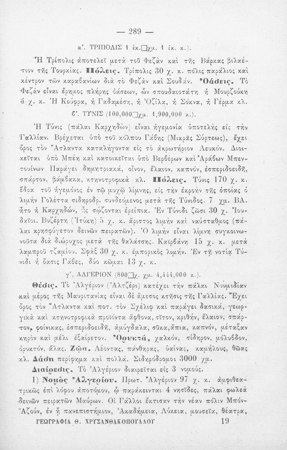 Σχολικό εγχειρίδιο Γεωγραφίας για Ελληνικά Σχολεία και Παρθεναγωγεία που περιλαμβάνει στοιχεία φυσικής, πολιτικής, πολιτισμικής και ιστορικής γεωγραφίας και εξετάζει ενδεικτικά κράτη και περιοχές από τις πέντε ηπείρους από γεωφυσική, πολιτική και οικονομική σκοπιά.
