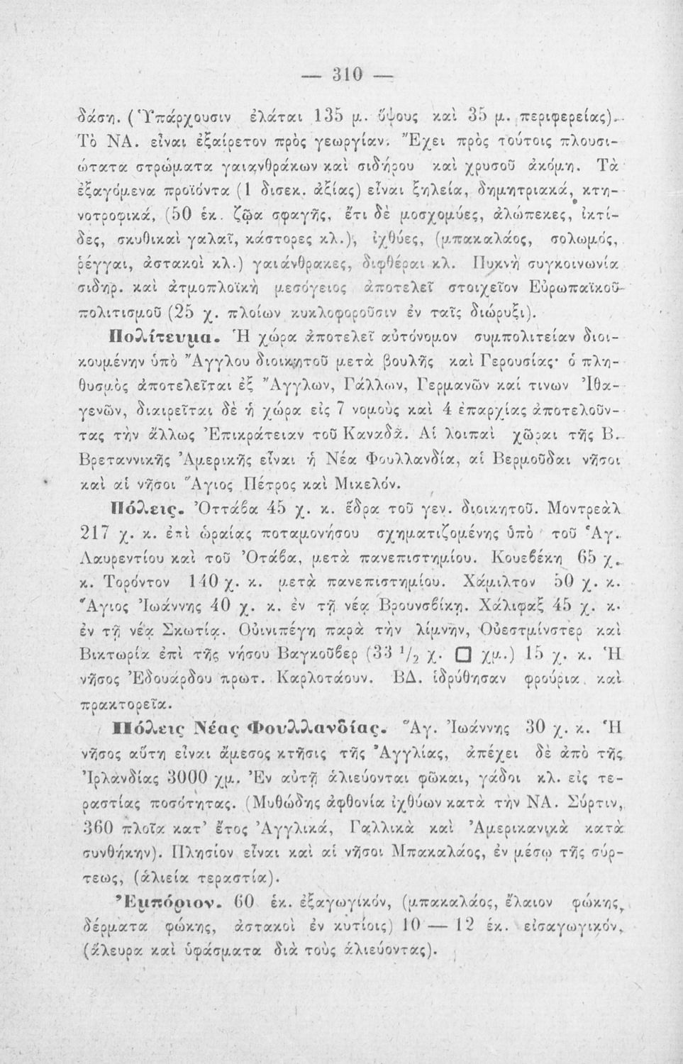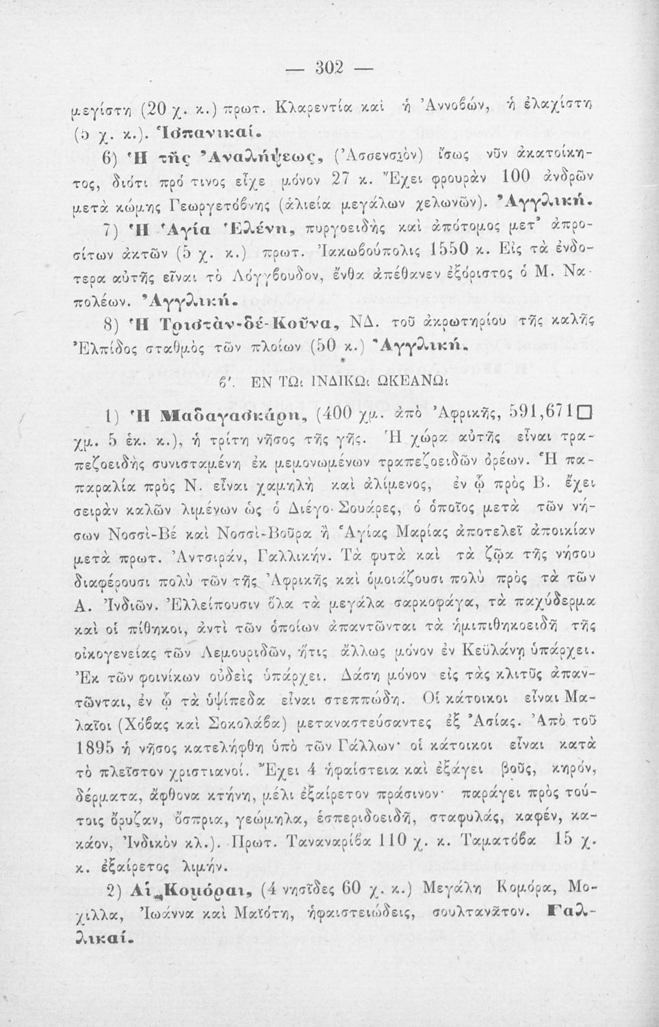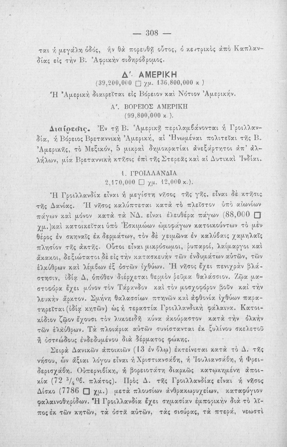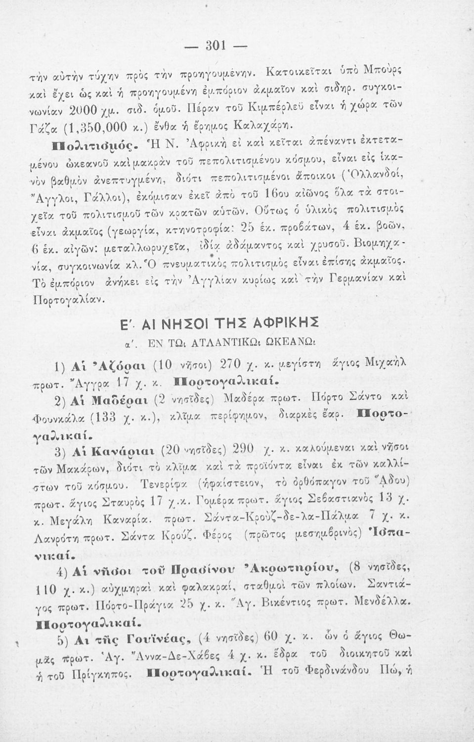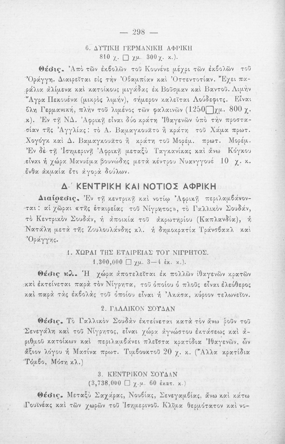 Σχολικό εγχειρίδιο Γεωγραφίας για Ελληνικά Σχολεία και Παρθεναγωγεία που περιλαμβάνει στοιχεία φυσικής, πολιτικής, πολιτισμικής και ιστορικής γεωγραφίας και εξετάζει ενδεικτικά κράτη και περιοχές από τις πέντε ηπείρους από γεωφυσική, πολιτική και οικονομική σκοπιά.