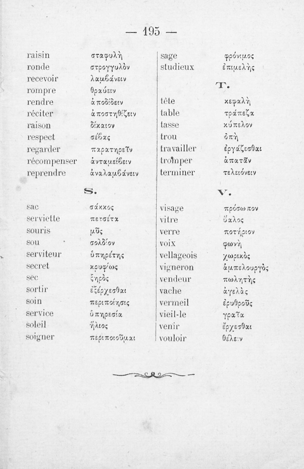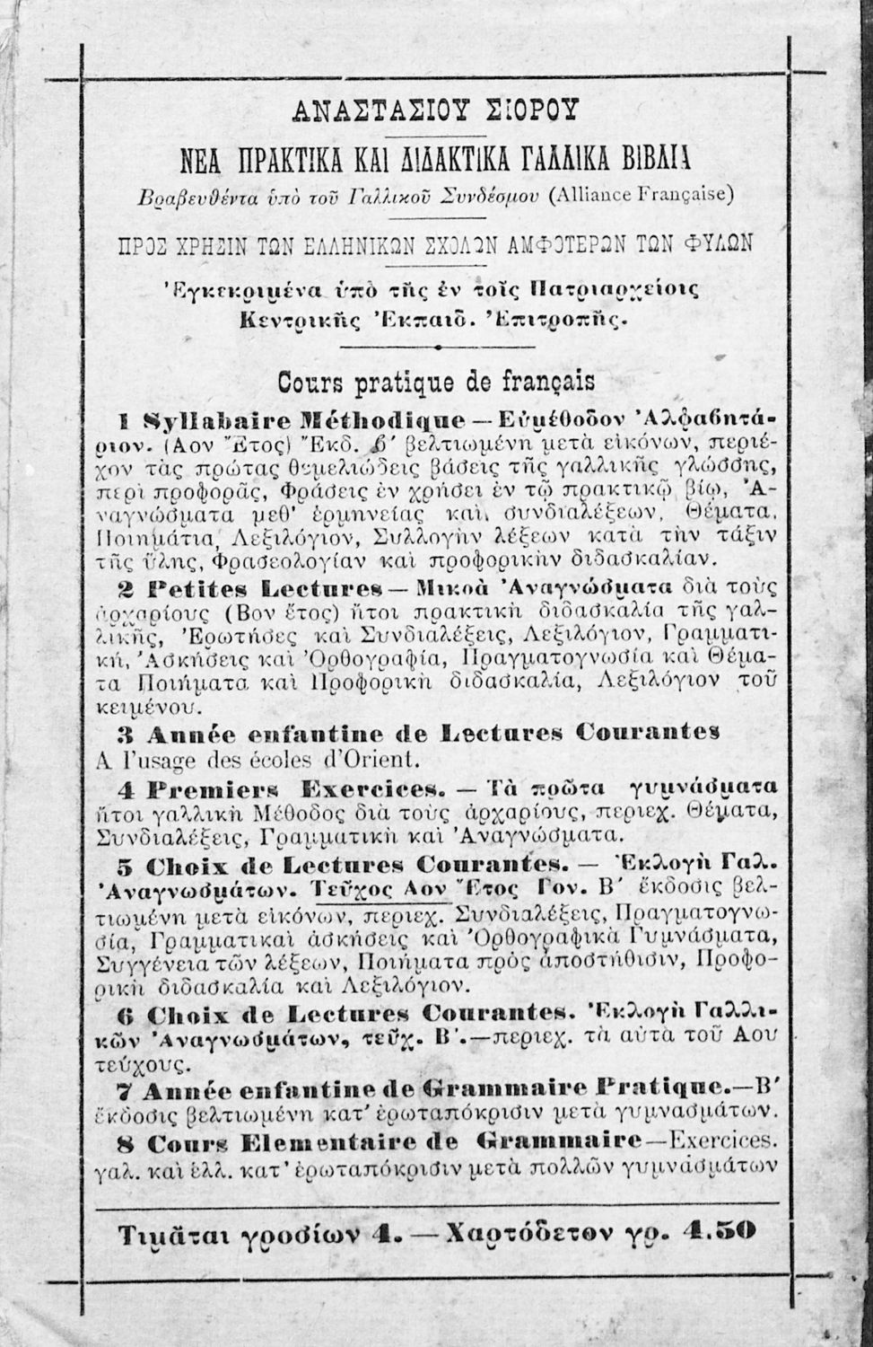 Κωδικός αναγνώρισης: 02-02254 Τίτλος: Cours elementaire de grammaire pratique de la langue francaise = Στοιχειώδης πρακτική γραμματική της γαλλικής γλώσσης, γαλλιστί και ελληνιστί κατ΄ ερωταπόκρισιν μετά γυμνασμάτων και ομώνυμων, Προς χρήσιν των Ελληνικών σχολών αμφότερων των φύλων Συγγραφέας: Α. Σιώρος Μέγεθος και υπόστρωμα: Σχολικό εγχειρίδιο, σκληρό εξώφυλλο, 208 σελίδες. |