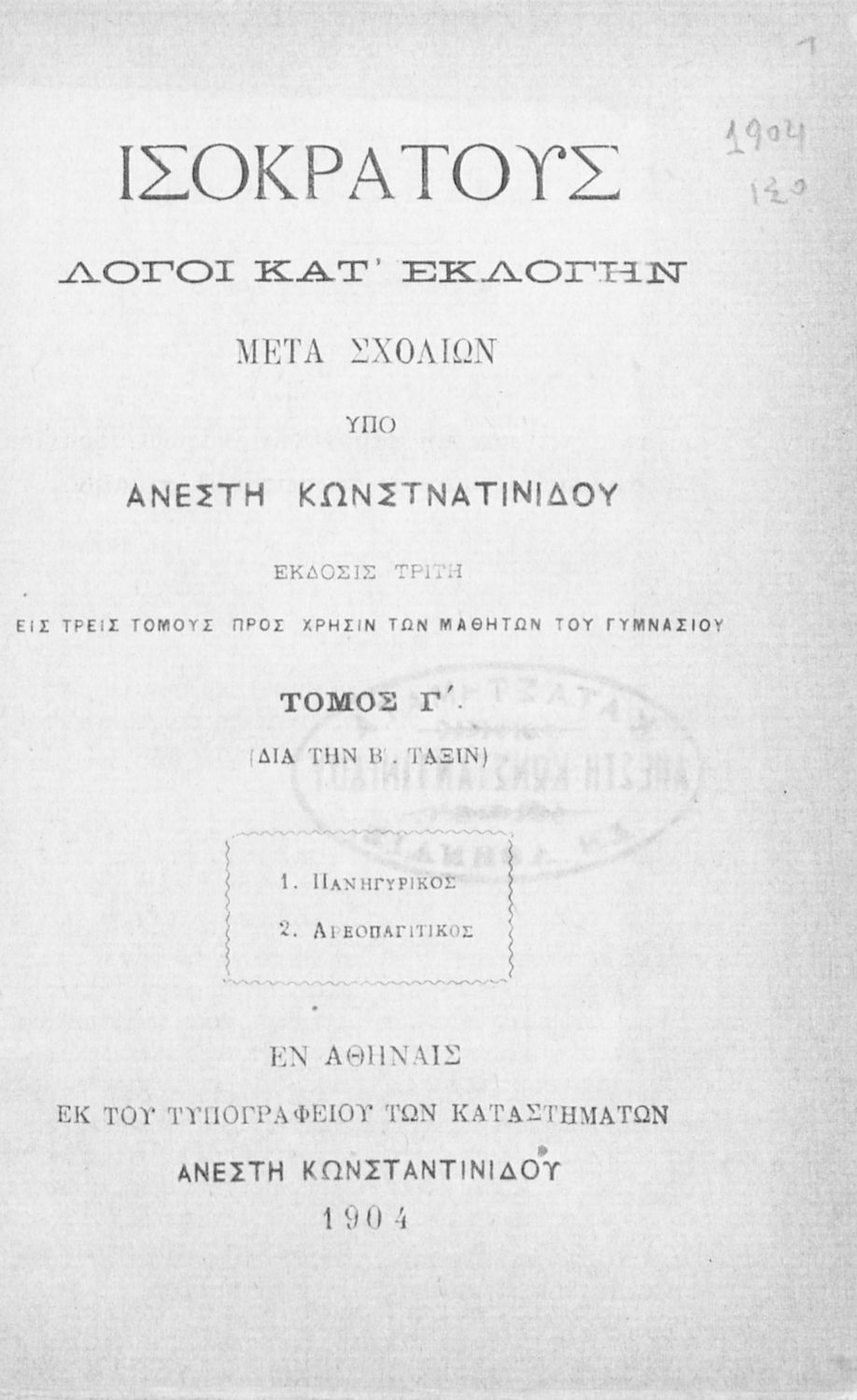 Εκδότης: Τυπογραφείο: Ανέστης Κωνσταντινίδης Έτος έκδοσης: 1904 Τόπος έκδοσης: Αθήνα Έκδοση: 3η |