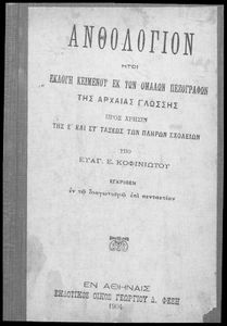 Κωδικός αναγνώρισης: 02-02259 Τίτλος: Ανθολόγιον ήτοι εκλογή κειμένου εκ των ομαλών πεζογράφων της αρχαίας γλώσσης προς χρήσιν της Ε΄ και ΣΤ΄ τάξεως των πλήρων σχολείων Συγγραφέας: Ευάγγελος Ε. Κοφινιώτης (επιμ.) Μέγεθος και υπόστρωμα: Σχολικό εγχειρίδιο, σκληρό εξώφυλλο, 93 σελίδες. |