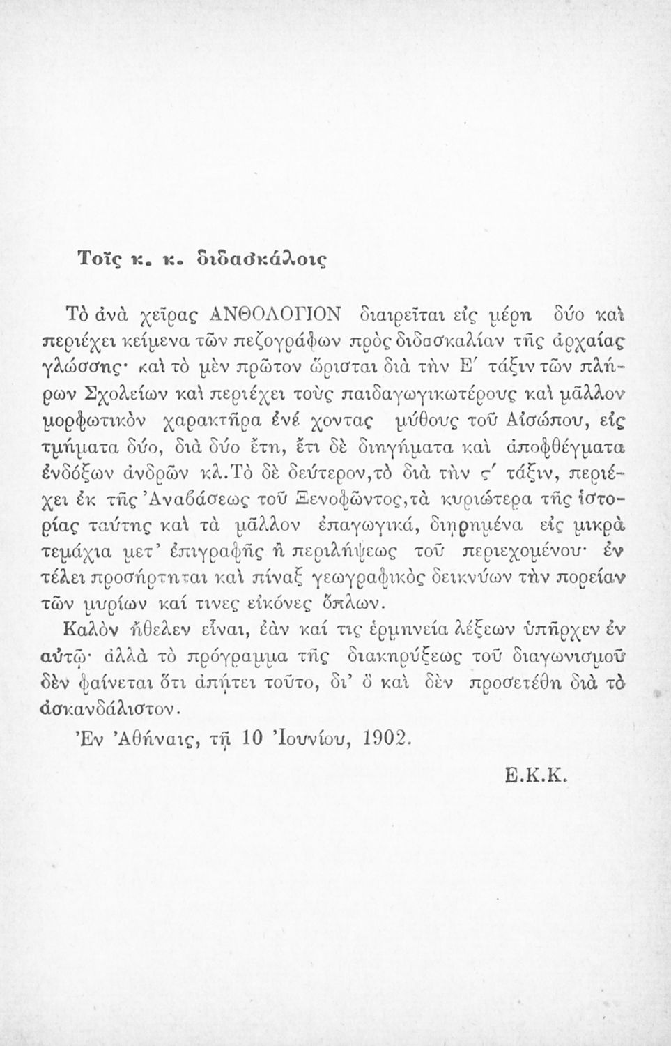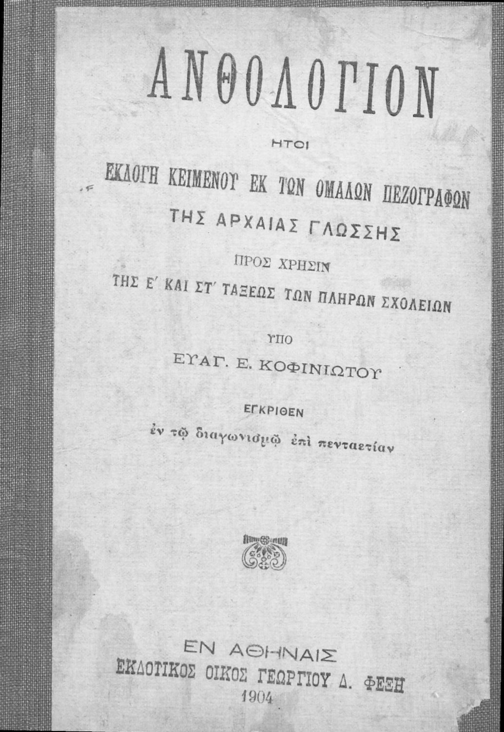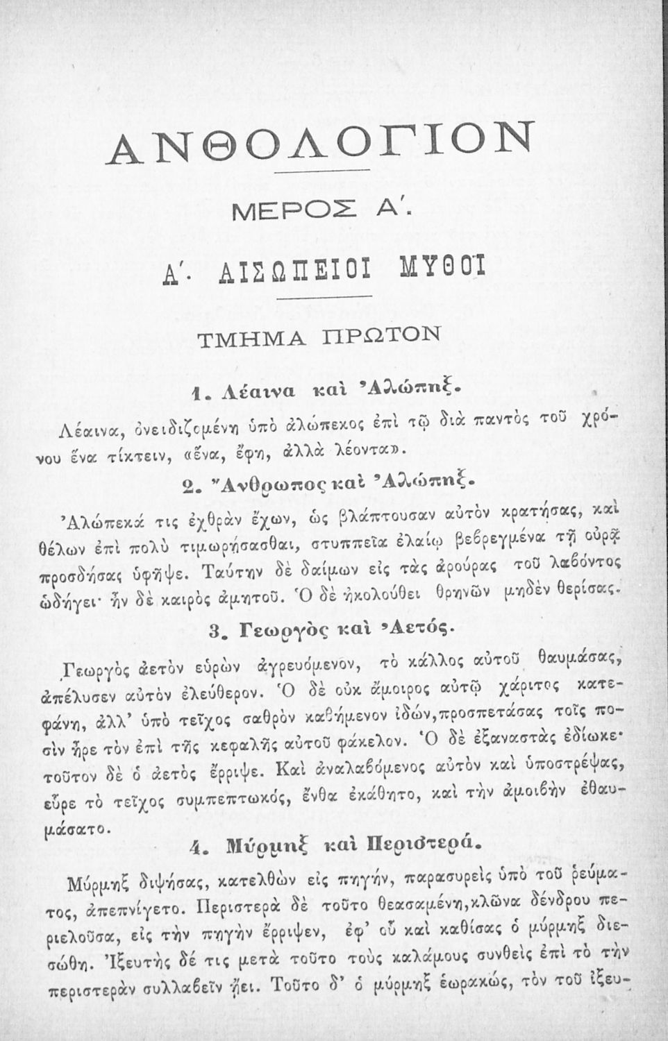 LDR 01282 2200205 4500 035 ## _a02-02259 040 ## _aΕλληνικό Λογοτεχνικό και Ιστορικό Αρχείο 041 ## _ael 100 ## _aΕυάγγελος Ε. Κοφινιώτης (επιμ.) 110 ## _a1904 ΚΟΦ 245 0# _aΑνθολόγιον ήτοι εκλογή κειμένου εκ των ομαλών πεζογράφων της αρχαίας γλώσσης προς χρήσιν της Ε΄ και ΣΤ΄ τάξεως των πλήρων σχολείων 260 ## _aΑθήνα _bΓεώργιος Δ. Φέξης _c1904 300 ## _a93 520 ## _aΣχολικό εγχειρίδιο Αρχαίων Ελληνικών Ε΄ και ΣΤ΄ Δημοτικού που περιλαμβάνει μύθους του Αισώπου, Θηβαϊκούς μύθους, αποφθέγματα και αποσπάσματα από την Κύρου Ανάβαση του Ξενοφώντα.. 521 ## _aΕ' Δημοτικού / ΣΤ' Δημοτικού 522 ## _aΕλλάδα 546 ## _aΑρχαία Ελληνικά 563 ## _aΣκληρό Εξώφυλλο 583 ## _a7409/22-5-1902 650 #4 _aΑρταξέρξης _aΔαρείος _aΗρακλής _aΚάδμος _aΦρίξος και Έλλη