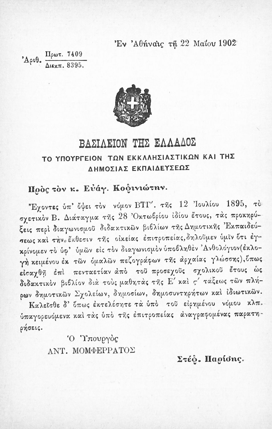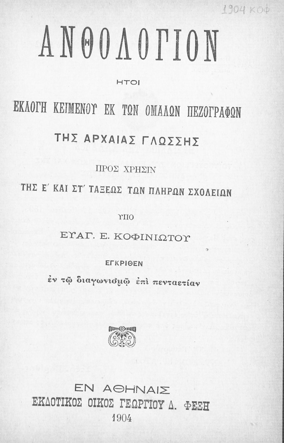 Εκδότης: Γεώργιος Δ. Φέξης Έτος έκδοσης: 1904 Τόπος έκδοσης: Αθήνα Υπουργική απόφαση / Σύμβαση: 7409/22-5-1902 |