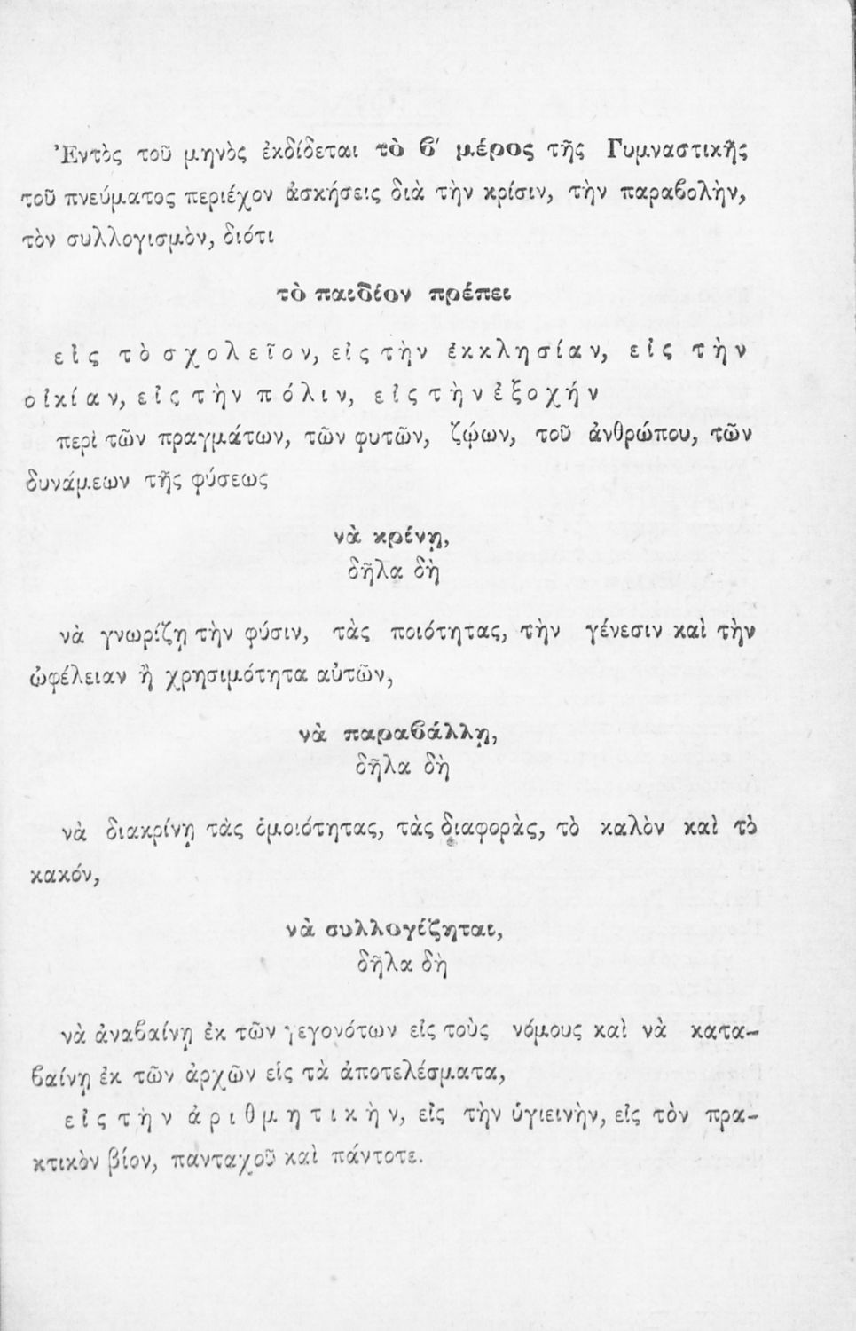 Τίτλος: Η γυμναστική του πνεύματος, (μέθοδος μητρική), μέρος πρώτον, γνώσις των πραγμάτων, φυτών και ζώων, υποδείγματα και αντικείμενα ασκήσεων προφορικών και εγγράφων δια τα πενταετή και οκταετή παιδία