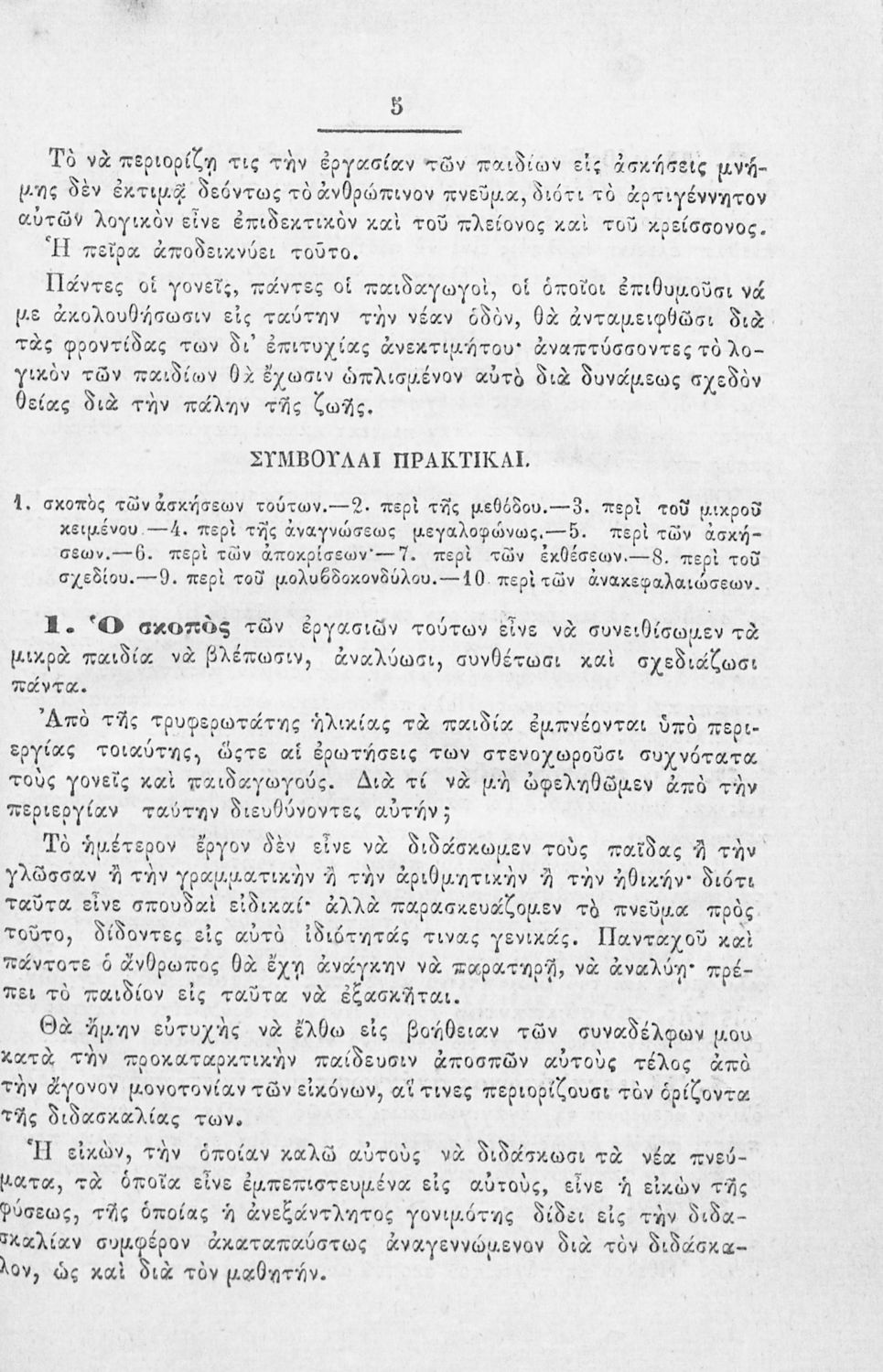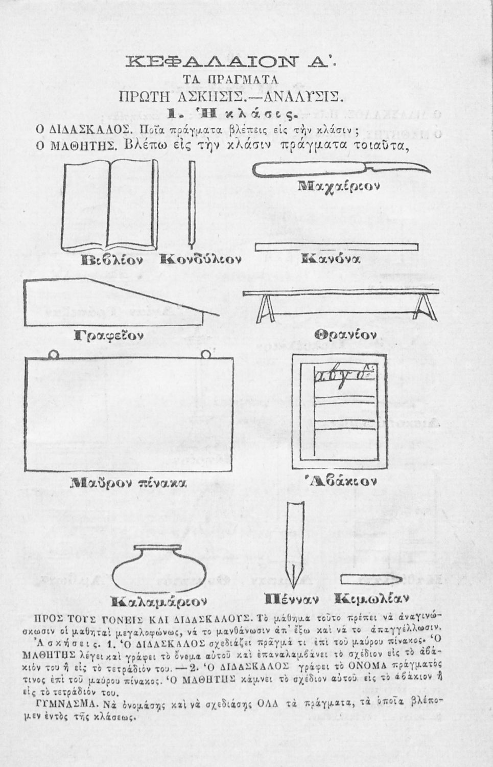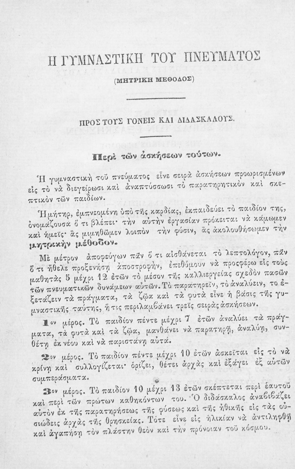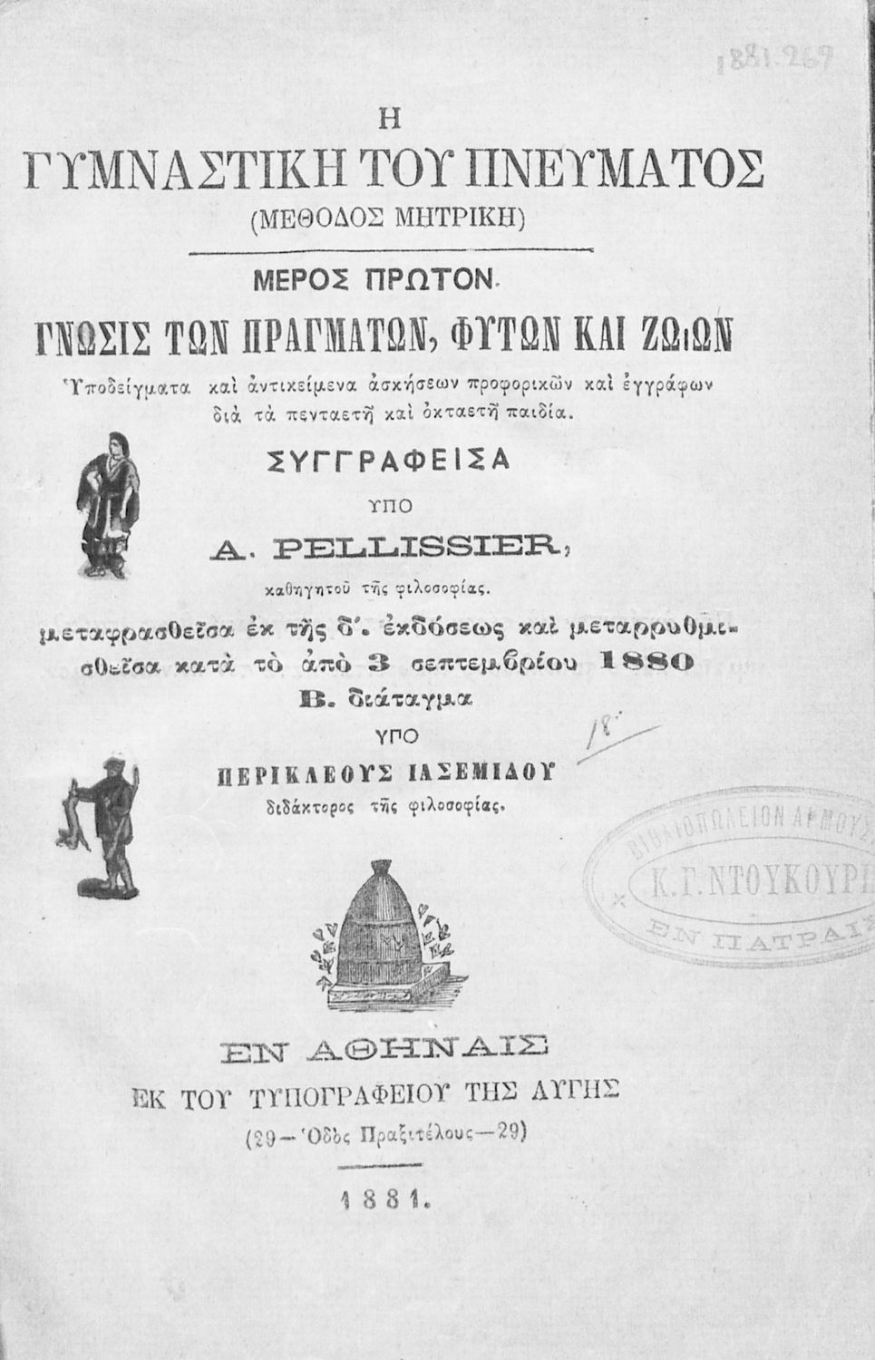Κωδικός αναγνώρισης: 02-02263 Τίτλος: Η γυμναστική του πνεύματος, (μέθοδος μητρική), μέρος πρώτον, γνώσις των πραγμάτων, φυτών και ζώων, υποδείγματα και αντικείμενα ασκήσεων προφορικών και εγγράφων δια τα πενταετή και οκταετή παιδία Συγγραφέας: A. Pellissier Μέγεθος και υπόστρωμα: Παιδαγωγικό βοήθημα, σκληρό εξώφυλλο, 110 σελίδες. Σκίτσα (ασπρόμαυρα). |