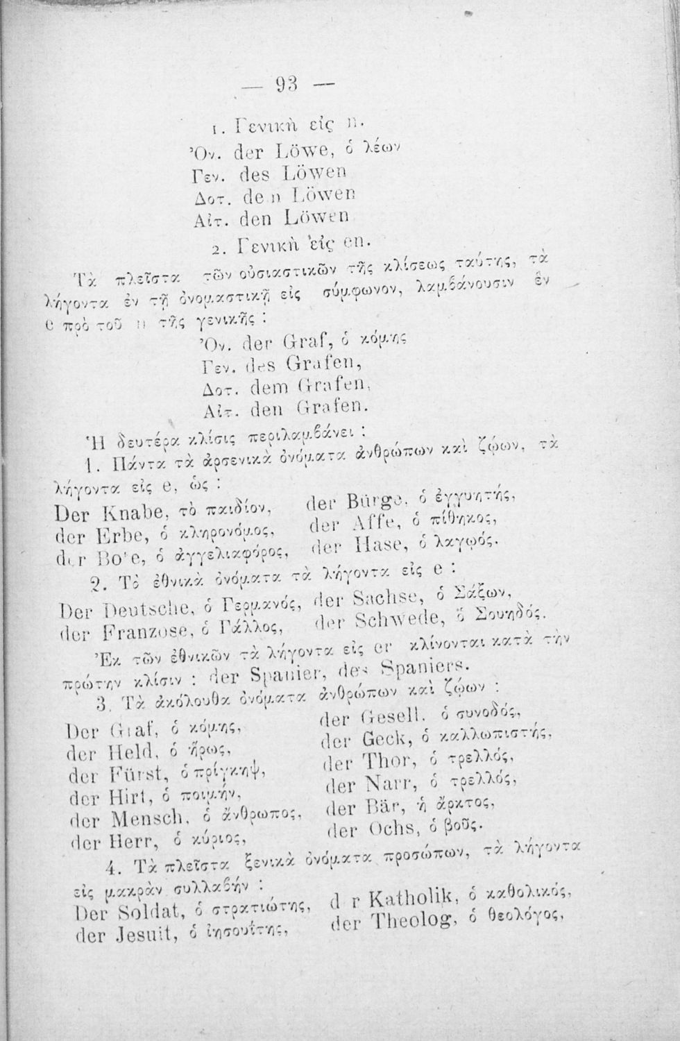 Μάθημα: Γερμανικά Γλώσσα: Γερμανικά / Καθαρεύουσα Παρουσίαση περιεχομένου: Πρόκειται για εγχειρίδιο που στόχο είχε την εκμάθηση των γραμματικών και συντακτικών φαινομένων της Γερμανικής γλώσσας με στόχο την ταχεία εκμάθησή της από Ελληνικό πληθυσμό. Φέρει λίγες προσωπικές σημειώσεις του μαθητή. |