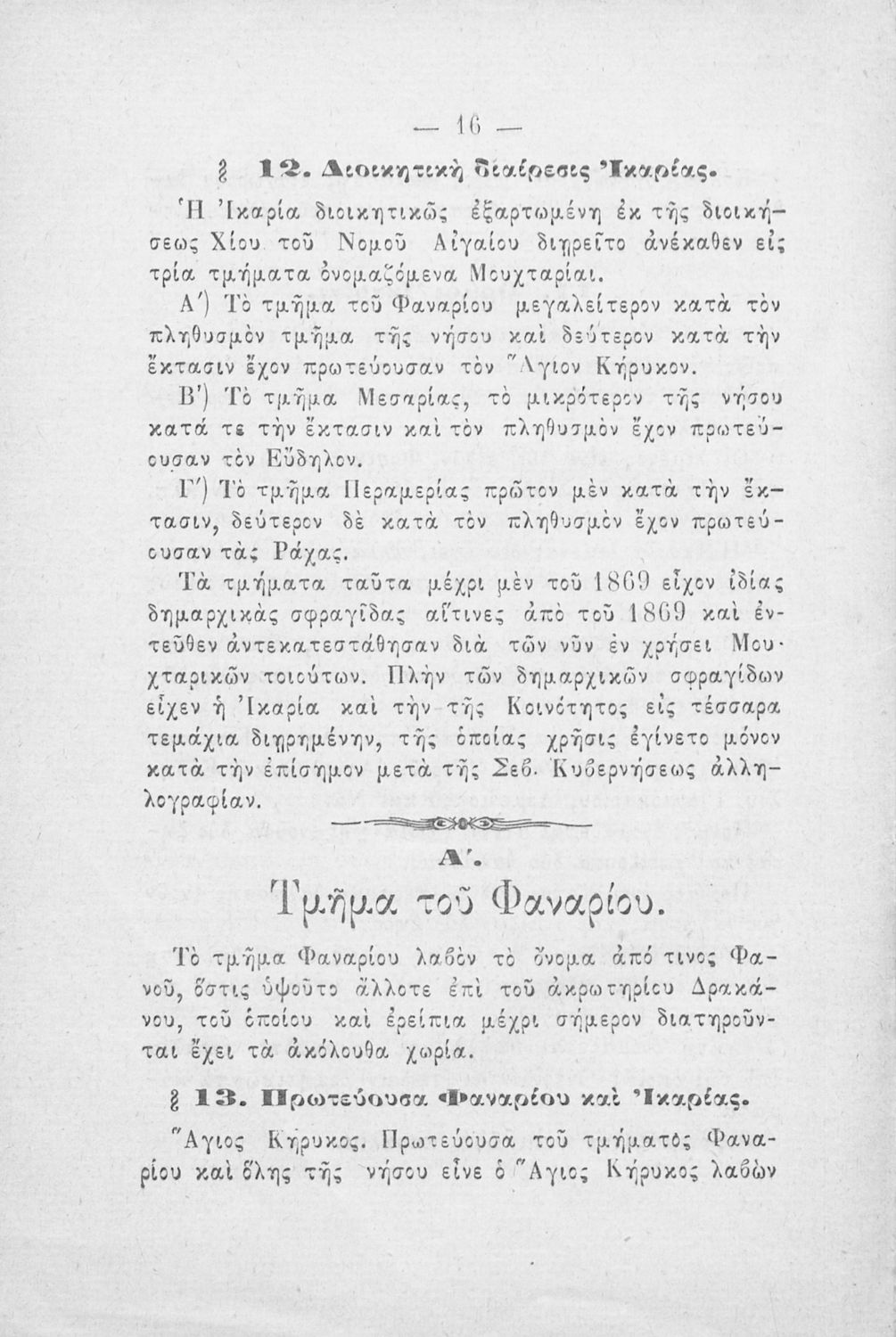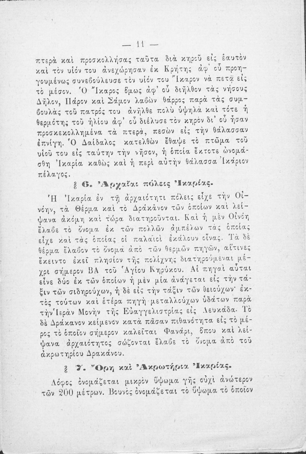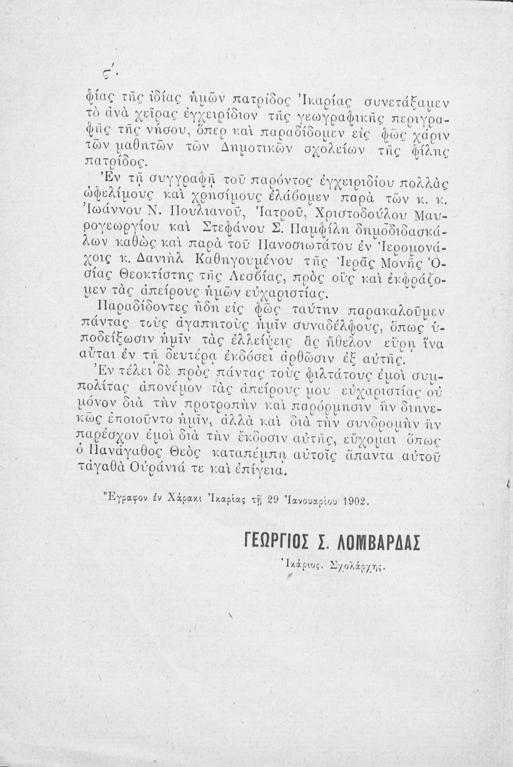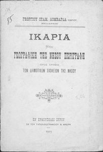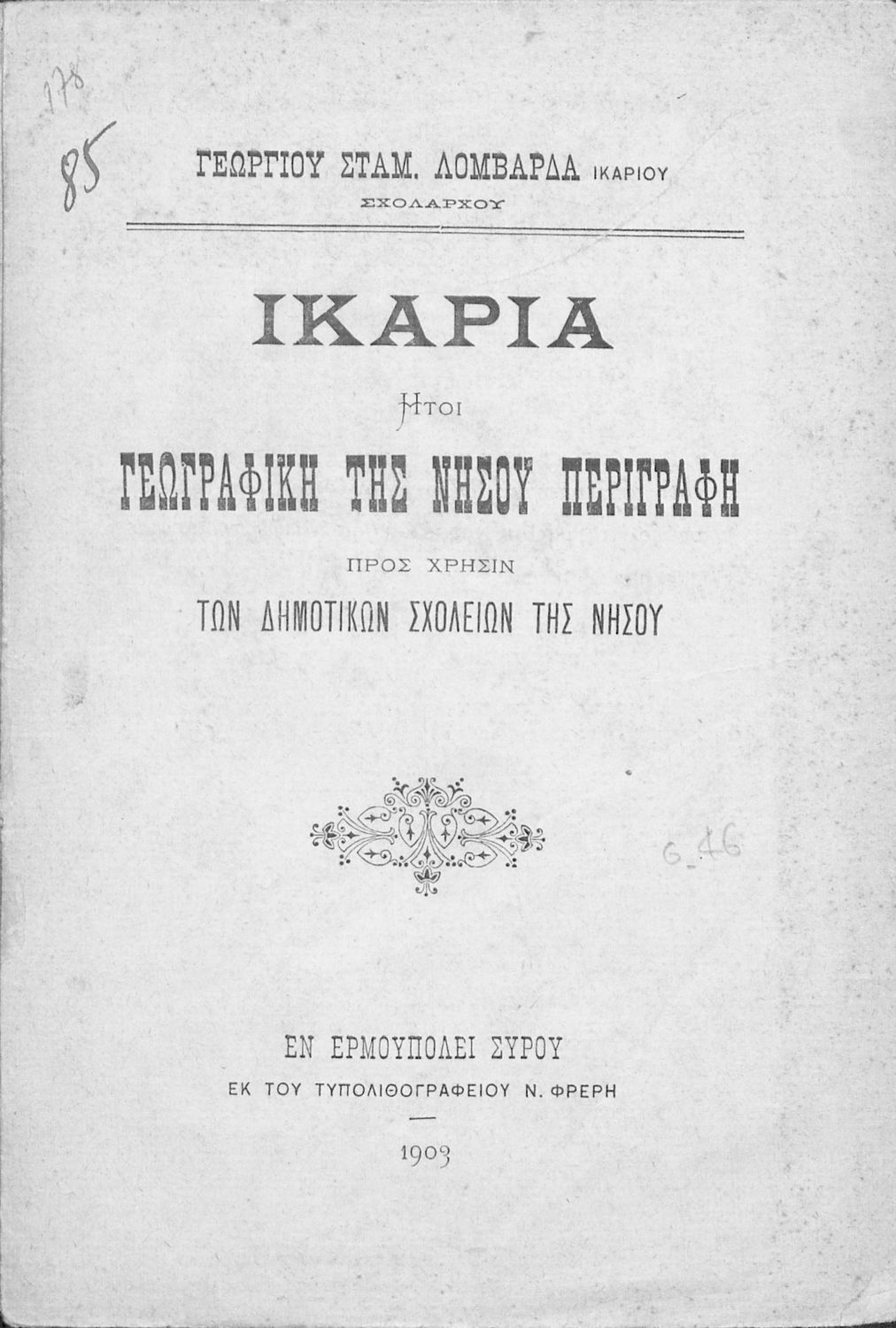 Κωδικός αναγνώρισης: 02-02280 Τίτλος: Ικαρία, ήτοι γεωγραφική της νήσου περιγραφή, προς χρήσιν των Δημοτικών σχολείων της νήσου Συγγραφέας: Γεώργιος Σταμ. Λομβαρδάς Μέγεθος και υπόστρωμα: Σχολικό εγχειρίδιο, μαλακό εξώφυλλο, 50 σελίδες. |
