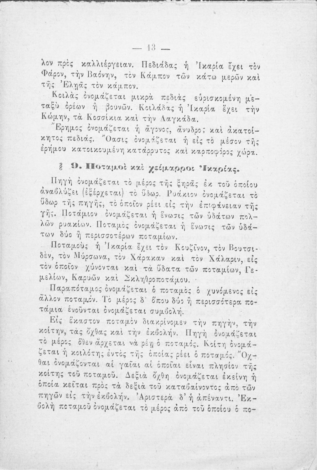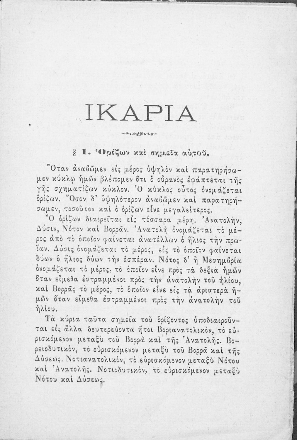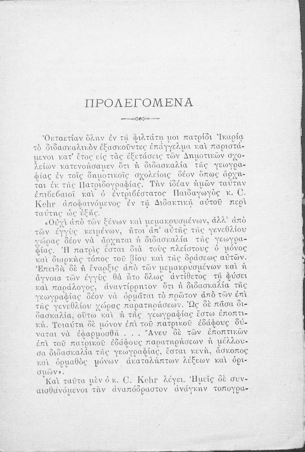 Βαθμίδα εκπαίδευσης: Πρωτοβάθμια Μάθημα: Γεωγραφία Γλώσσα: Καθαρεύουσα Παρουσίαση περιεχομένου: Σχολικό εγχειρίδιο Γεωγραφίας που περιέχει εισαγωγή στη φυσική γεωγραφία και παρουσιάζει την Ικαρία από γεωφυσική και οικονομική άποψη. |