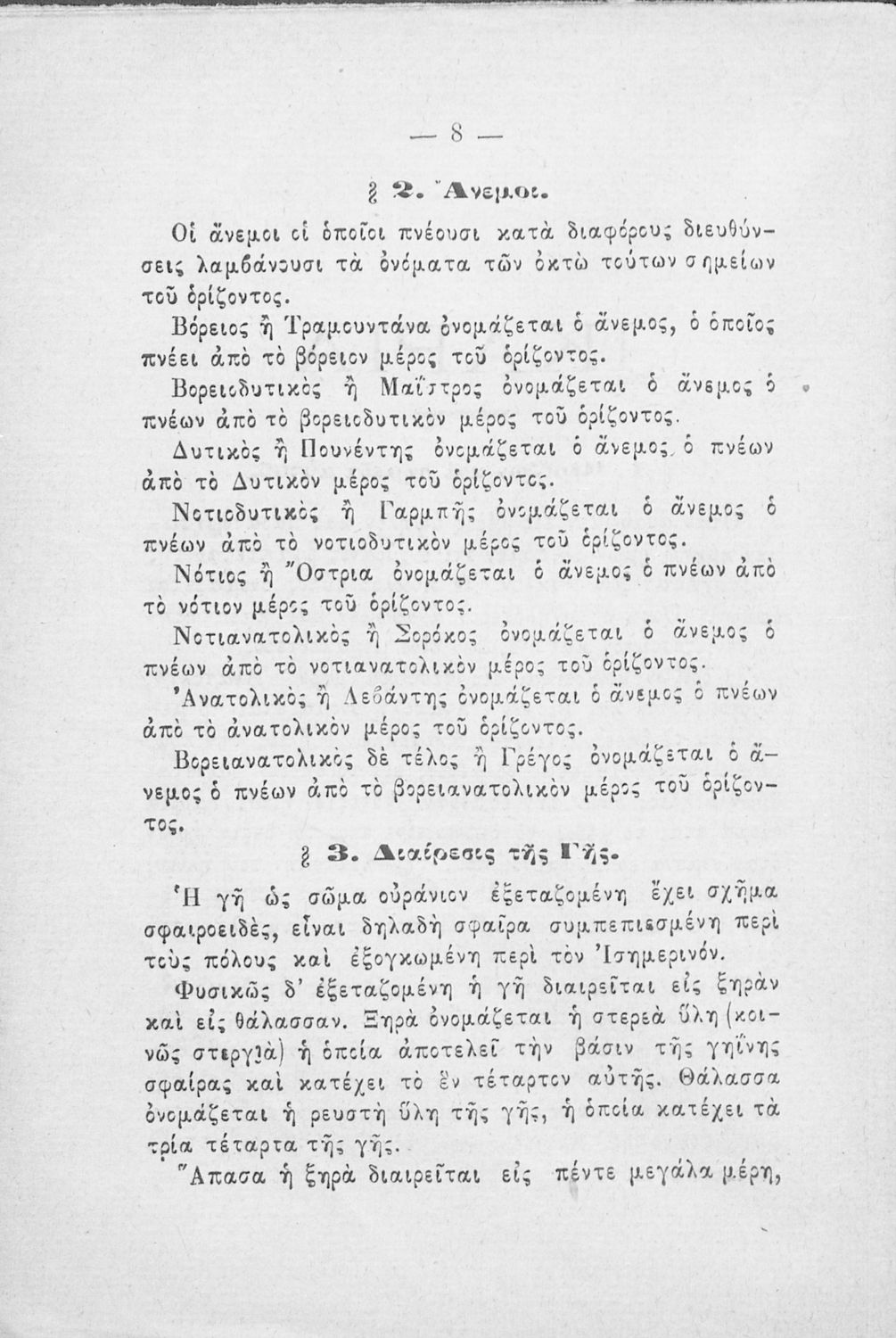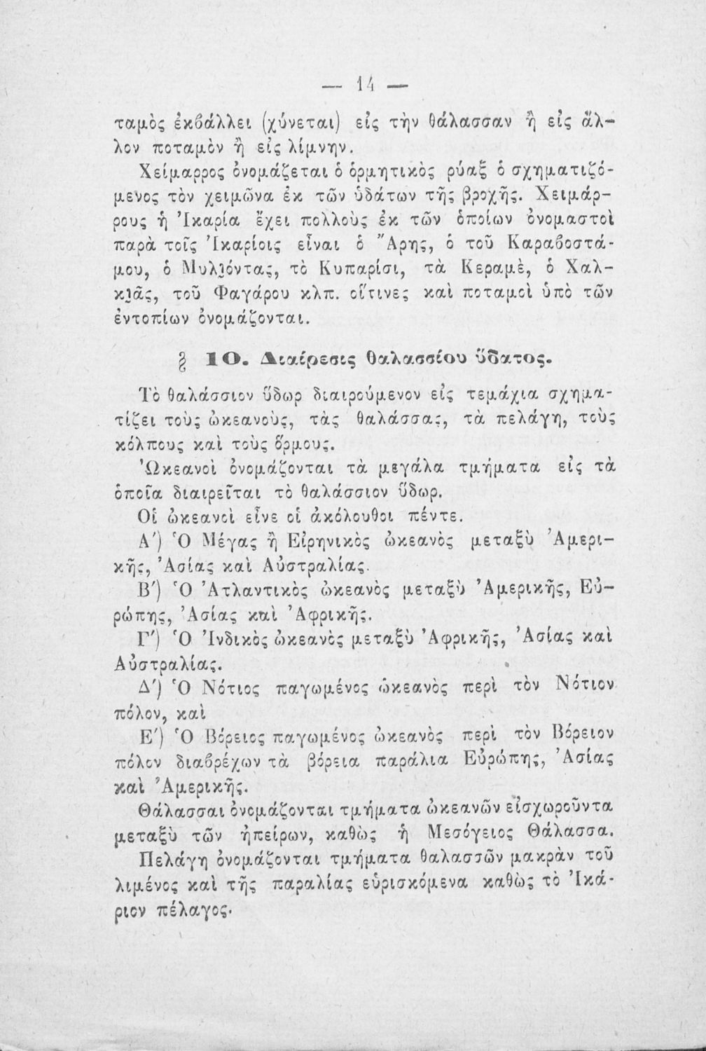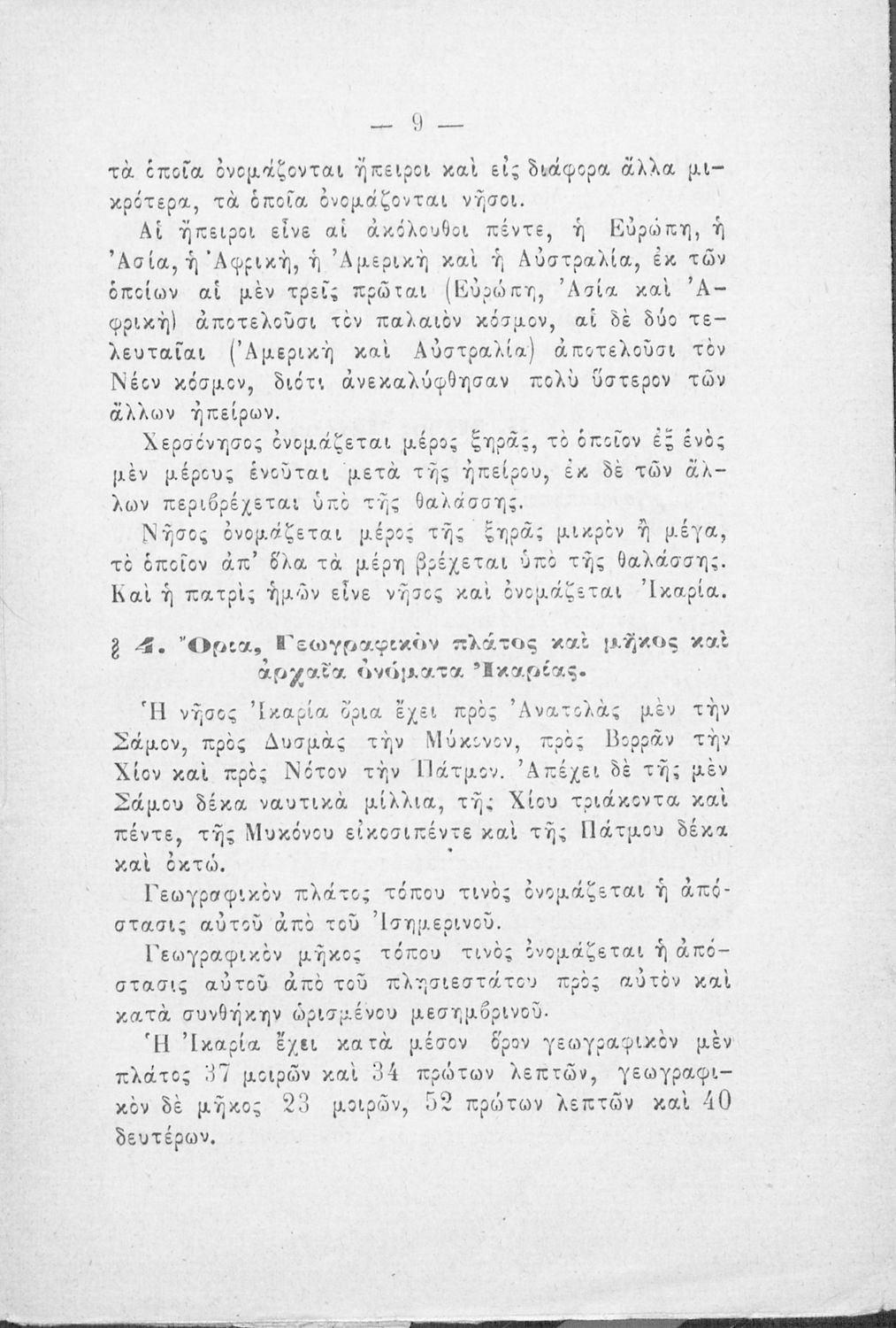 Βαθμίδα εκπαίδευσης: Πρωτοβάθμια Μάθημα: Γεωγραφία Γλώσσα: Καθαρεύουσα Παρουσίαση περιεχομένου: Σχολικό εγχειρίδιο Γεωγραφίας που περιέχει εισαγωγή στη φυσική γεωγραφία και παρουσιάζει την Ικαρία από γεωφυσική και οικονομική άποψη. |