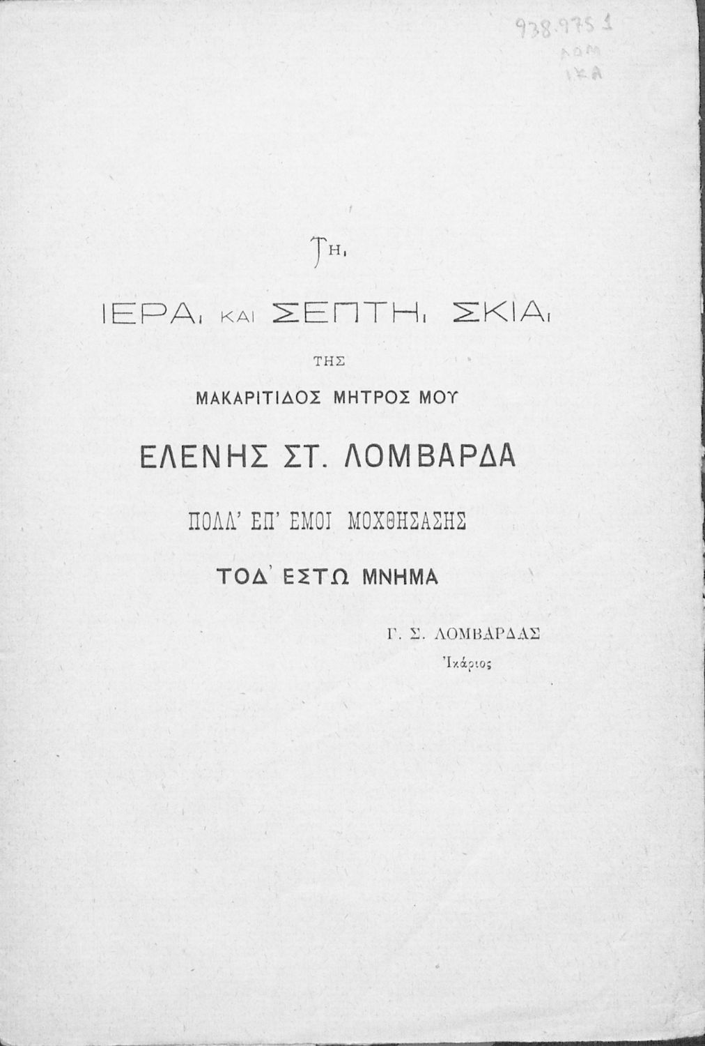 Εντοπισμός πρωτοτύπου: Ελληνικό Λογοτεχνικό και Ιστορικό Αρχείο Κωδικός βιβλιοθήκης: 938.975 1 |