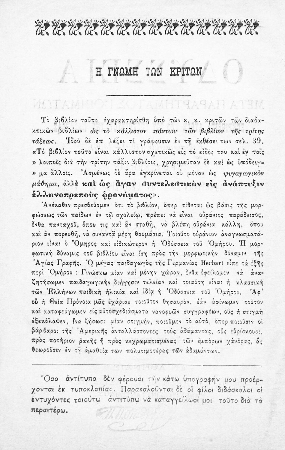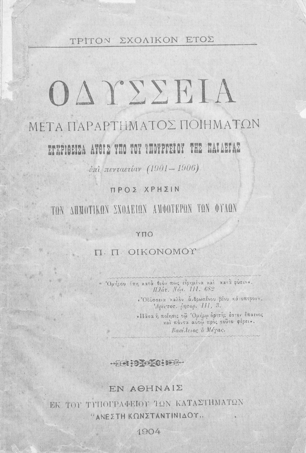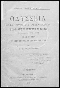 Βαθμίδα εκπαίδευσης: Πρωτοβάθμια Τάξη: Γ' Δημοτικού Μάθημα: Αρχαία Ελληνικά Γλώσσα: Καθαρεύουσα Παρουσίαση περιεχομένου: Σχολικό εγχειρίδιο Γλώσσας για τα Δημοτικά και τα Παρθεναγωγεία που εξιστορεί τις περιπέτειες του Οδυσσέα. Περιέχει και ποιήματα εμπνευσμένα από την ελληνική μυθολογία, την σύγχρονη ελληνική ιστορία, την πατρίδα, τη θρησκεία και τη φύση. |