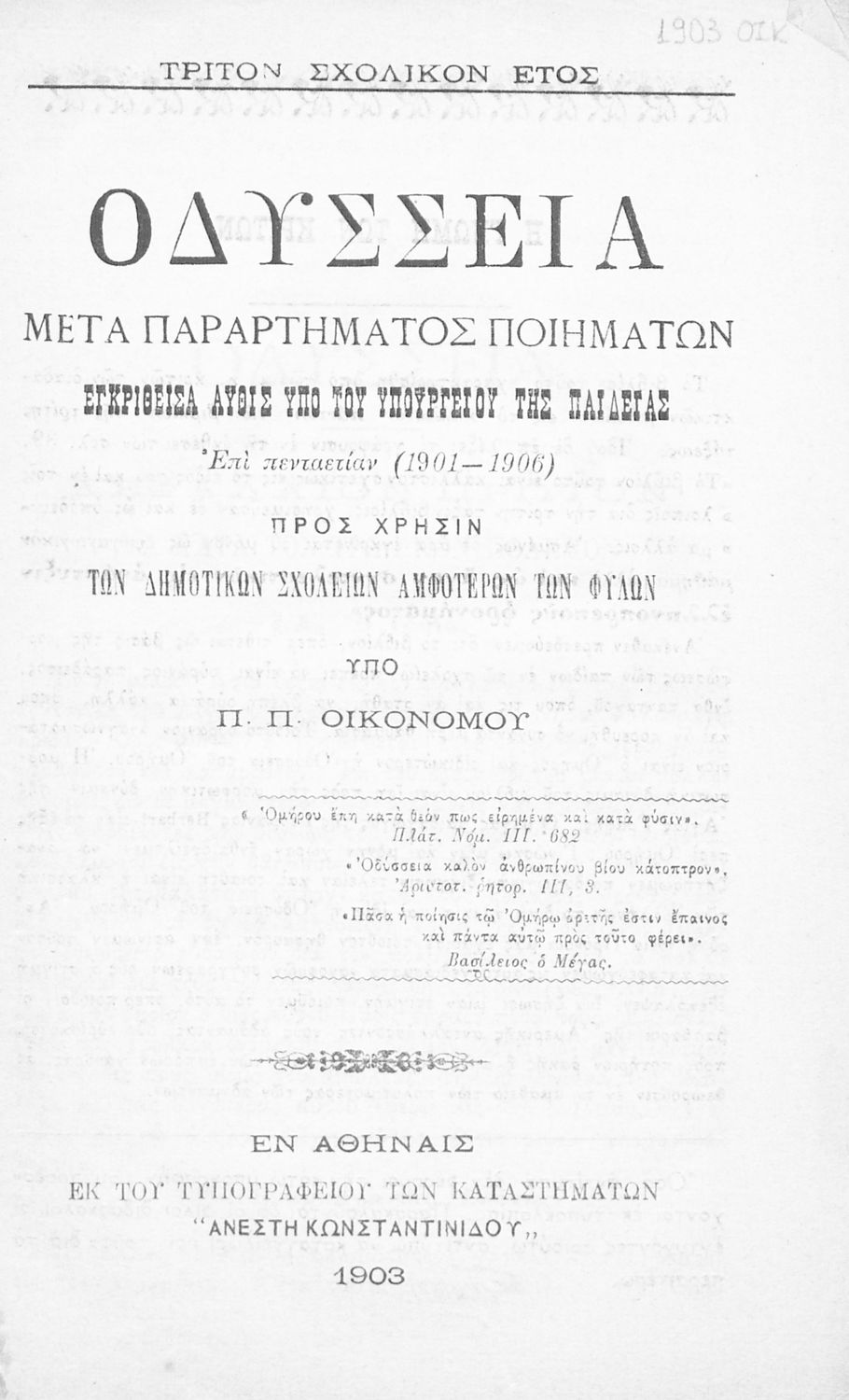 Εκδότης: Τυπογραφείο: Ανέστης Κωνσταντινίδης Έτος έκδοσης: 1903 Τόπος έκδοσης: Αθήνα Υπουργική απόφαση / Σύμβαση: 7704/16-5-1901 |