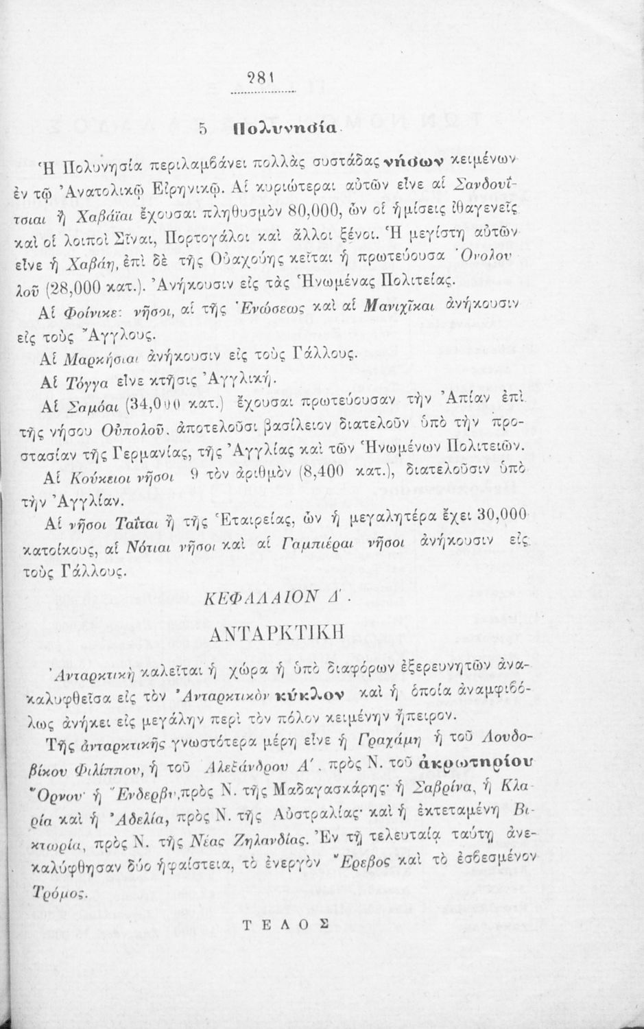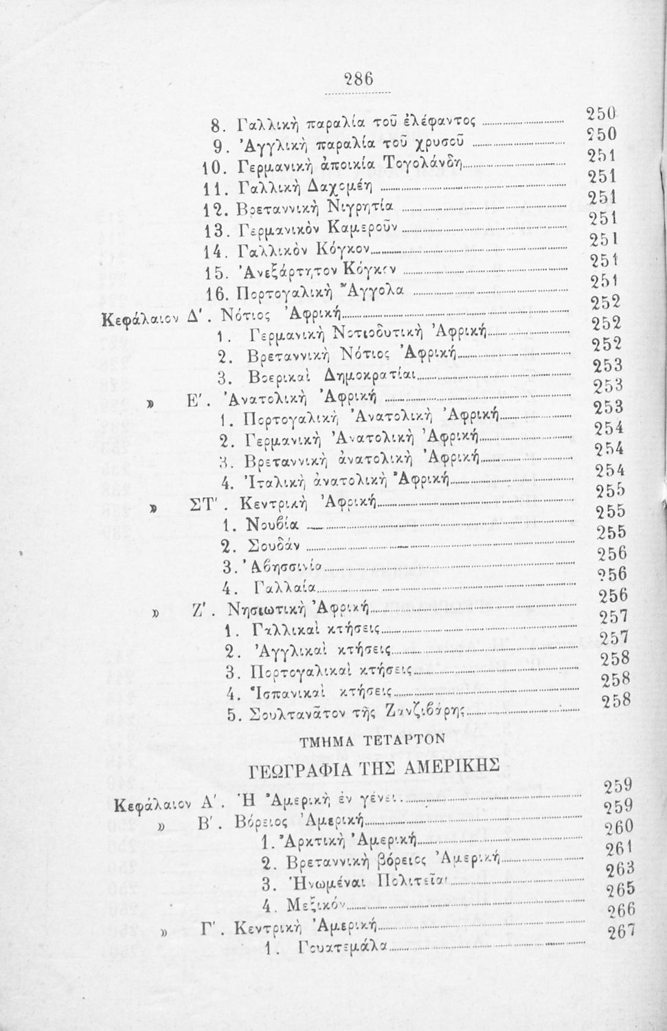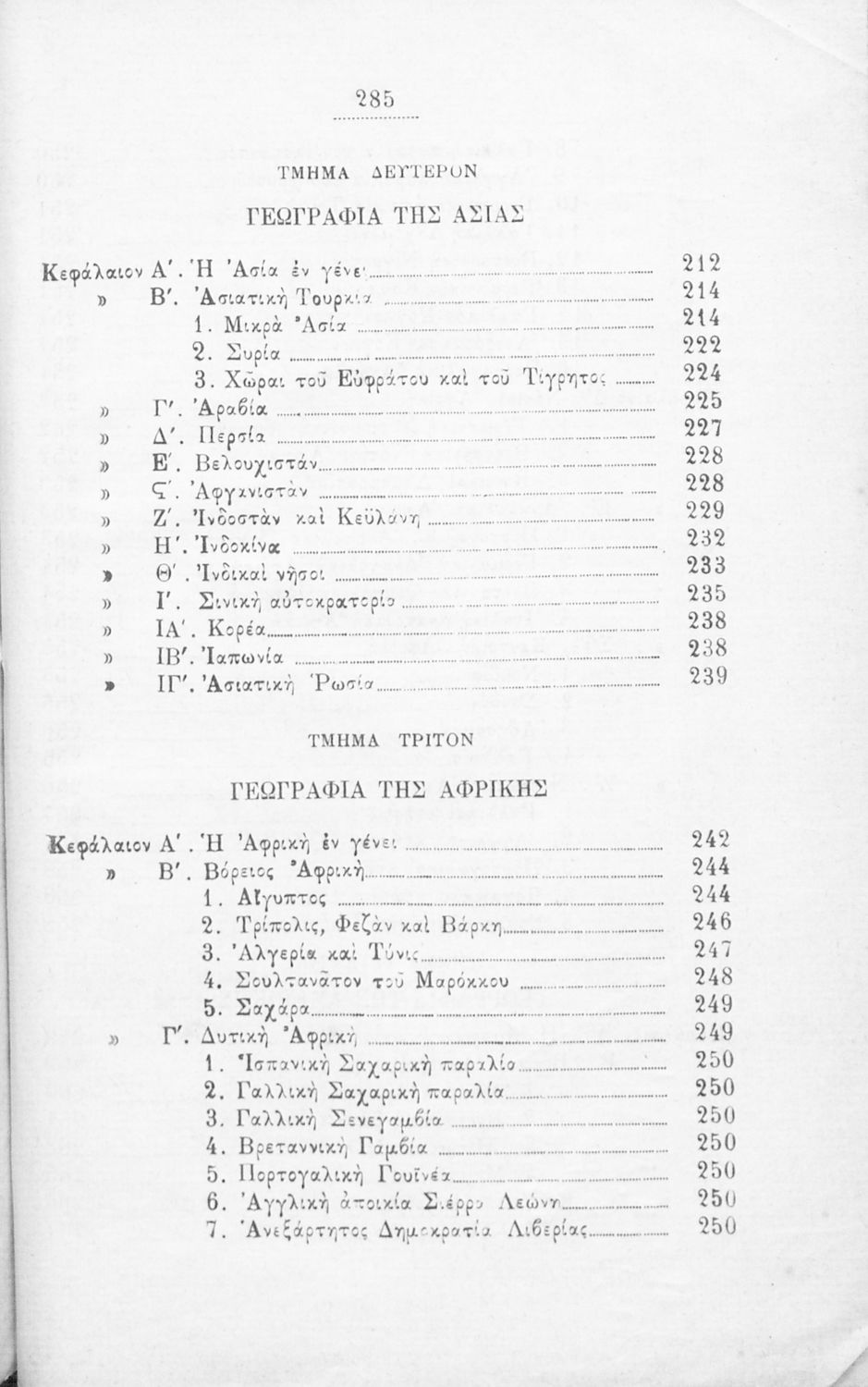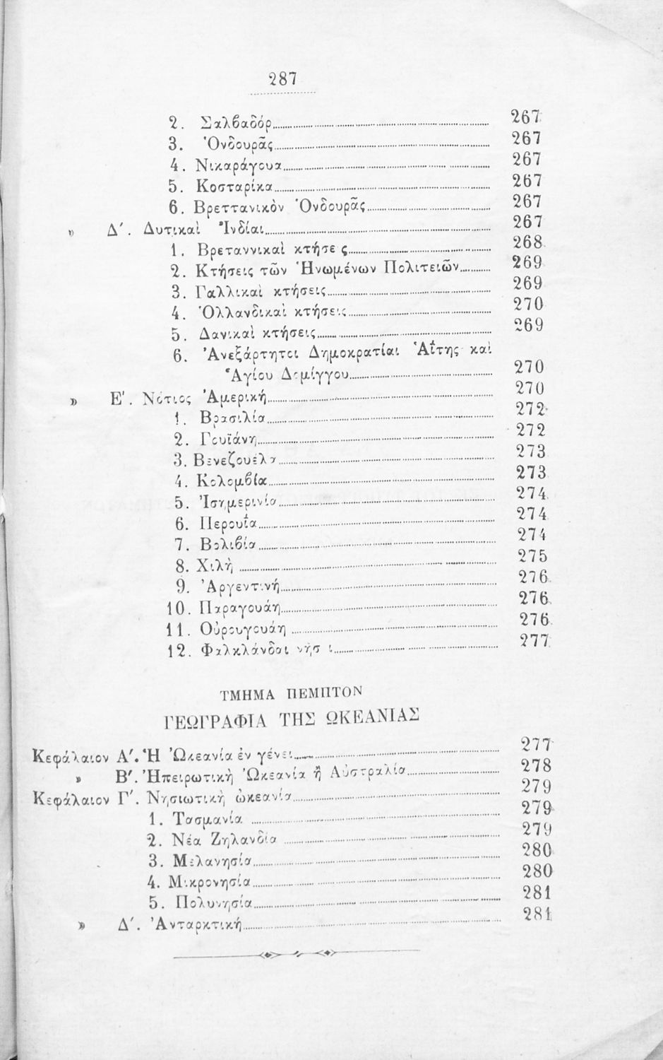 Σχολικό εγχειρίδιο Γεωγραφίας για τα Ελληνικά Σχολεία και τα Παρθεναγωγεία που αναλύει τη γεωμορφολογία της Γης και παρουσιάζει, διεξοδικά, κάποιους από τους νομούς της Ελλάδας και, συνοπτικά, τα γενικά χαρακτηριστικά των 5 ηπείρων.