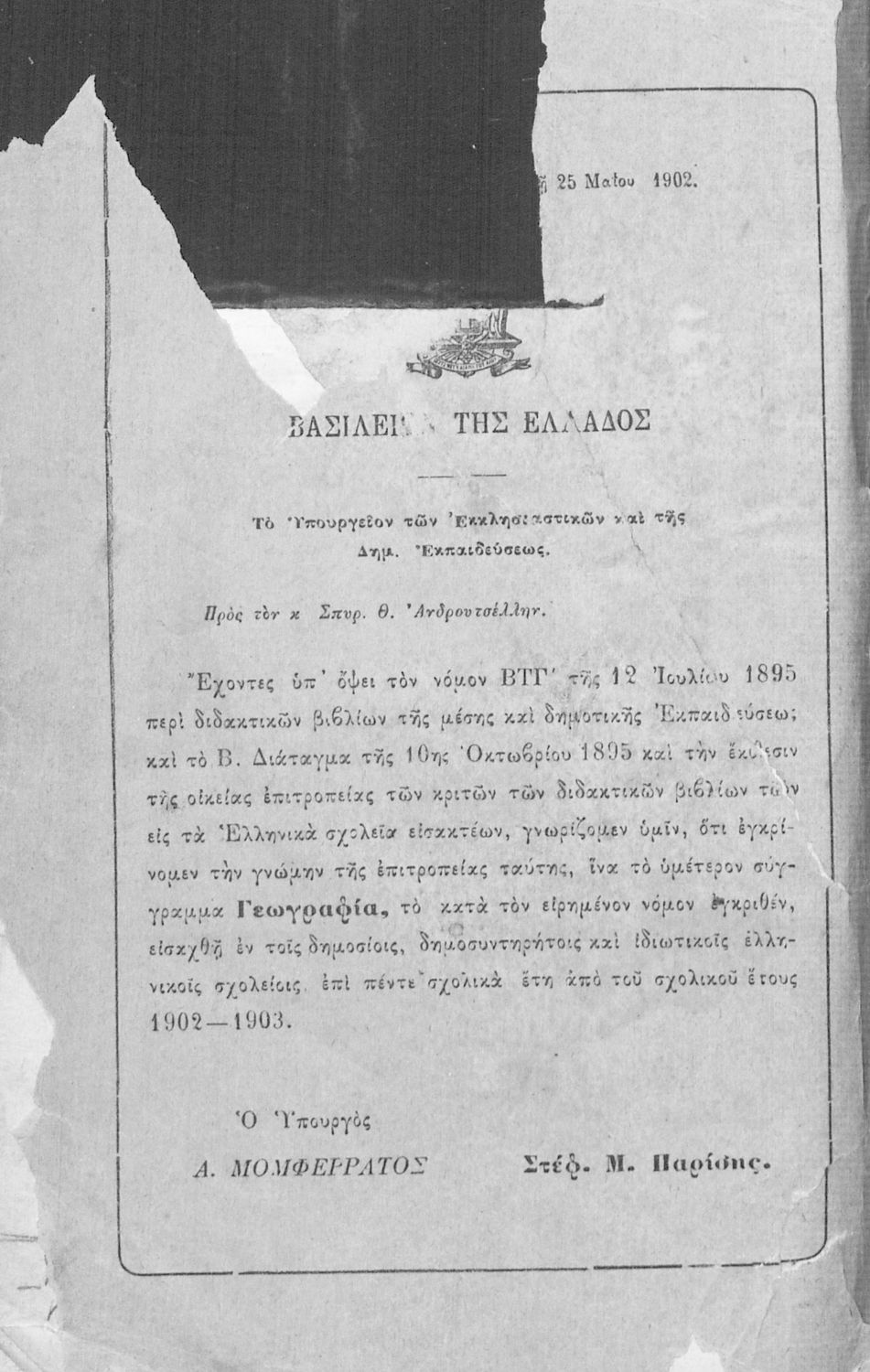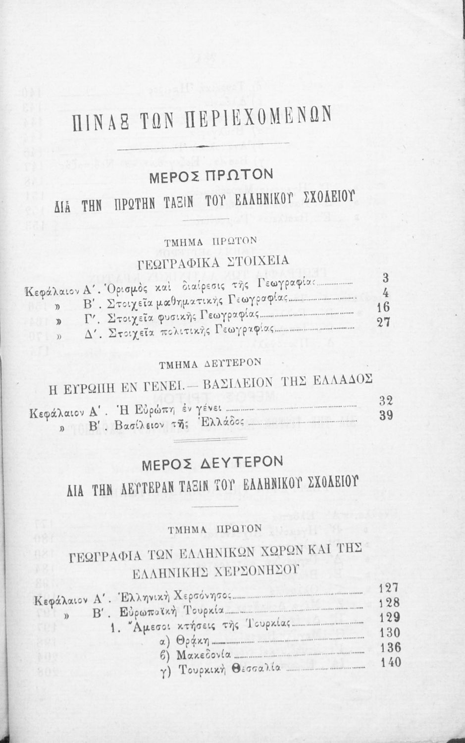 Σχολικό εγχειρίδιο Γεωγραφίας για τα Ελληνικά Σχολεία και Παρθεναγωγεία που περιλαμβάνει εισαγωγή στη φυσική, πολιτική και οικονομική γεωγραφία και μια γενική επισκόπηση της Ελλάδας και της Ευρωπαϊκής Τουρκίας