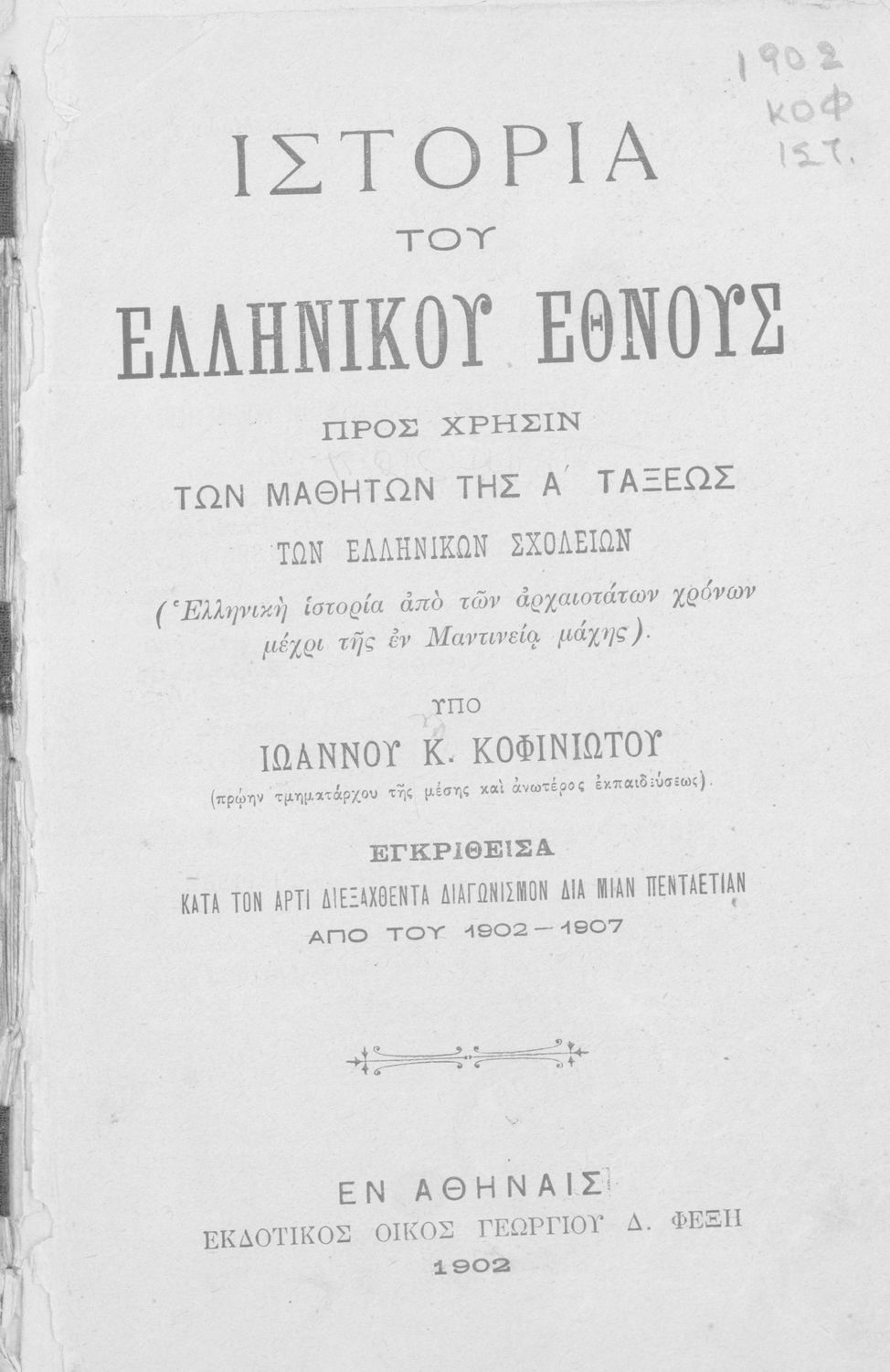 Κωδικός αναγνώρισης: 02-02296 Τίτλος: Ιστορία του ελληνικού έθνους προς χρήσιν των μαθητών της Α΄ τάξεως των Ελληνικών Σχολείων (ελληνική ιστορία από των αρχαιοτάτων χρόνων μέχρι της εν Μαντινεία μάχης) Συγγραφέας: Ιωάννης Κ. Κοφινιώτης Μέγεθος και υπόστρωμα: Σχολικό εγχειρίδιο, σκληρό εξώφυλλο, 150 σελίδες. Σκίτσα (ασπρόμαυρα), χάρτες (ασπρόμαυροι). |