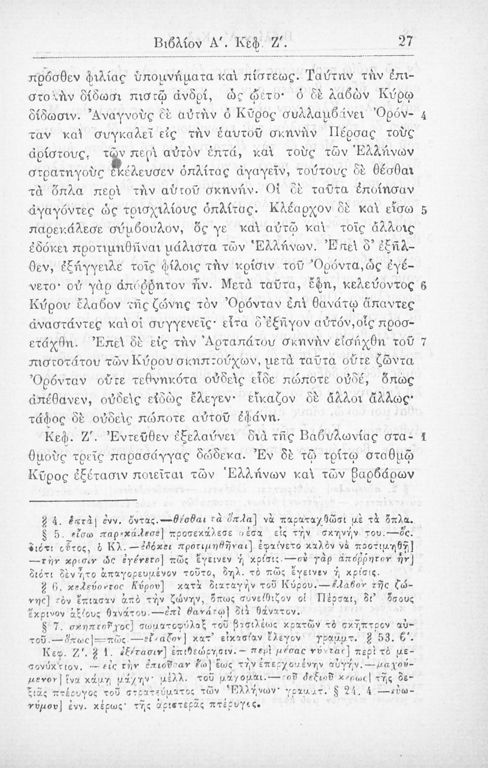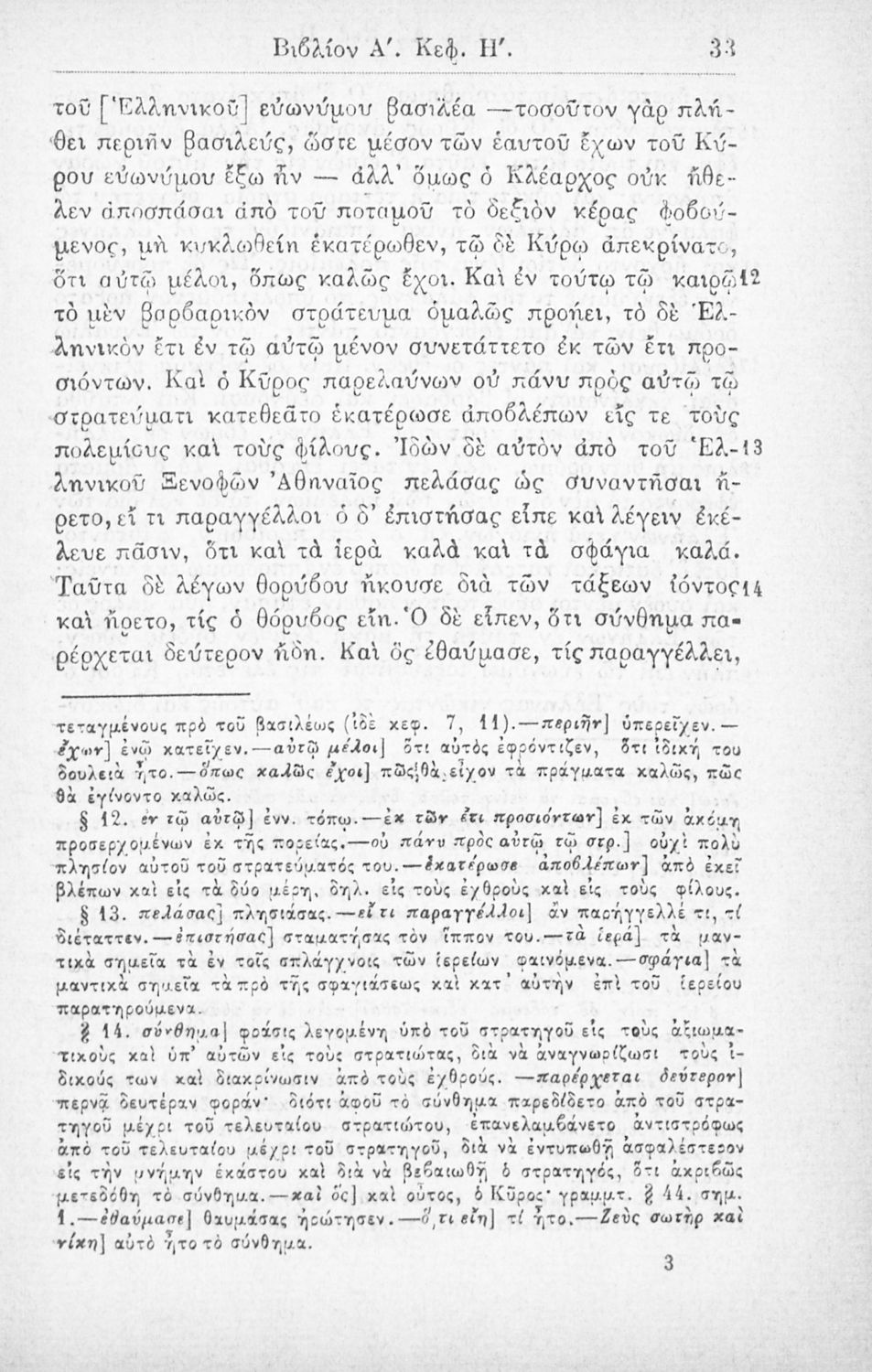 Σχολικό εγχειρίδιο Αρχαίων Ελληνικών για τα Ελληνικά Σχολεία και Παρθεναγωγεία που περιλαμβάνει αποσπάσματα από τα έργα του Ξενοφώντα Ελληνικά και Κύρου Παιδεία και λεξικολογικές παρατηρήσεις.