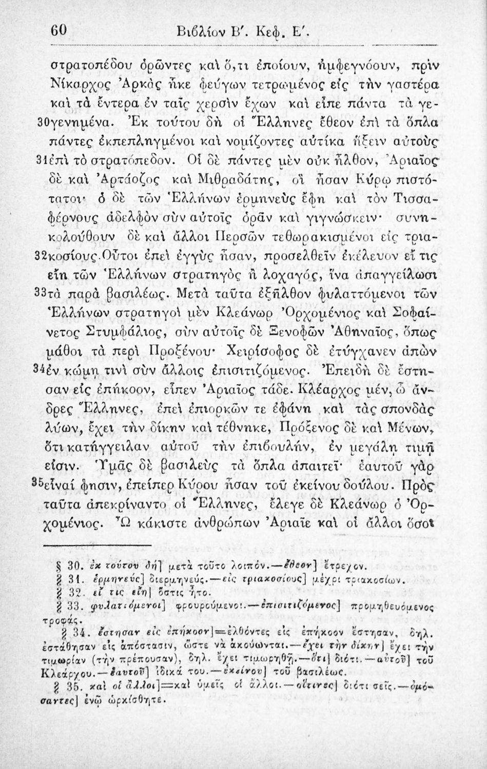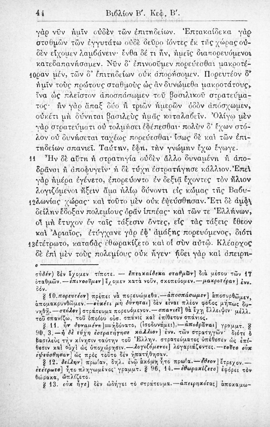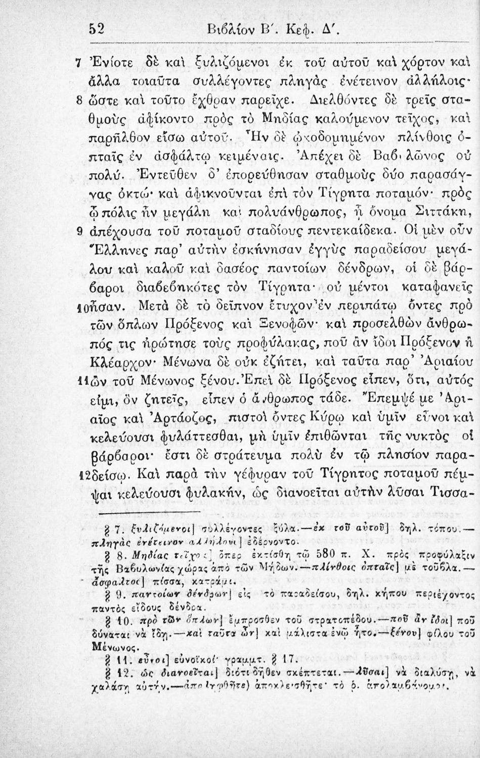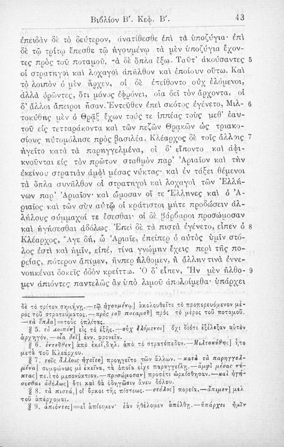 Σχολικό εγχειρίδιο Αρχαίων Ελληνικών για τα Ελληνικά Σχολεία και Παρθεναγωγεία που περιλαμβάνει αποσπάσματα από το έργο του Ξενοφώντα Κύρου Ανάβασις, και λεξικογραφικές παρατηρήσεις.