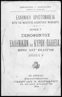 Τίτλος: Ελληνική χρηστομάθεια περιέχουσα Ξενοφώντος Κύρου Ανάβασιν μέρη κατ΄ εκλογήν εκ των τεσσάρων πρώτων βιβλίων κατά το πρόγραμμα και τας επισήμους οδηγίας του Υπουργείου προς χρήσιν των Ελληνικών Σχολείων και Παρθεναγωγείων τόμος Β΄